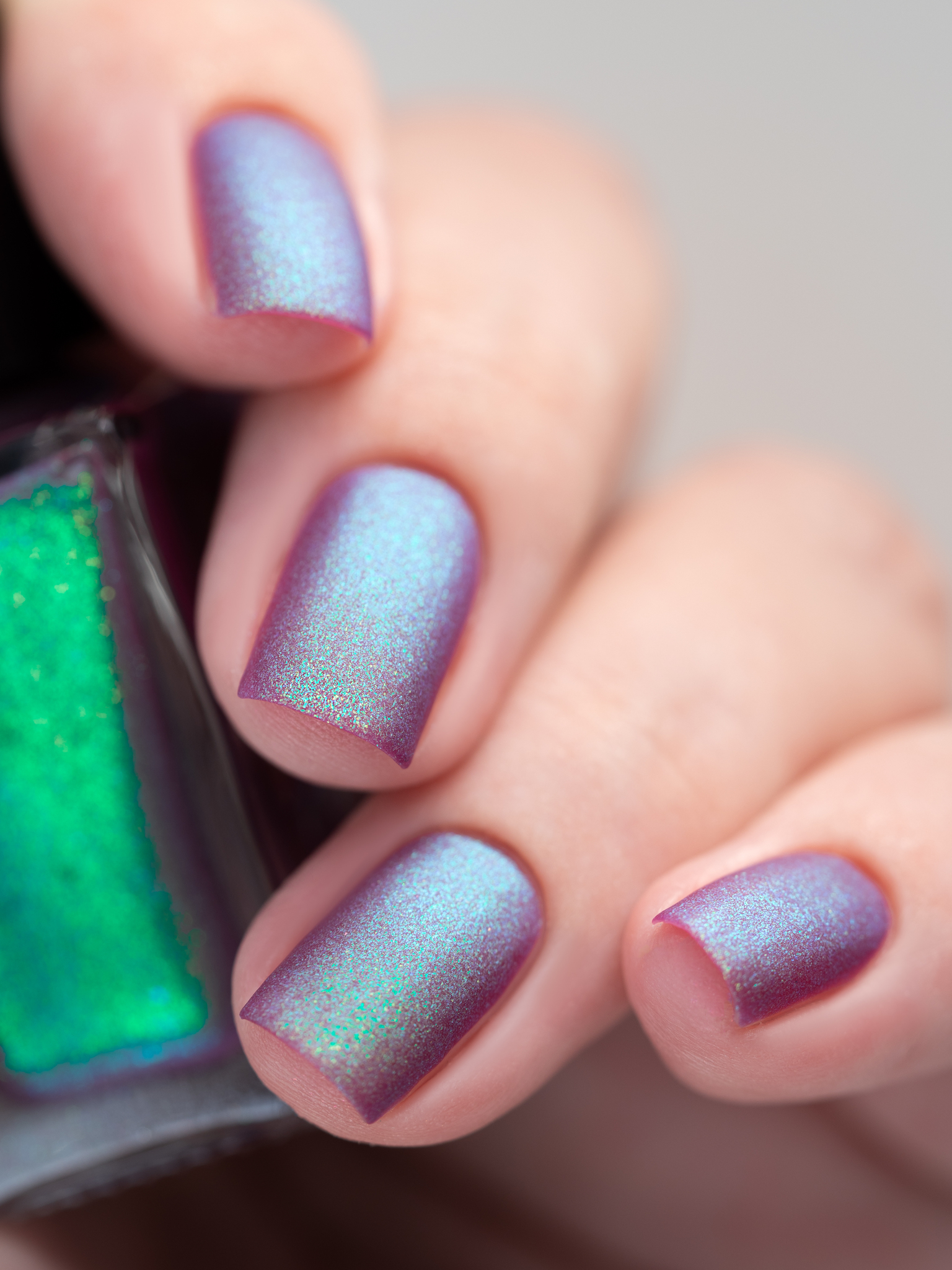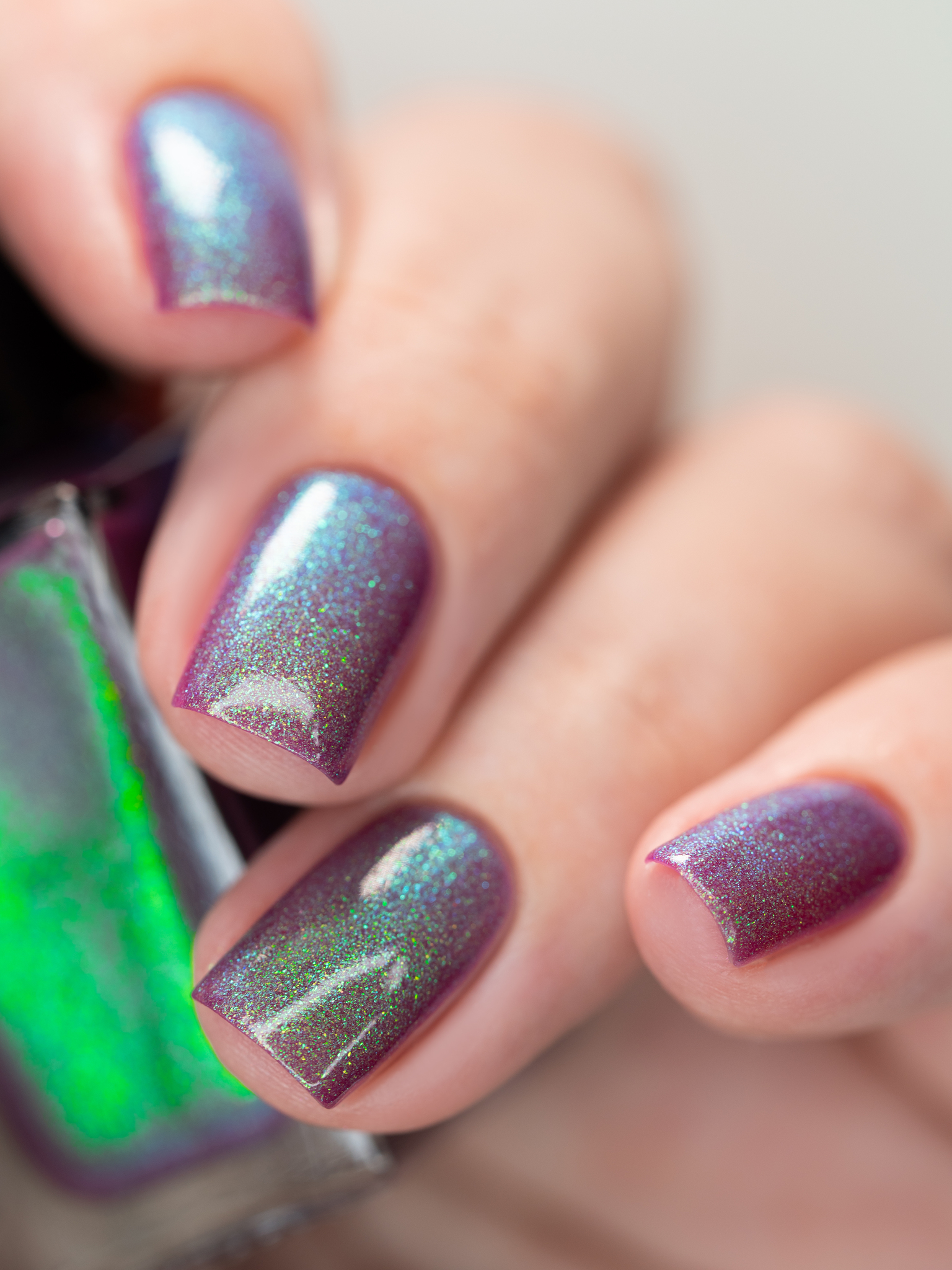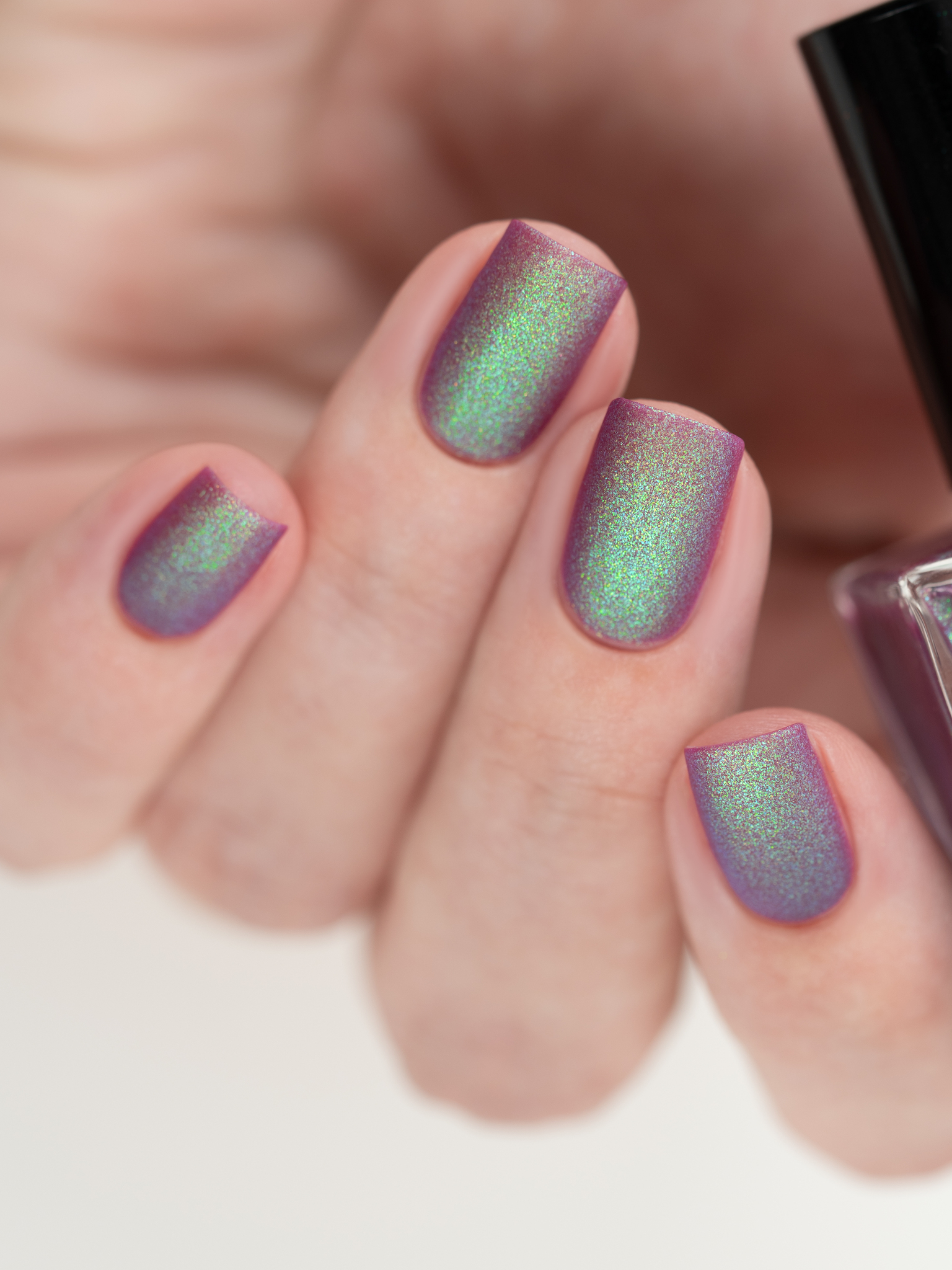 Матовая фиолетово-бордовая база с крупным зелёным шиммером