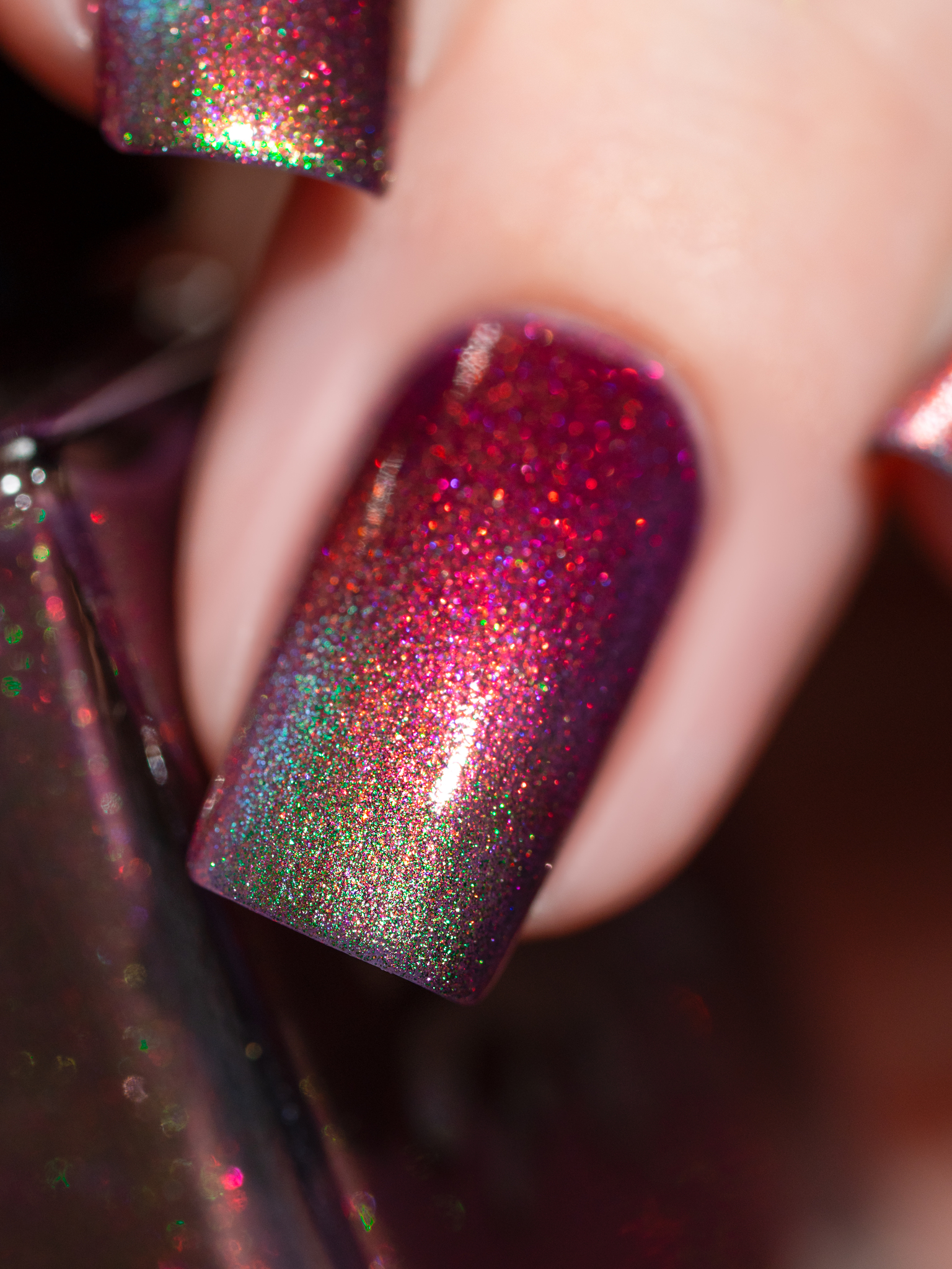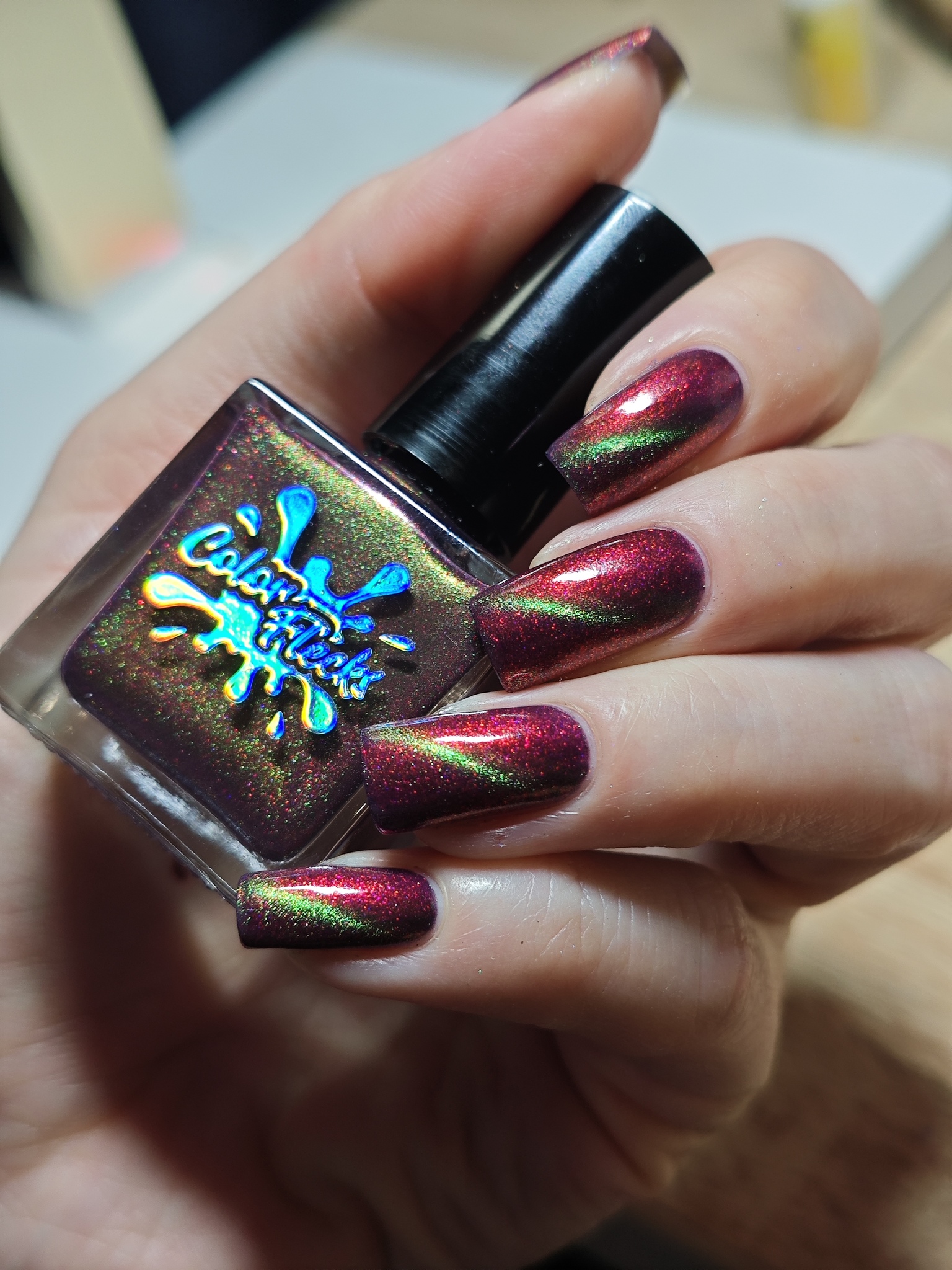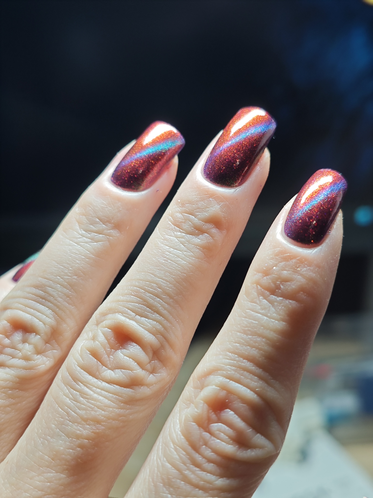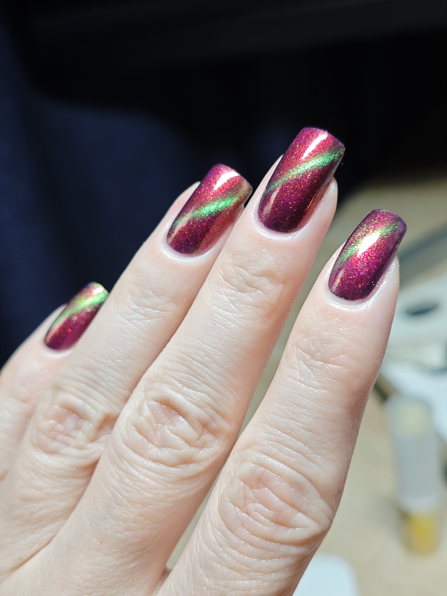 Зелено-сине-фиолетовый мультихромный магнит с миксом красно-оранжевого и красно-розового шиммера в фиолетовой базе