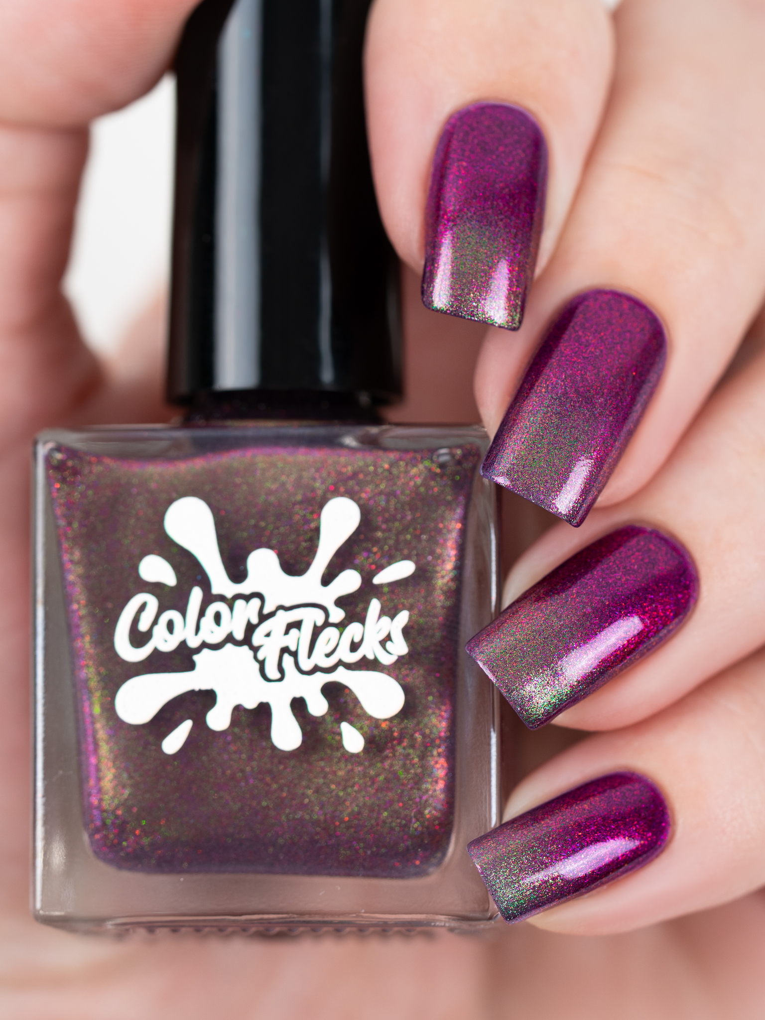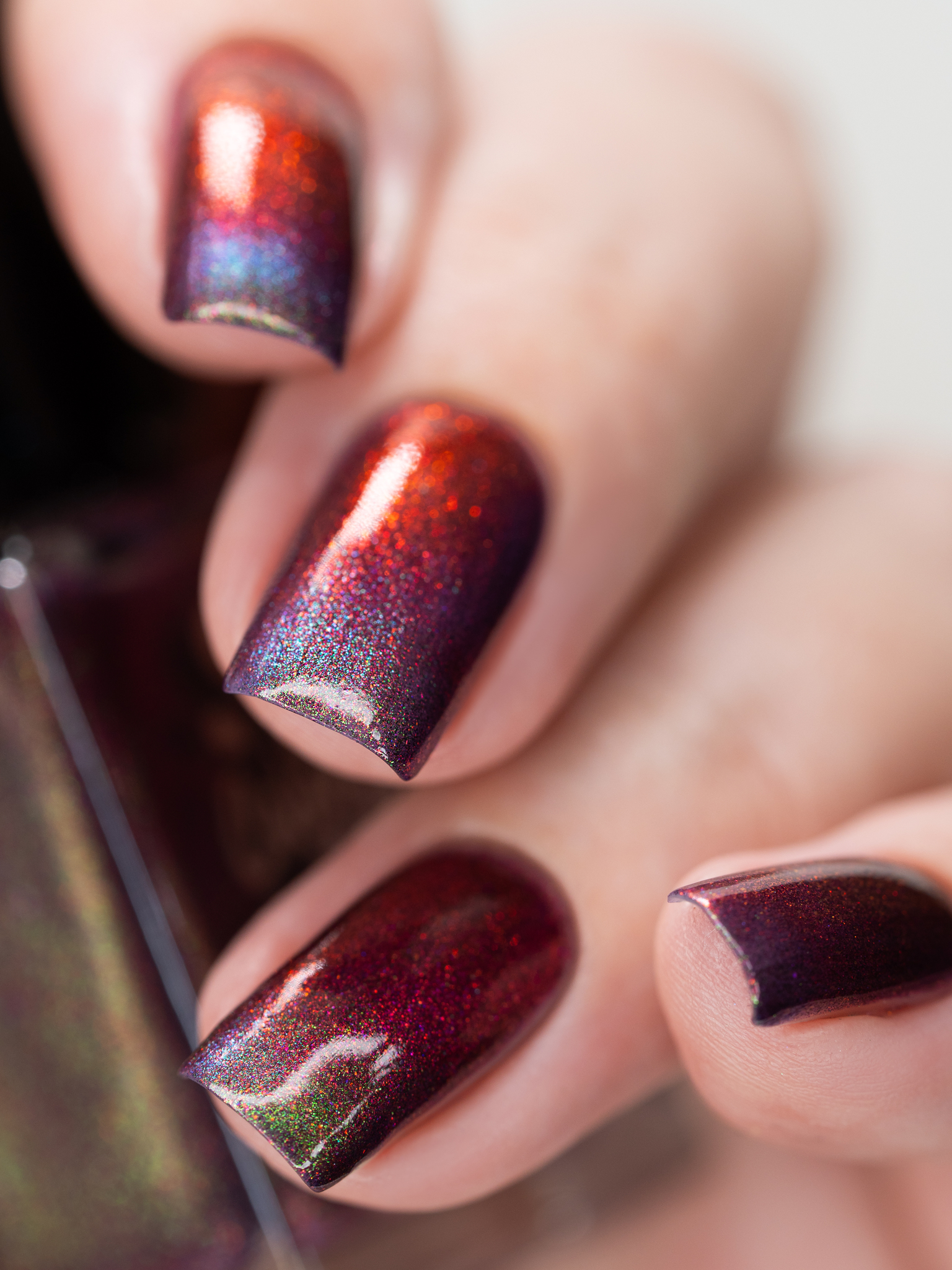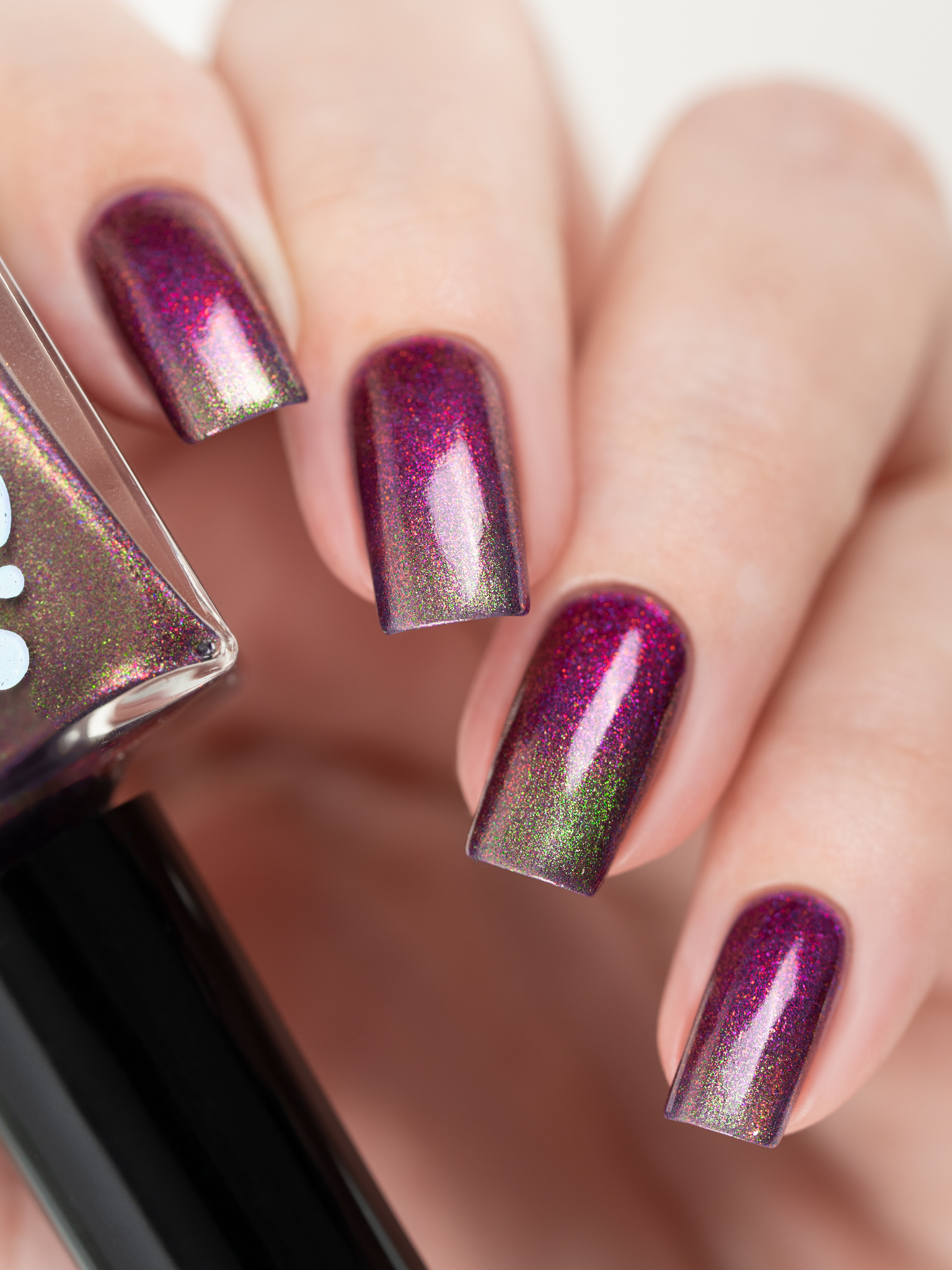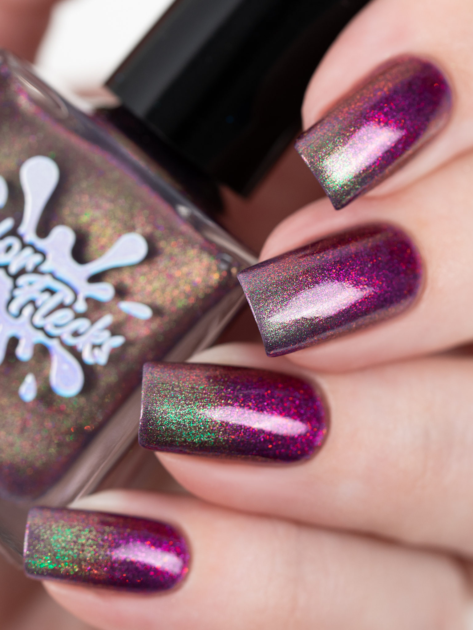 Зелено-сине-фиолетовый мультихромный магнит с миксом красно-оранжевого и красно-розового шиммера в фиолетовой базе