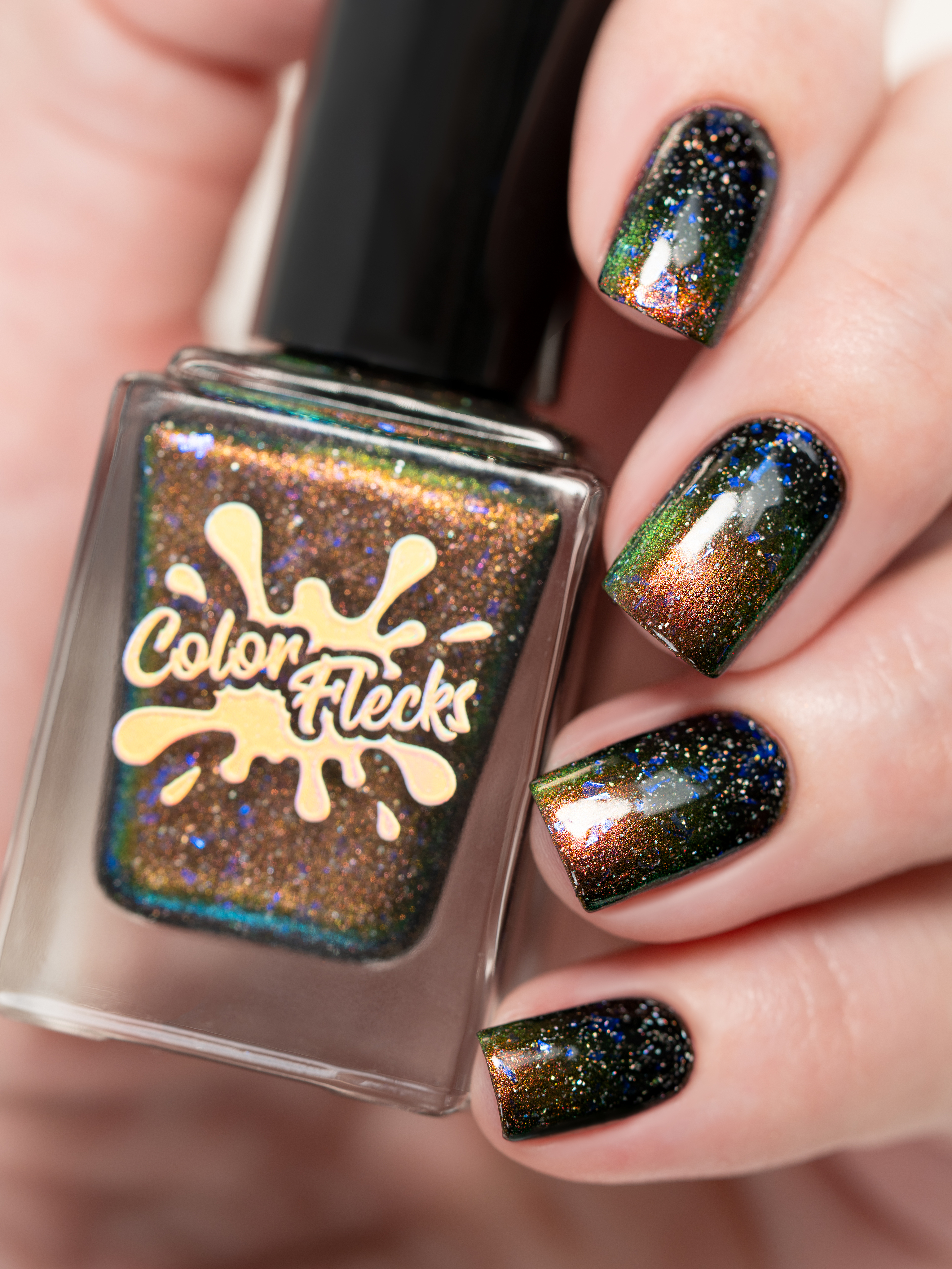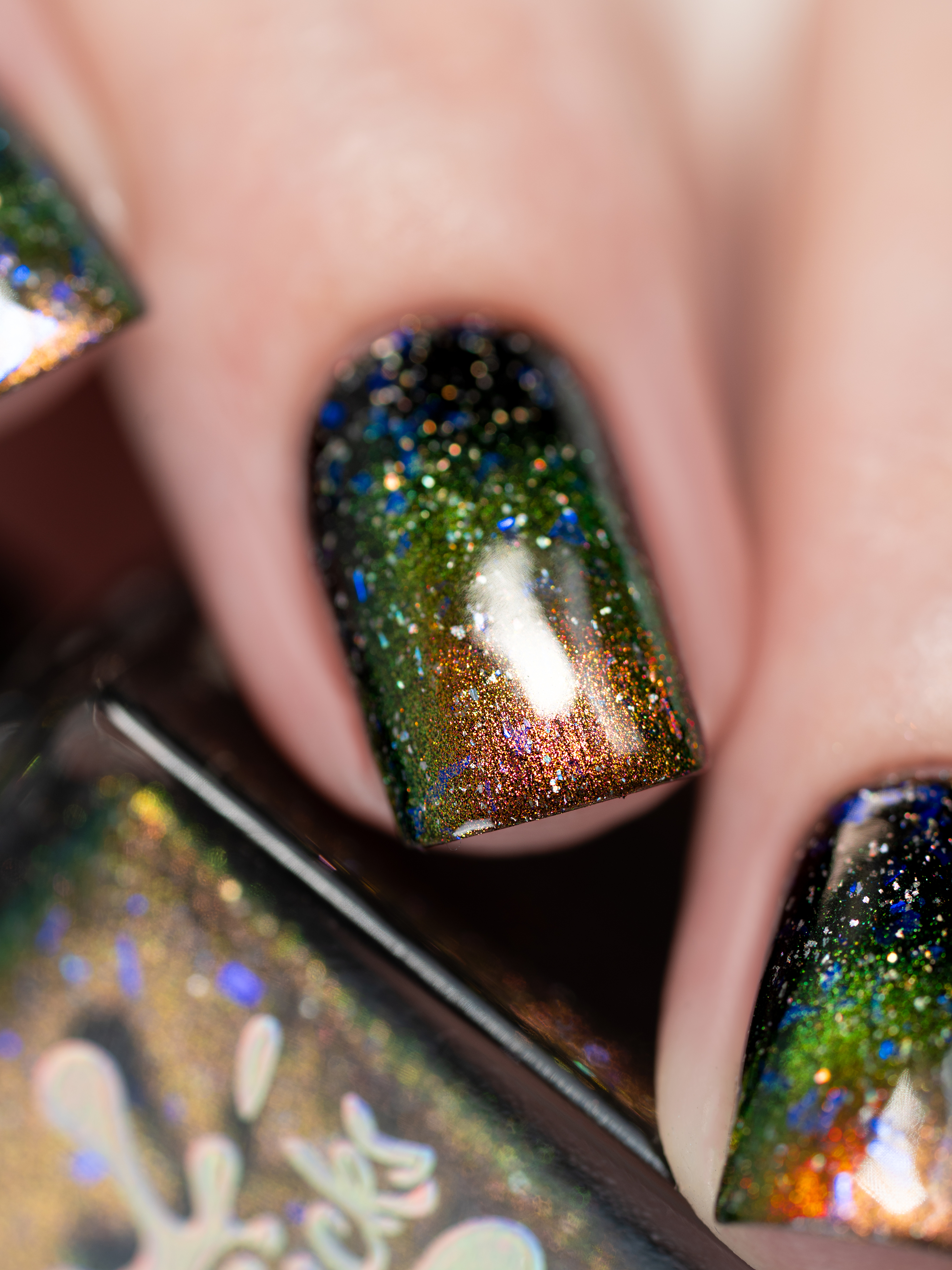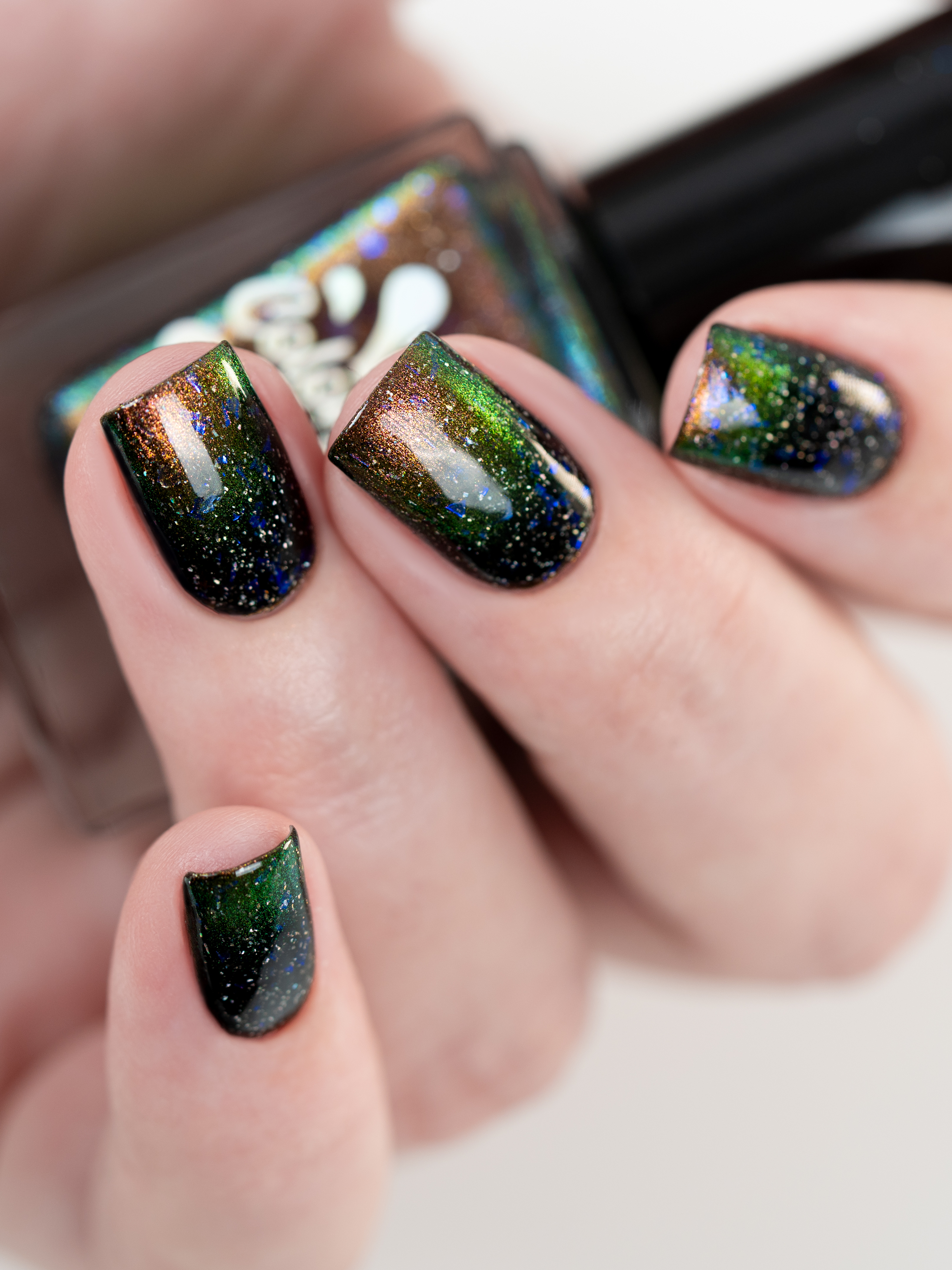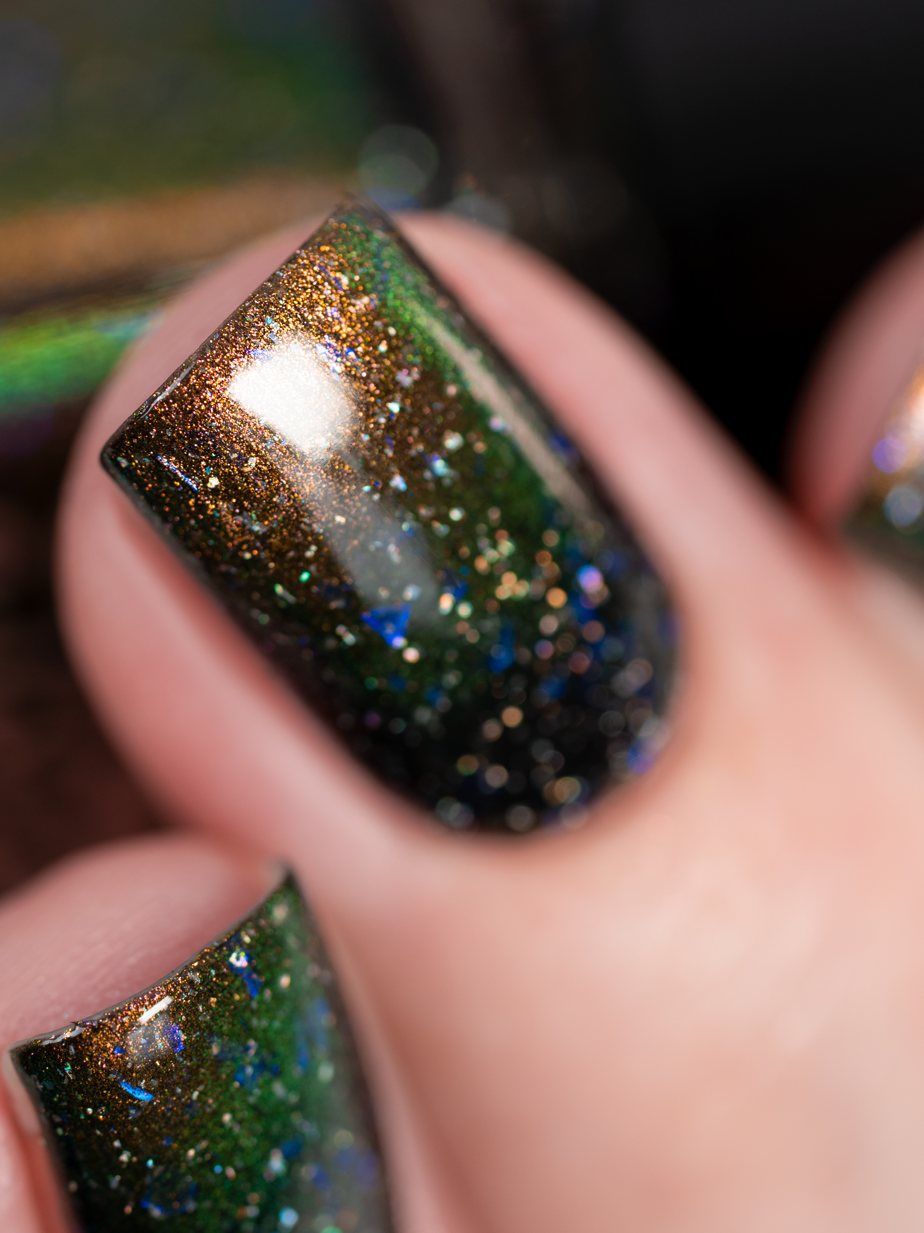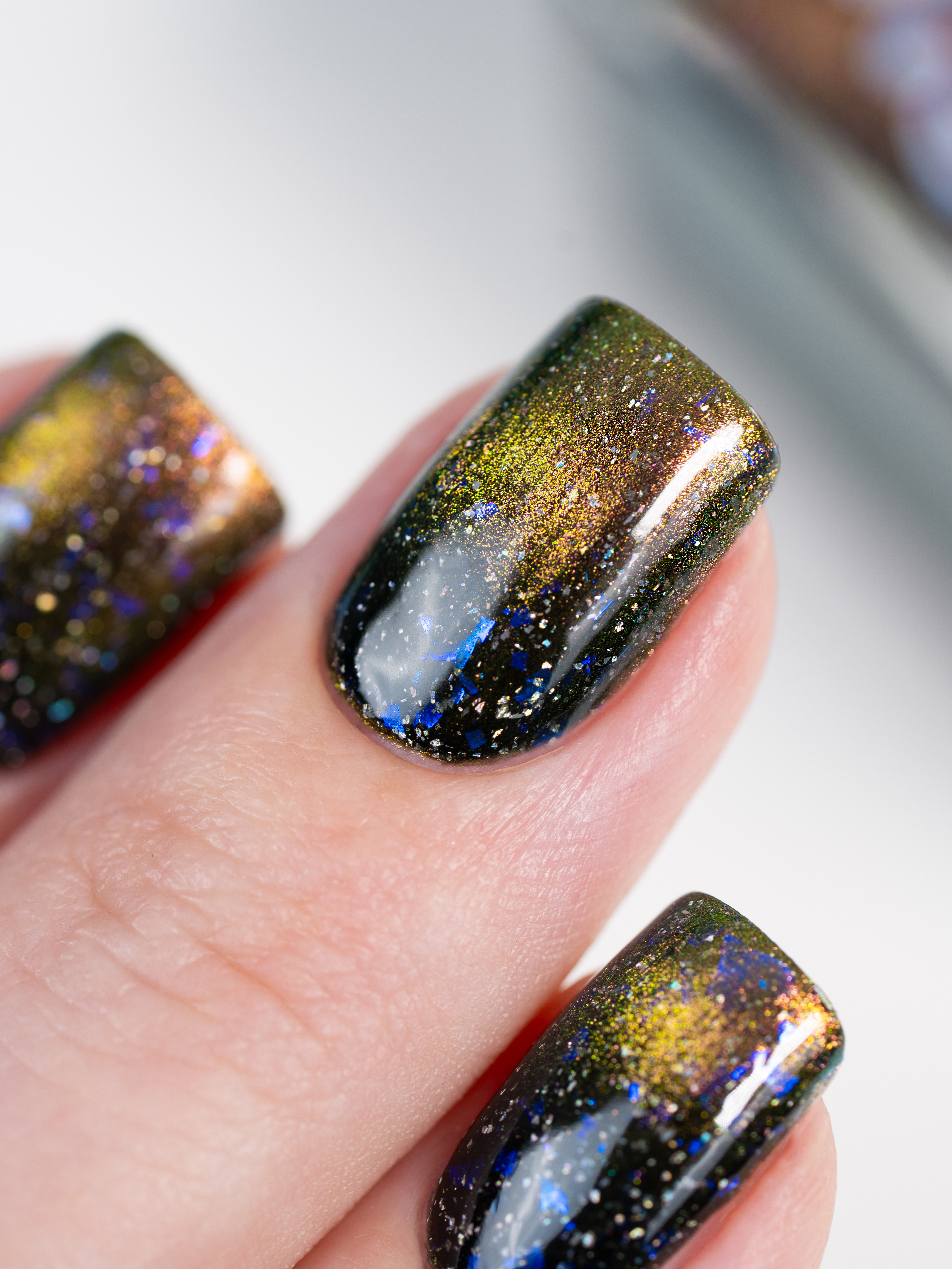 Бронзово-золотисто-зеленый магнит в черной базе с крупными голохлопьями и синей слюдой