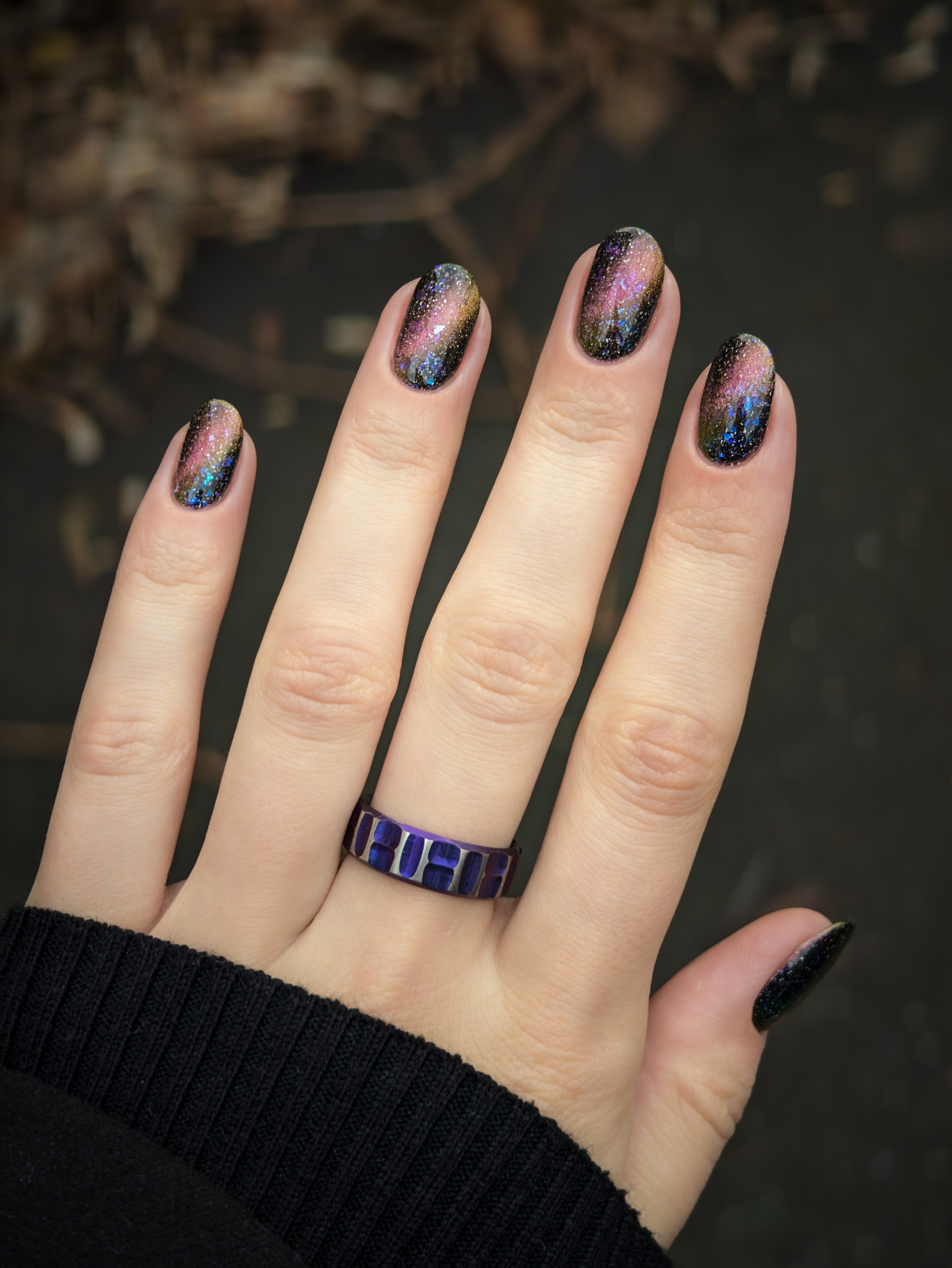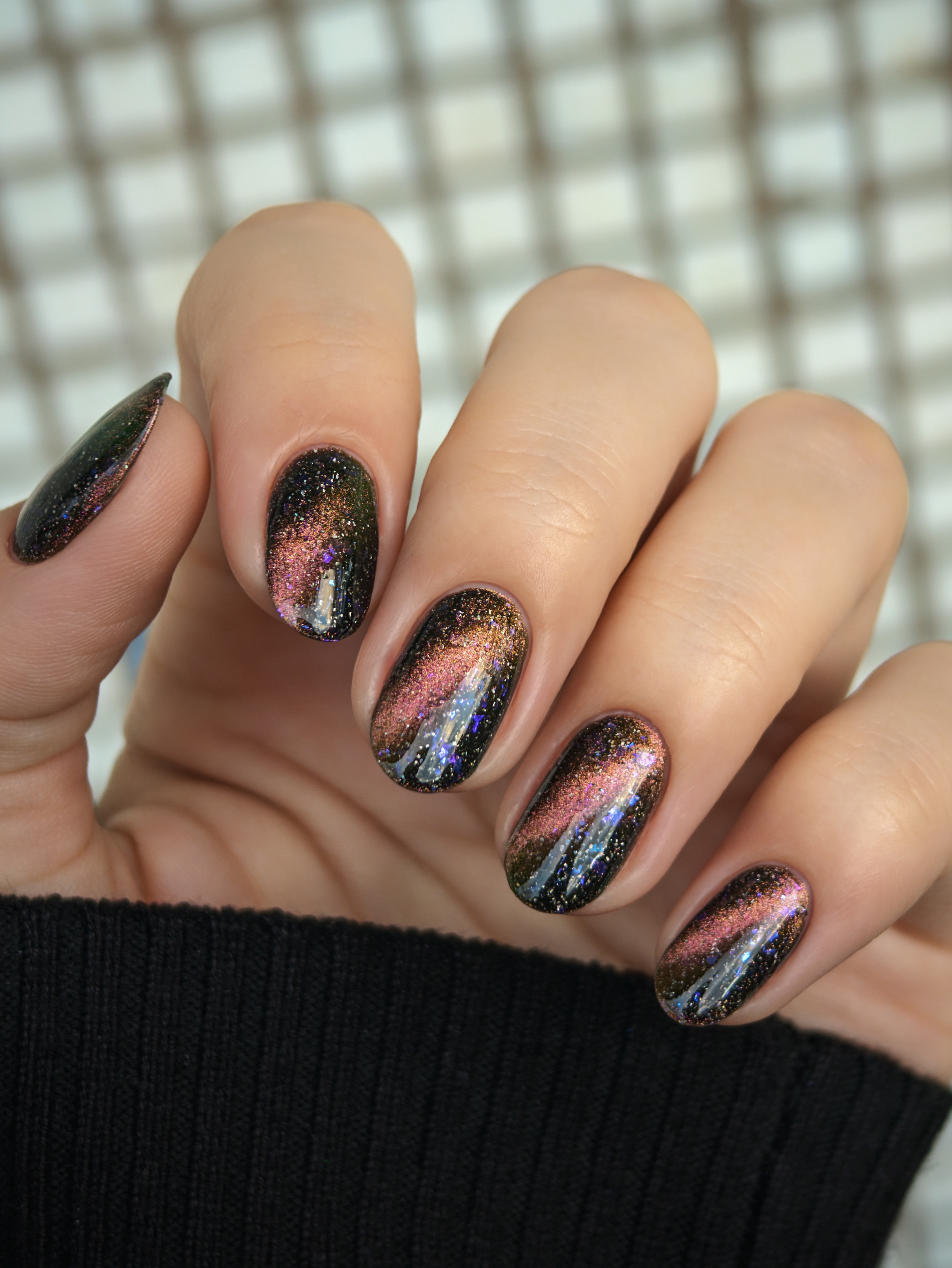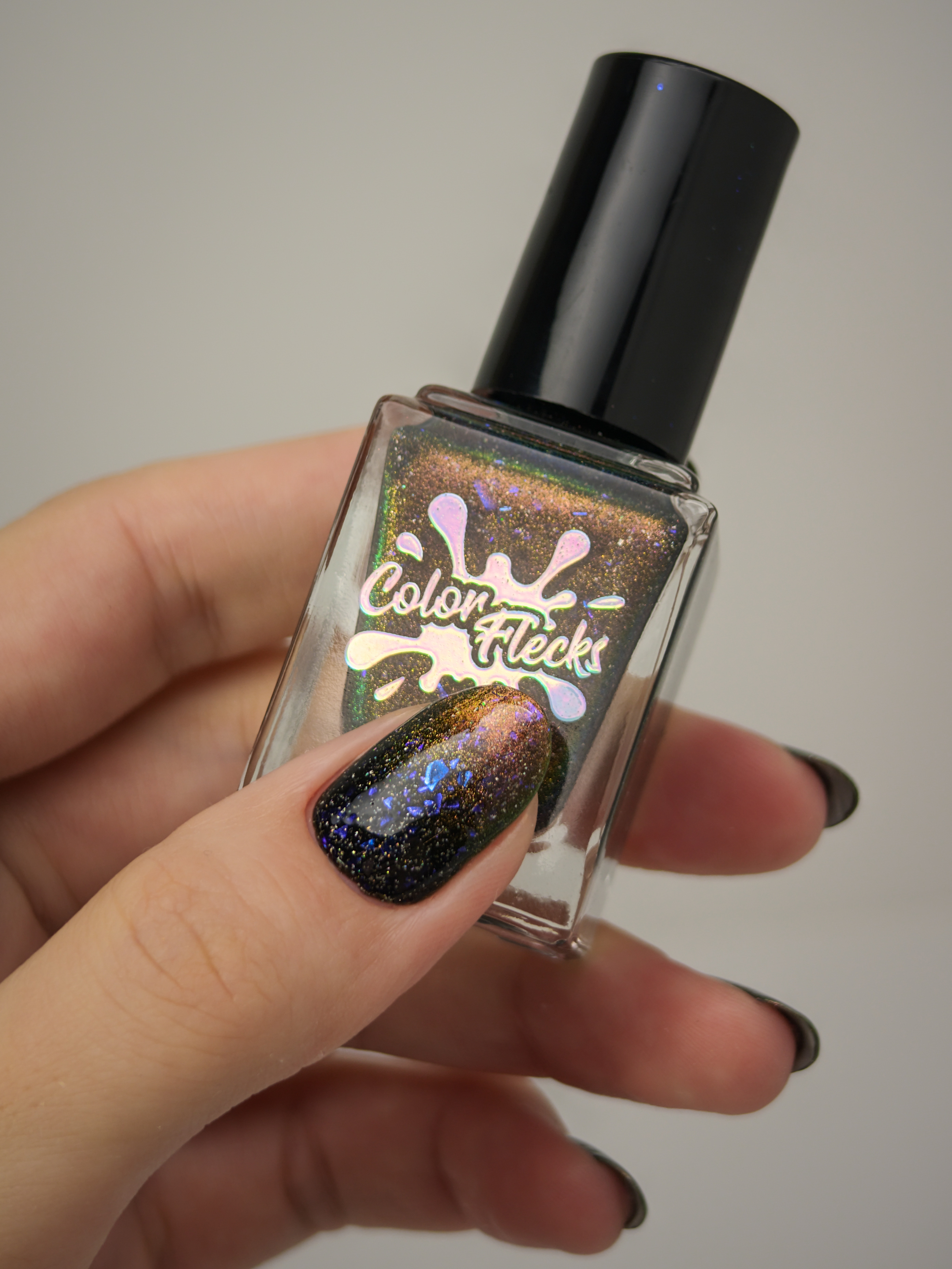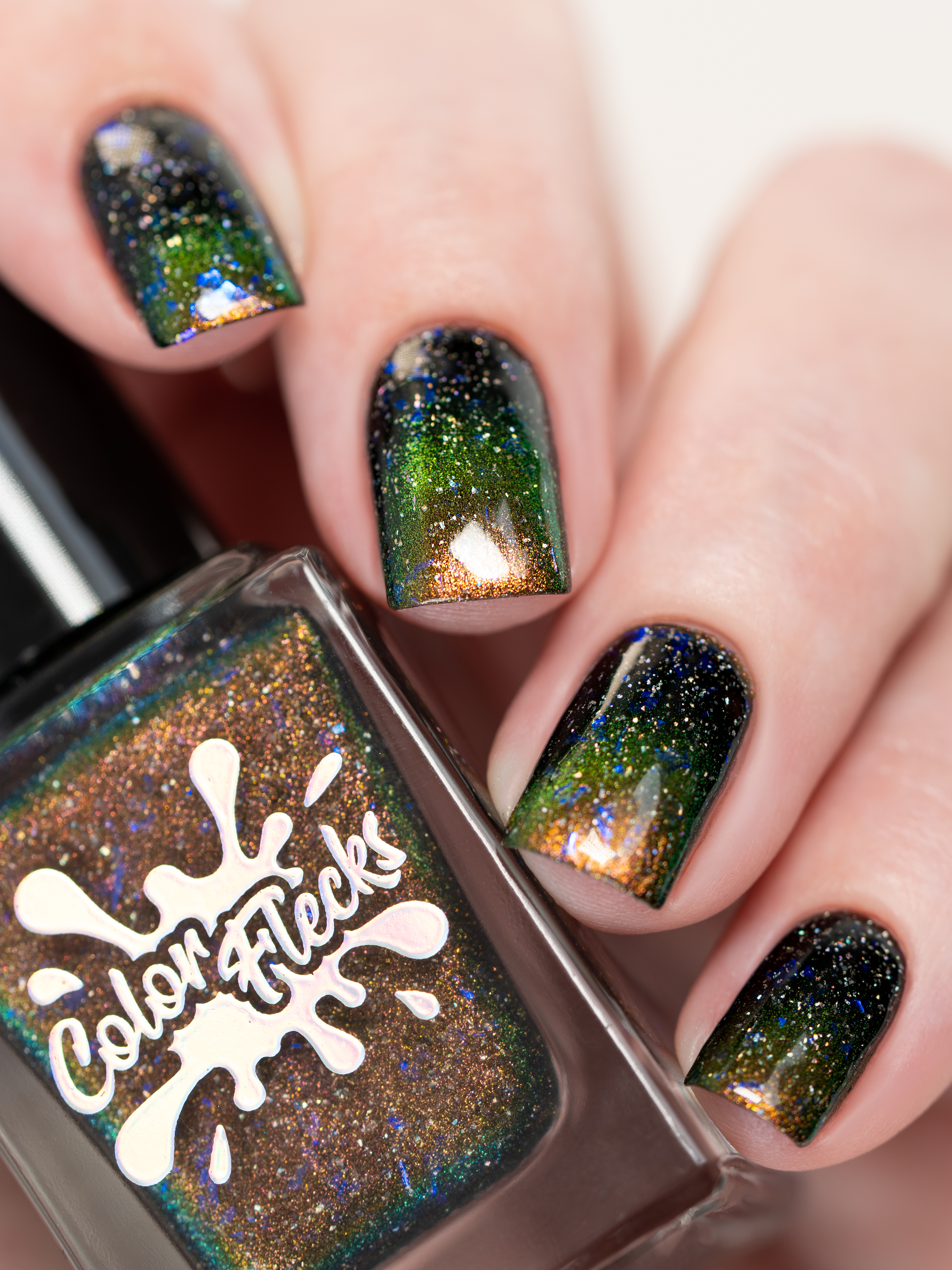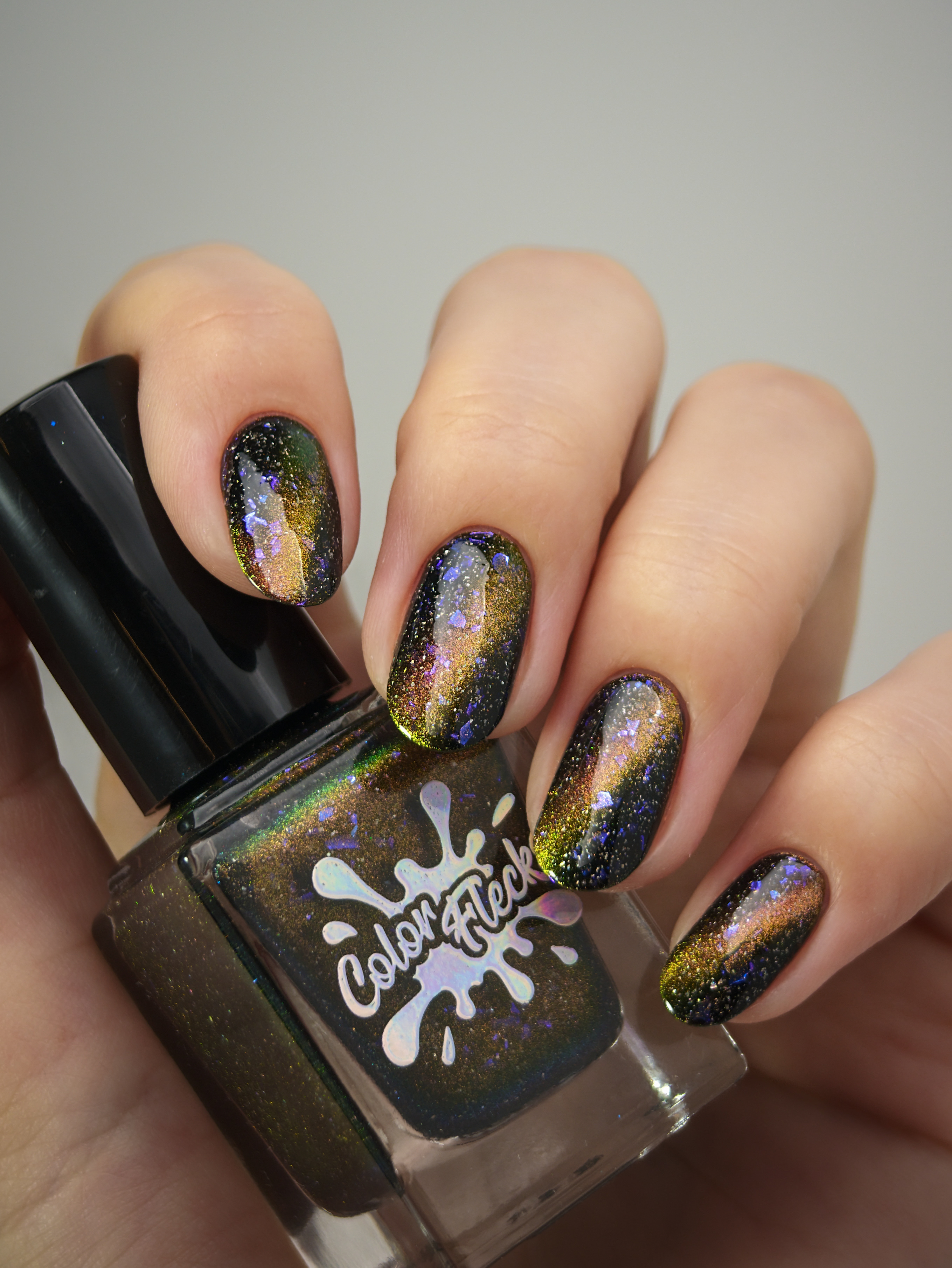 Бронзово-золотисто-зеленый магнит в черной базе с крупными голохлопьями и синей слюдой