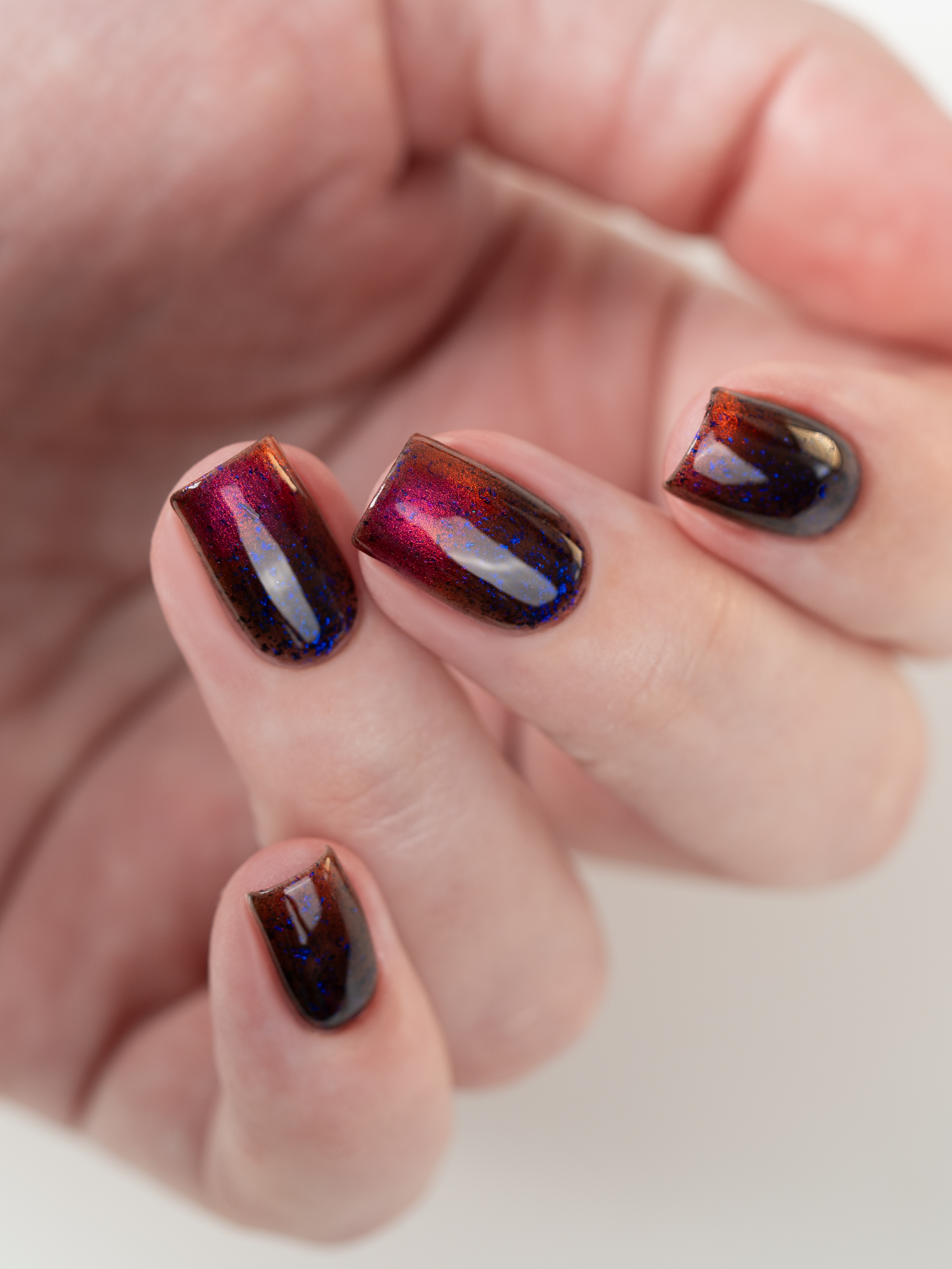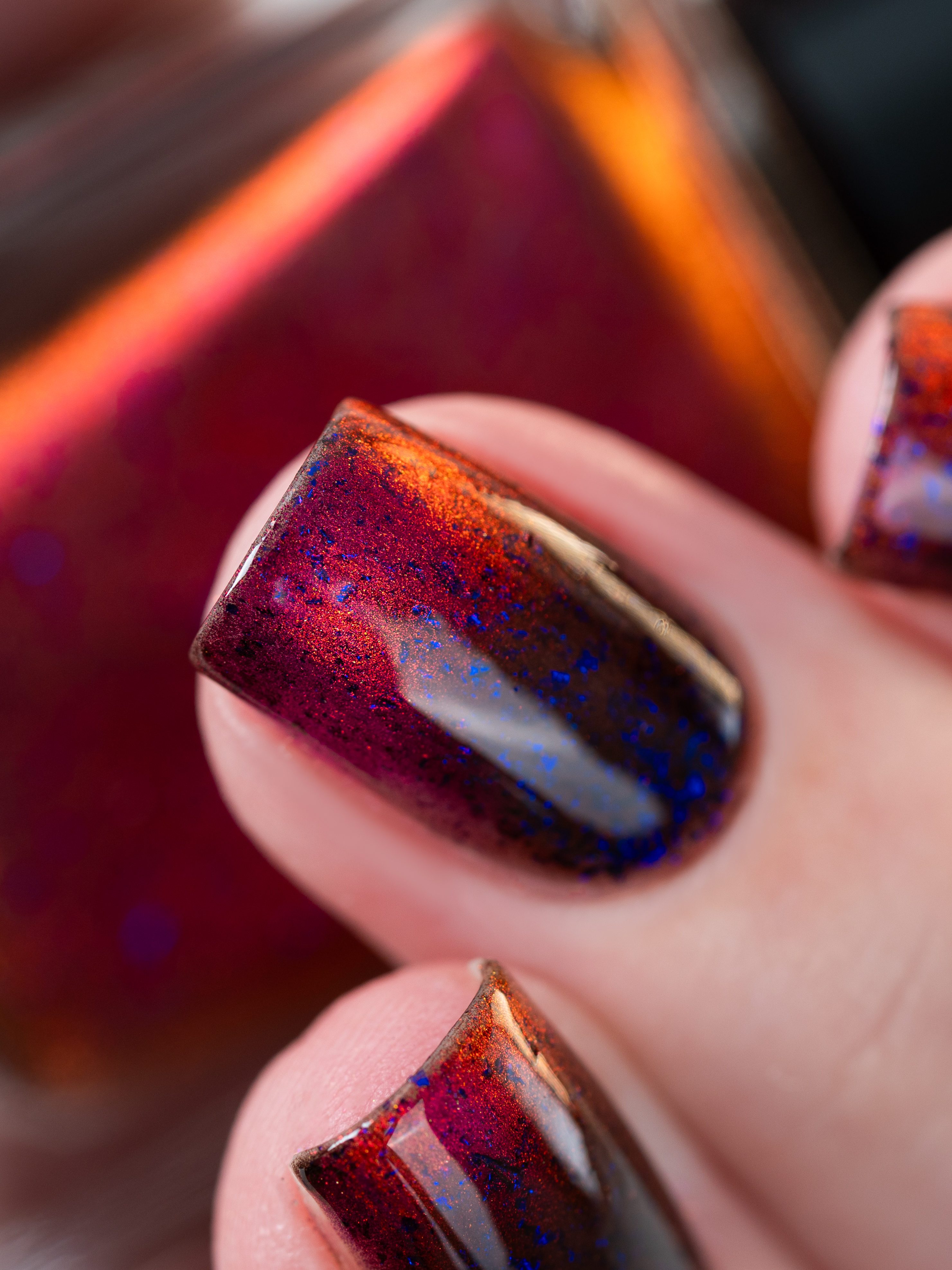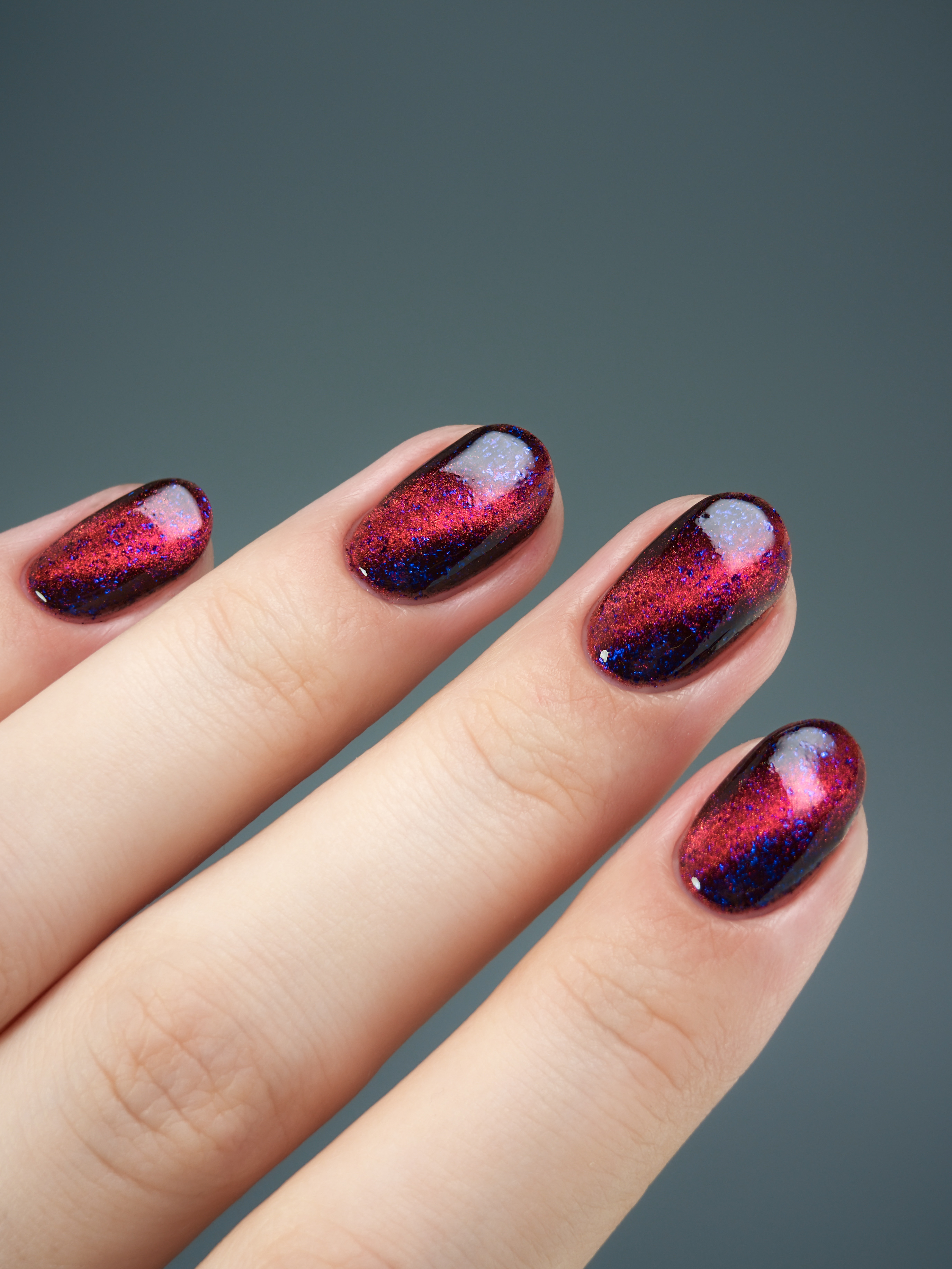 Красный магнит и сине-черные хлопья в прозрачной базе. Имеет неплотную текстуру и "колготочный" эффект.