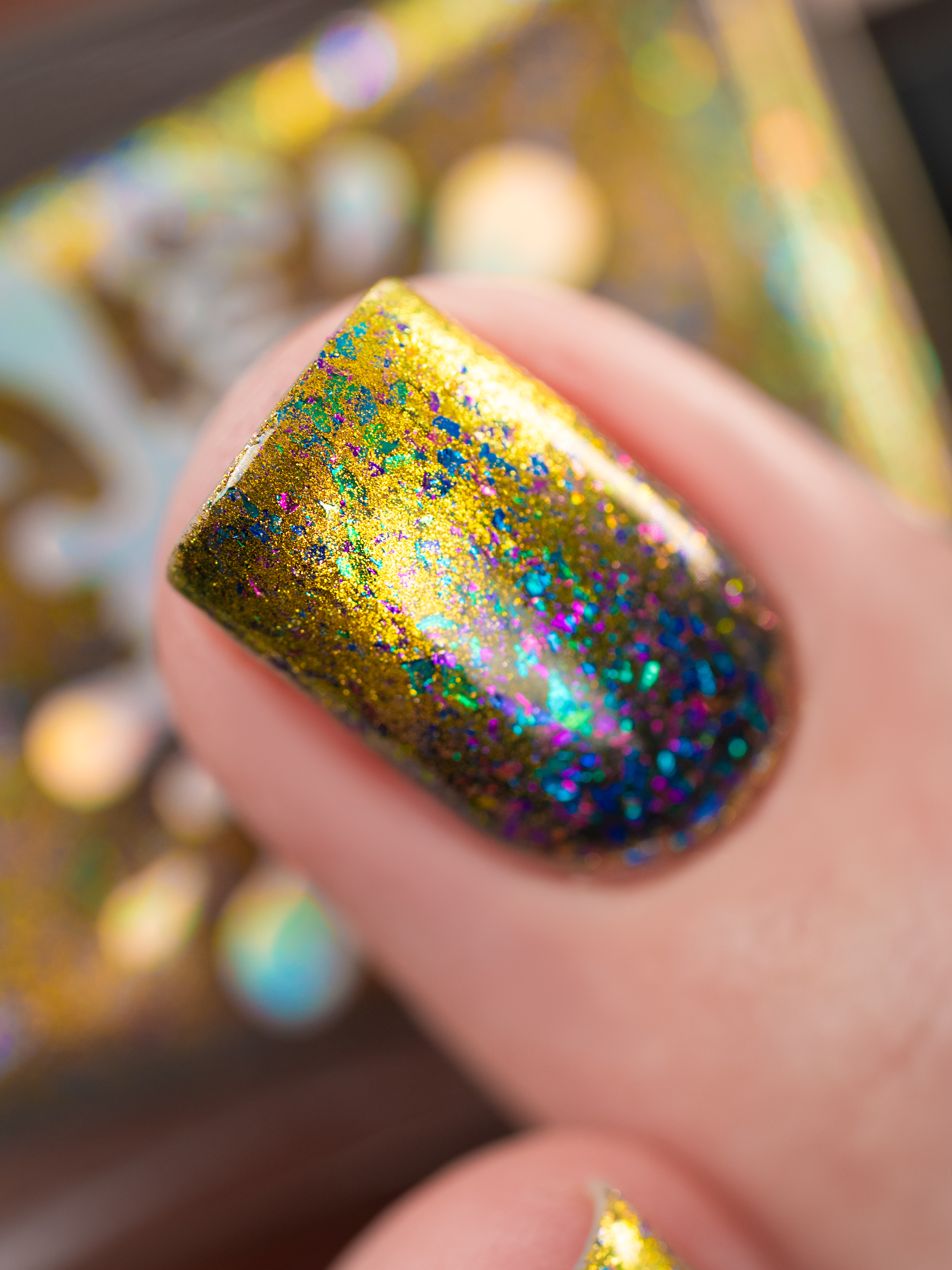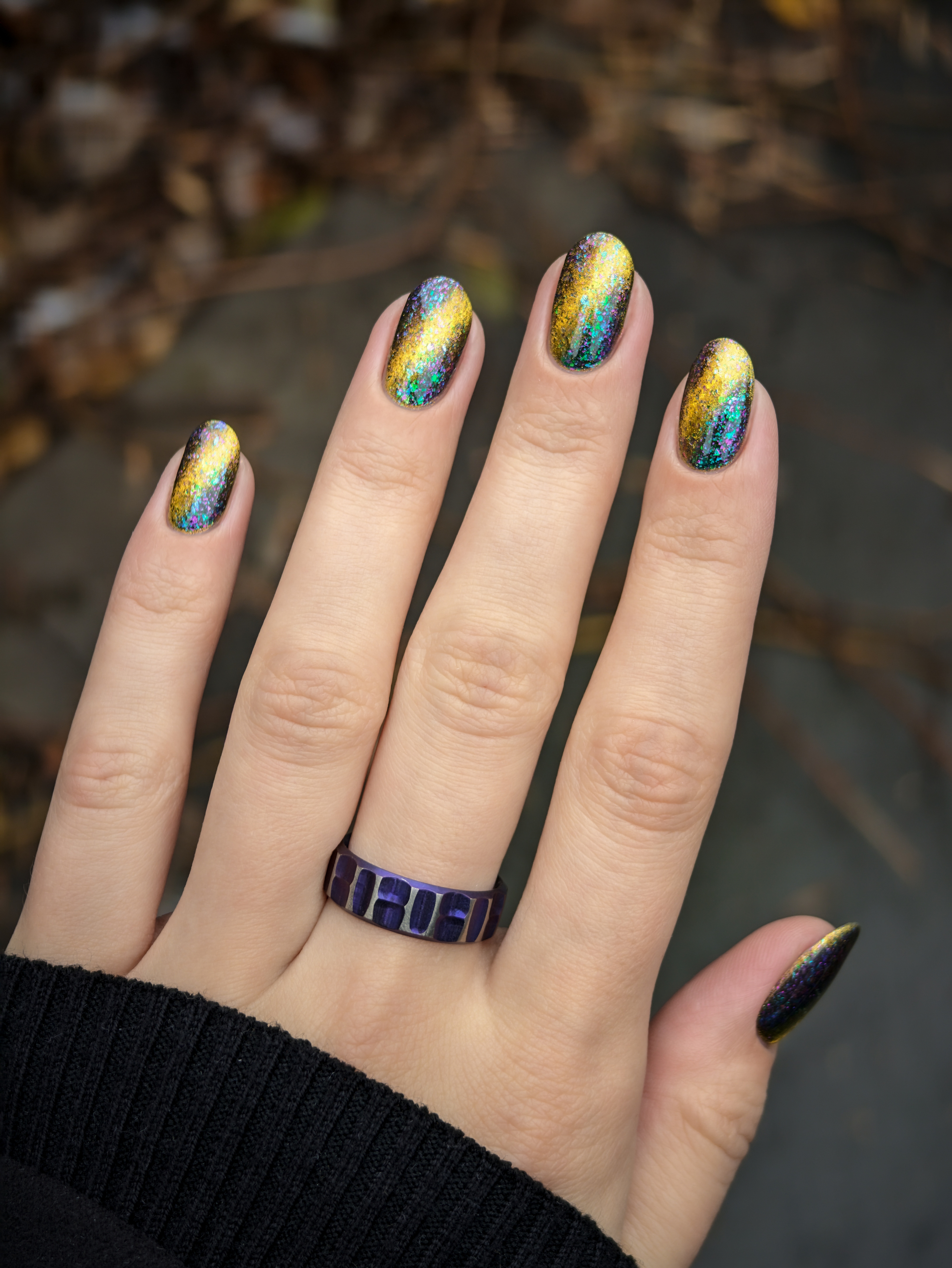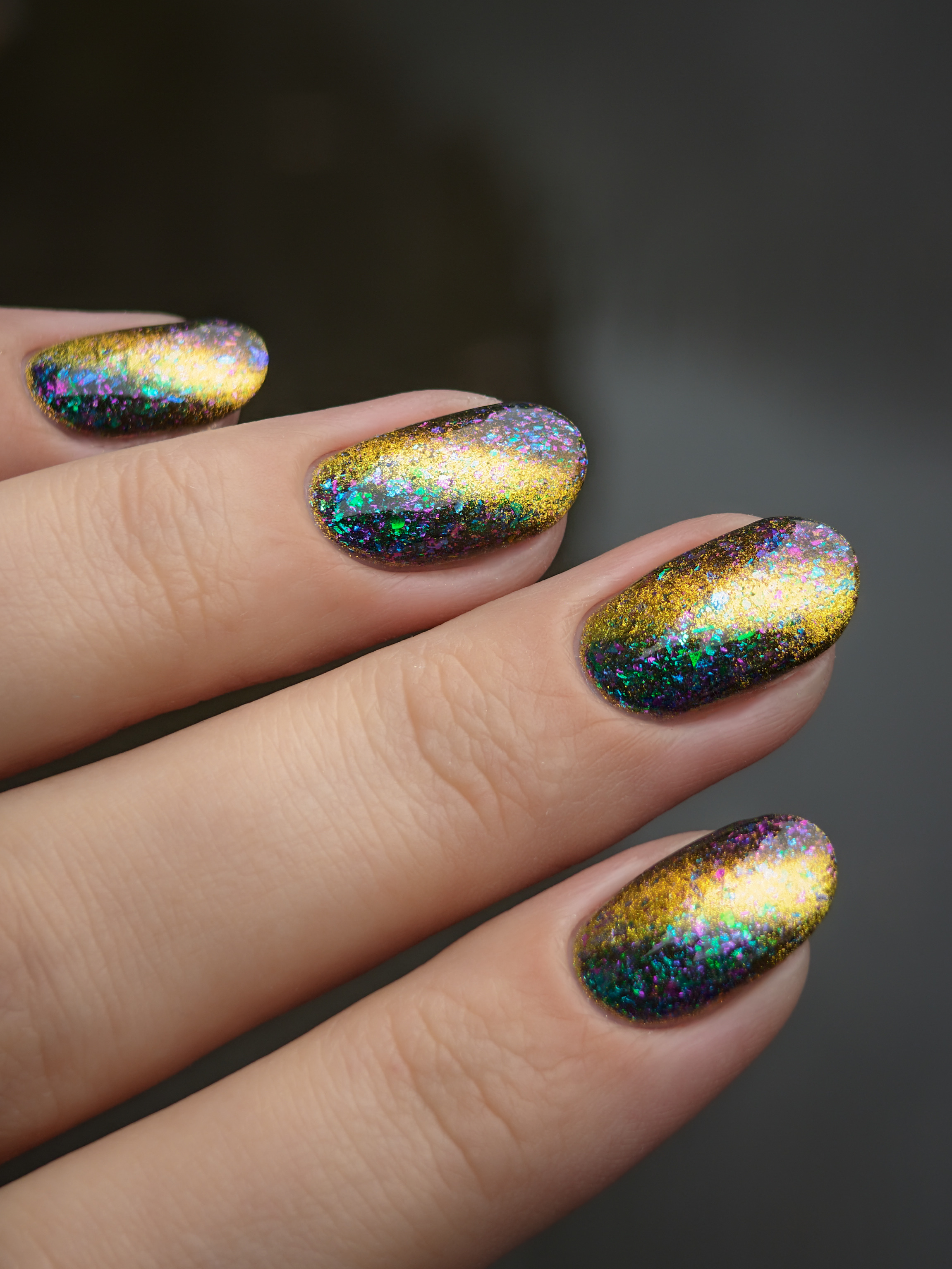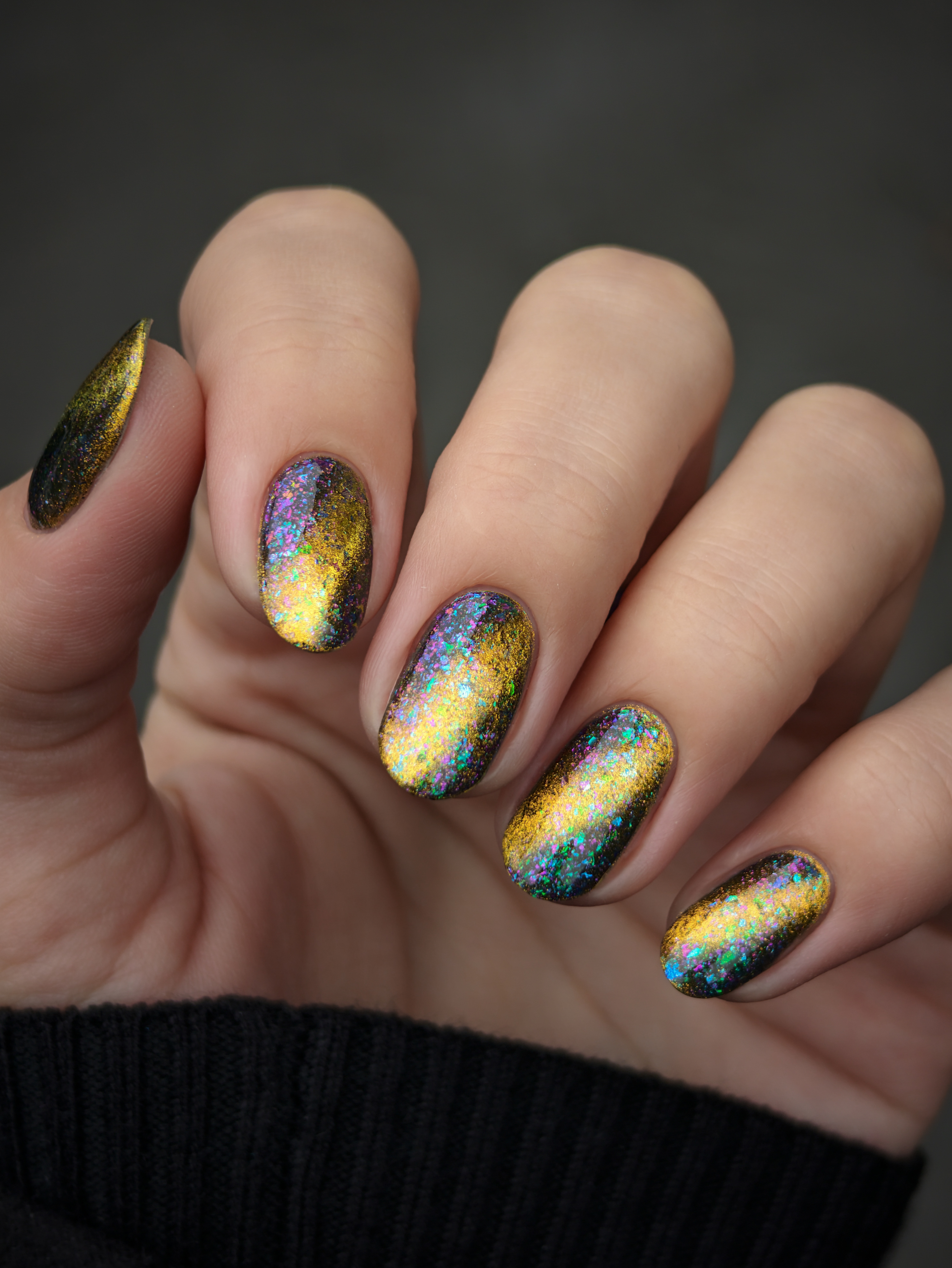 Золотой магнит и множество мультихромных разноцветных хлопьев в чуть подкрашенной черным базе