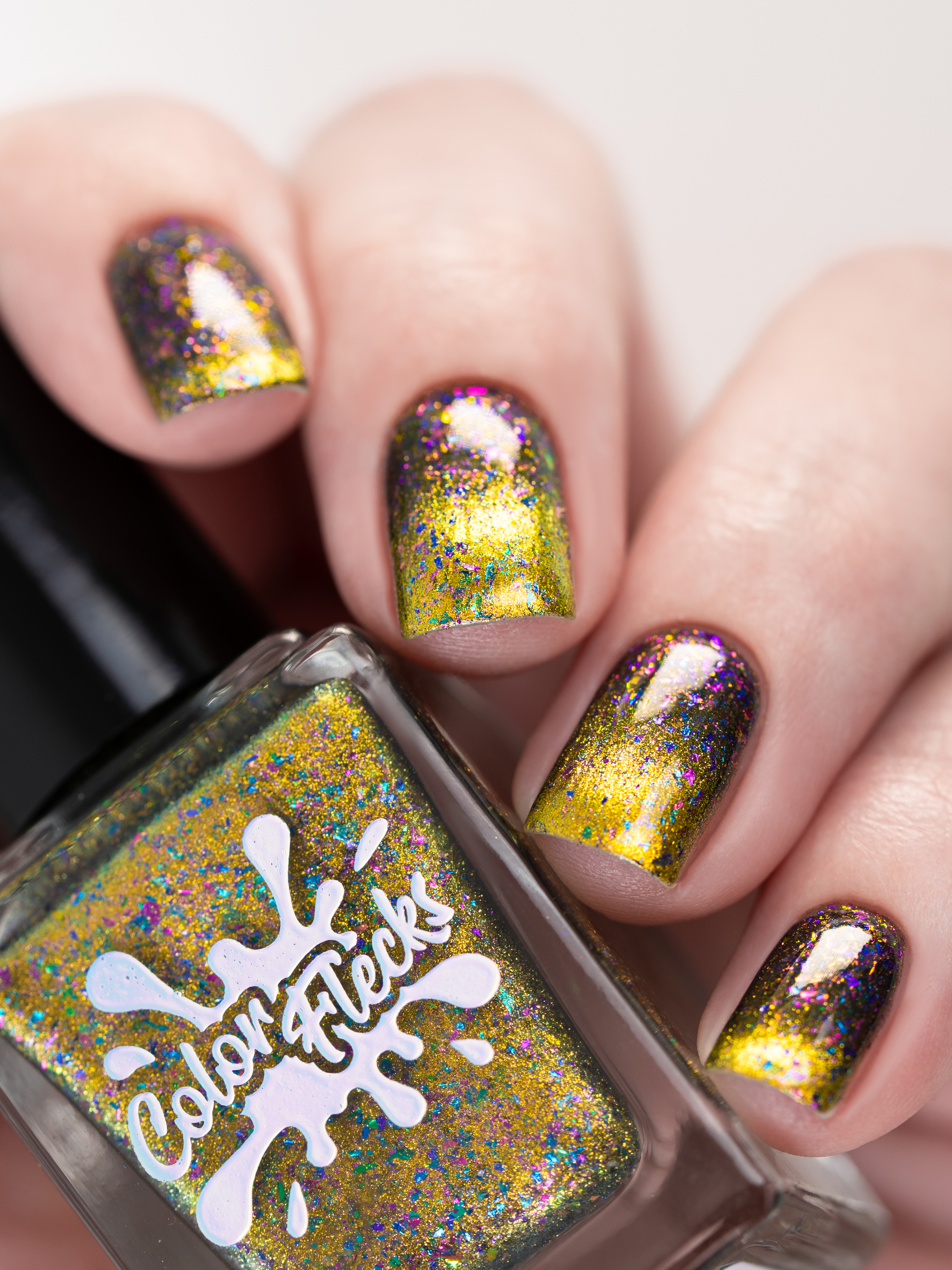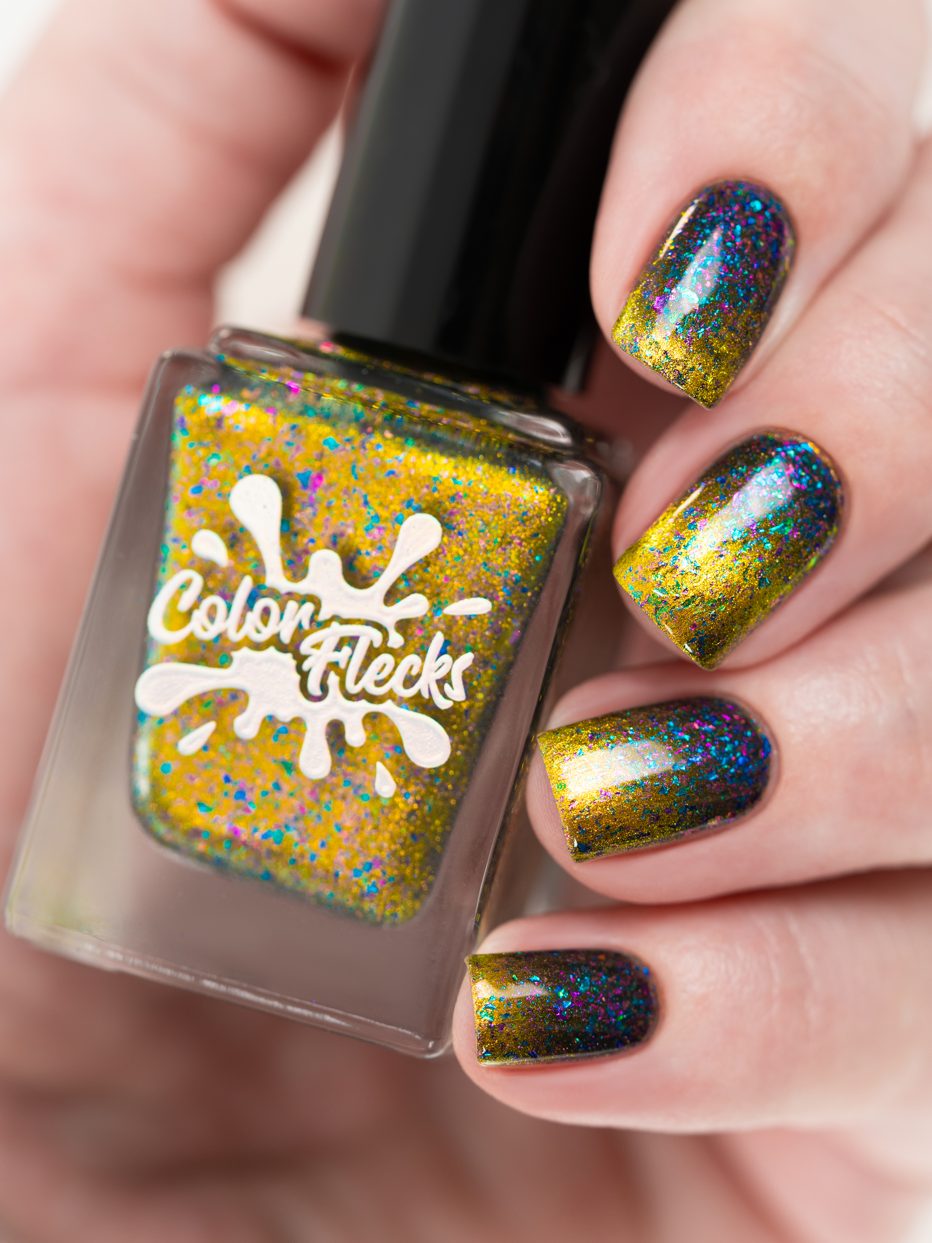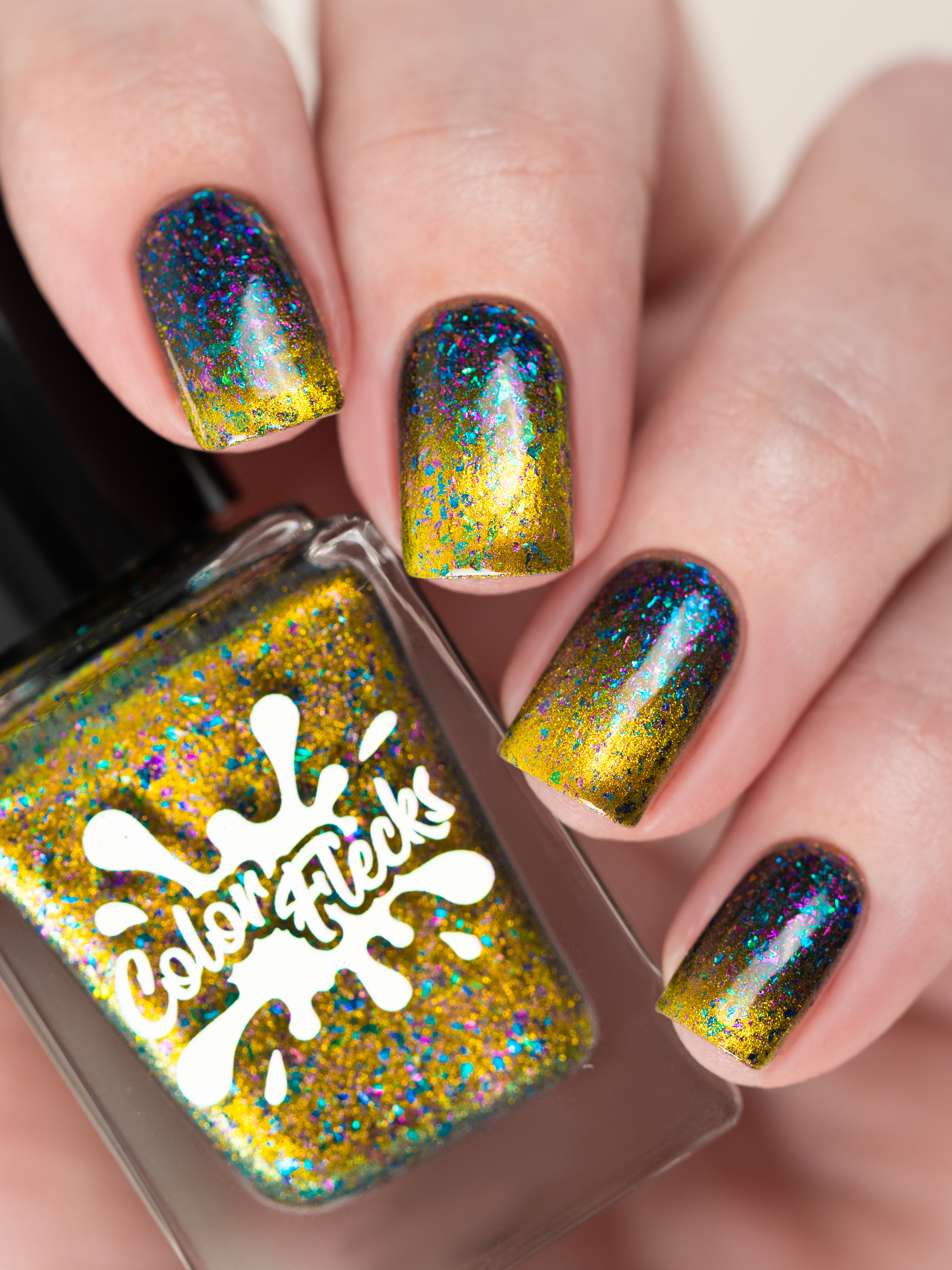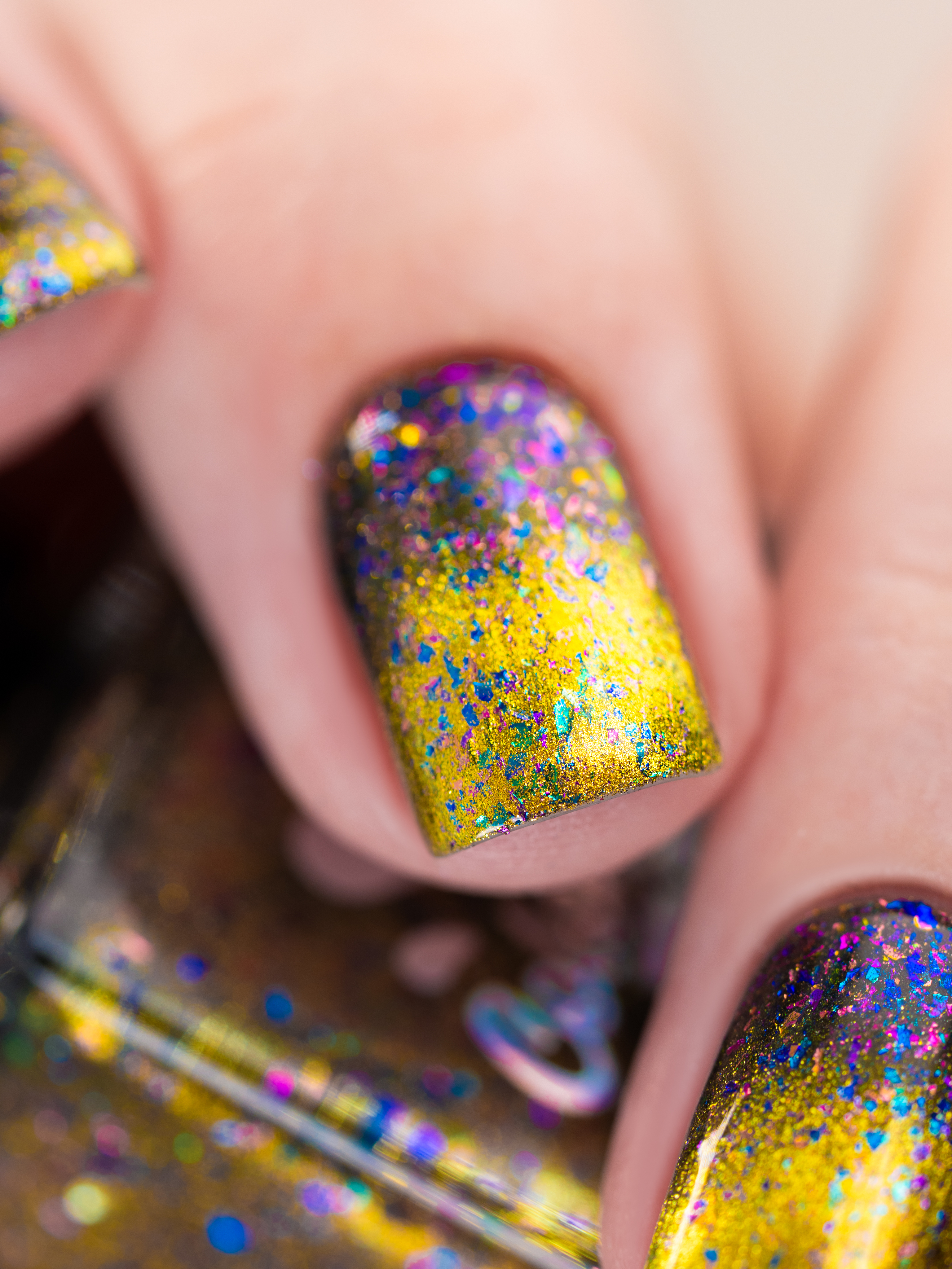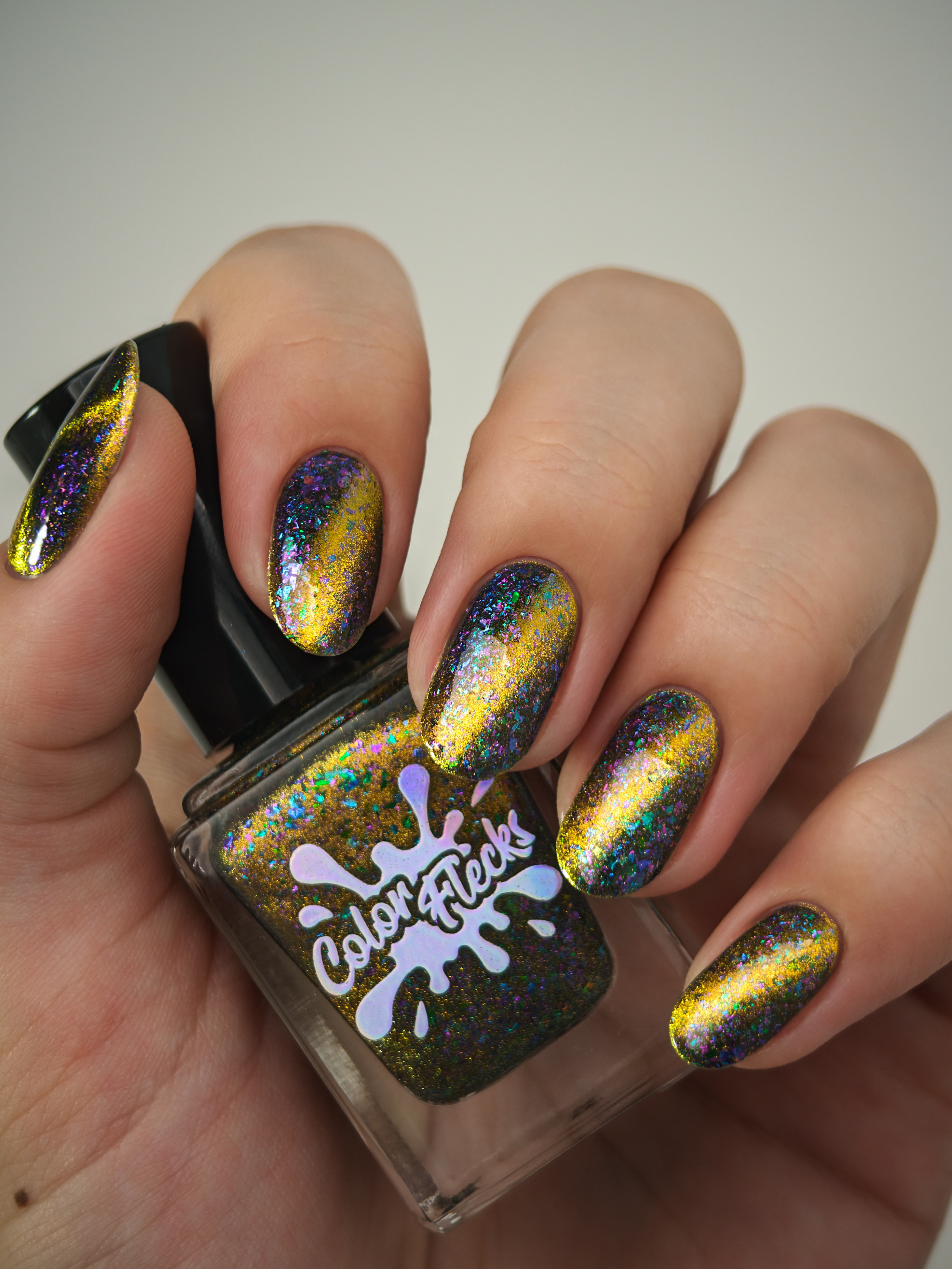 Золотой магнит и множество мультихромных разноцветных хлопьев в чуть подкрашенной черным базе