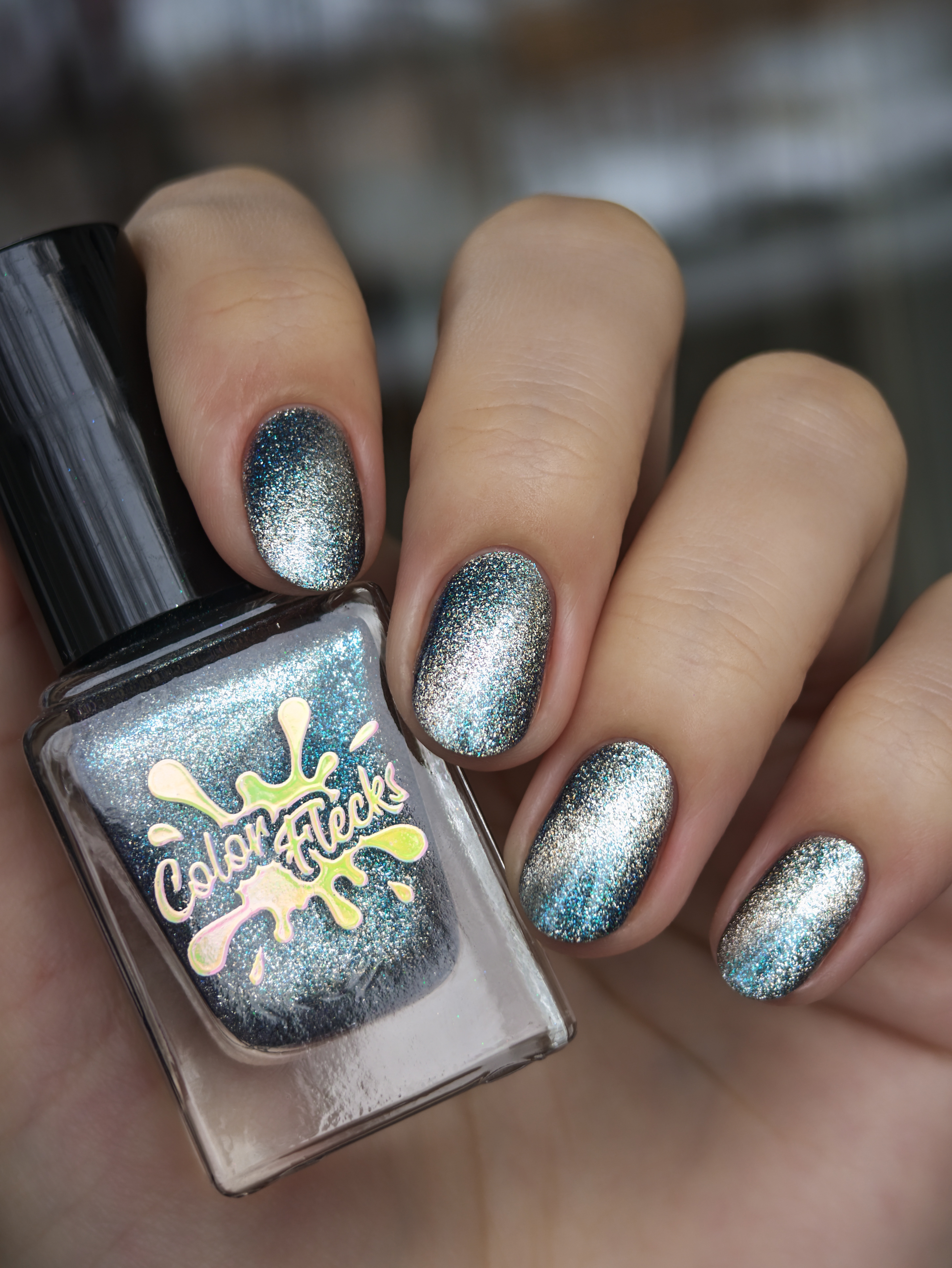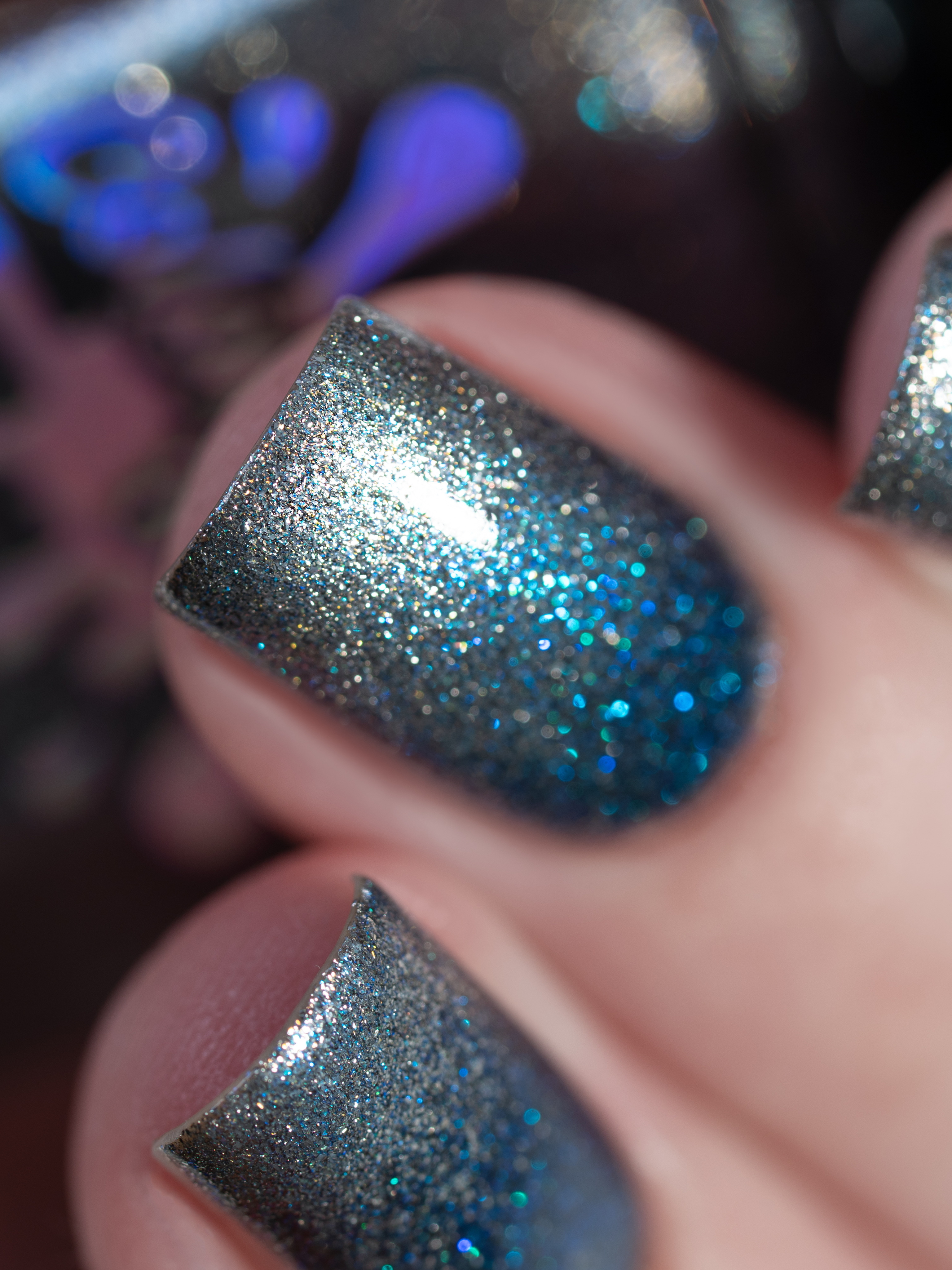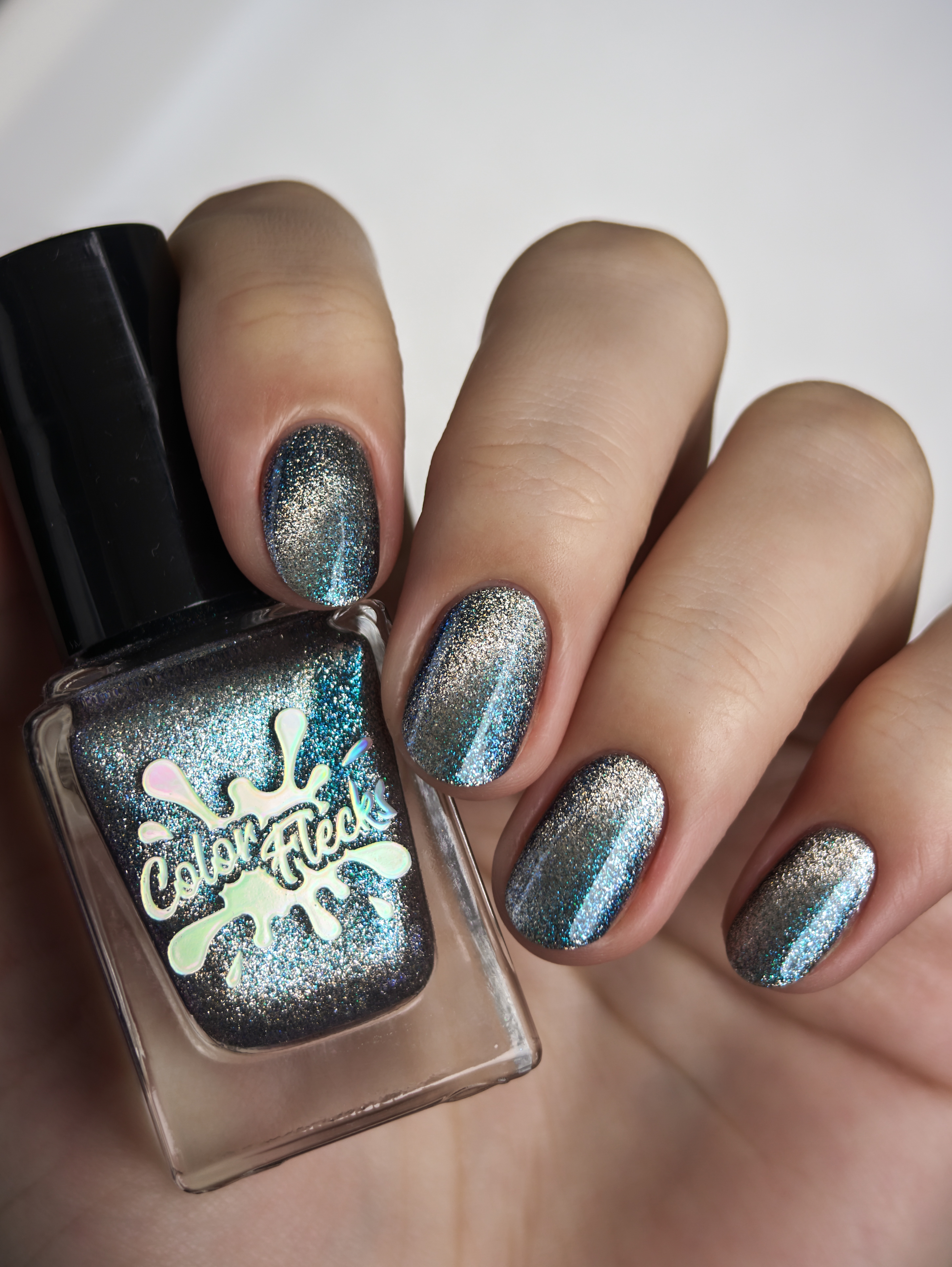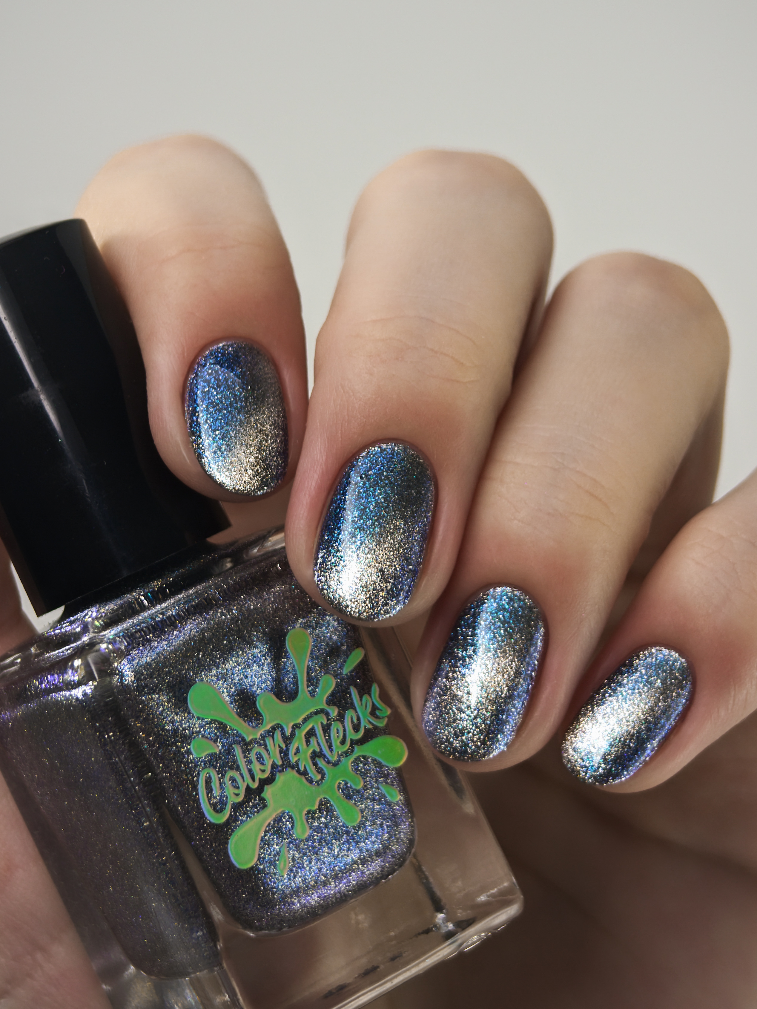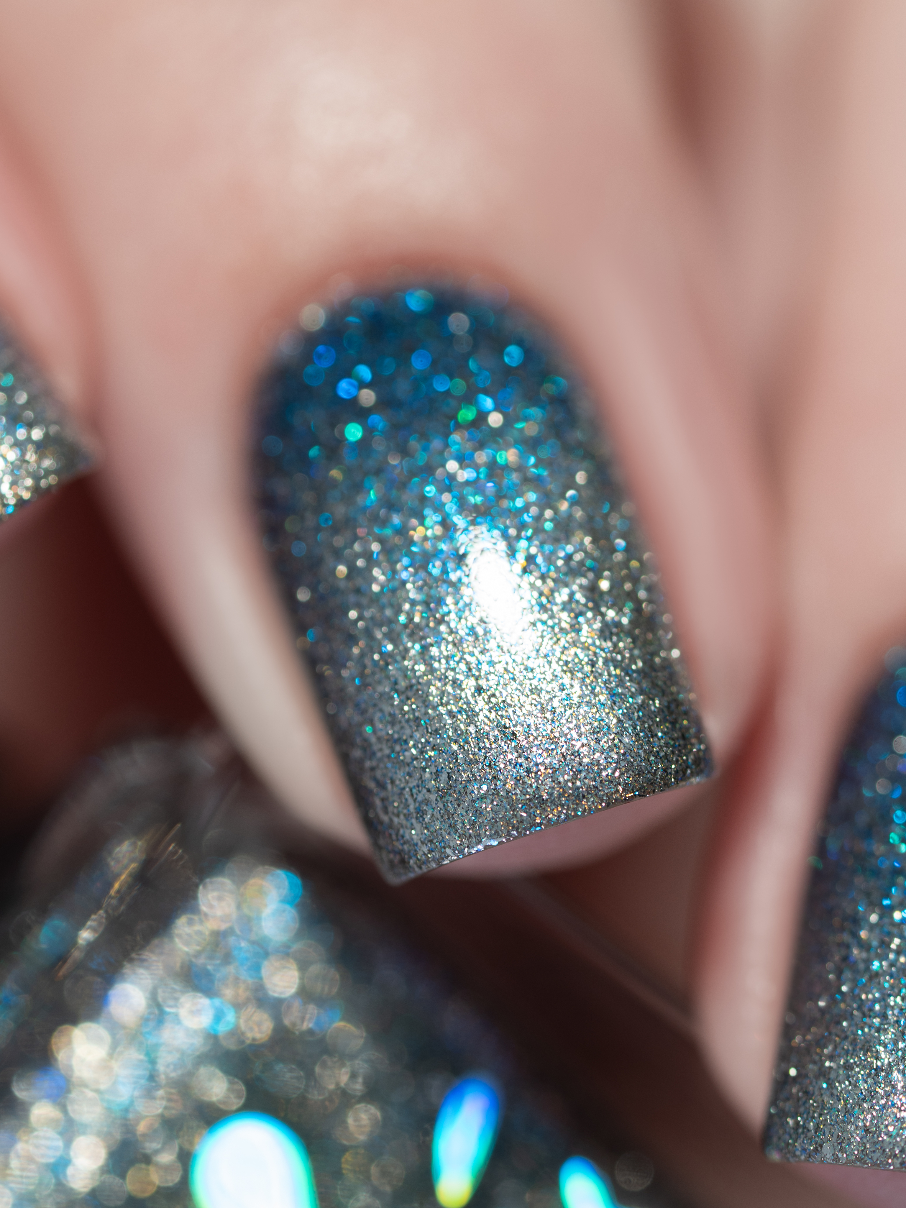 Крупный искристый серебряный магнит и сине-голубой шиммер в черной базе