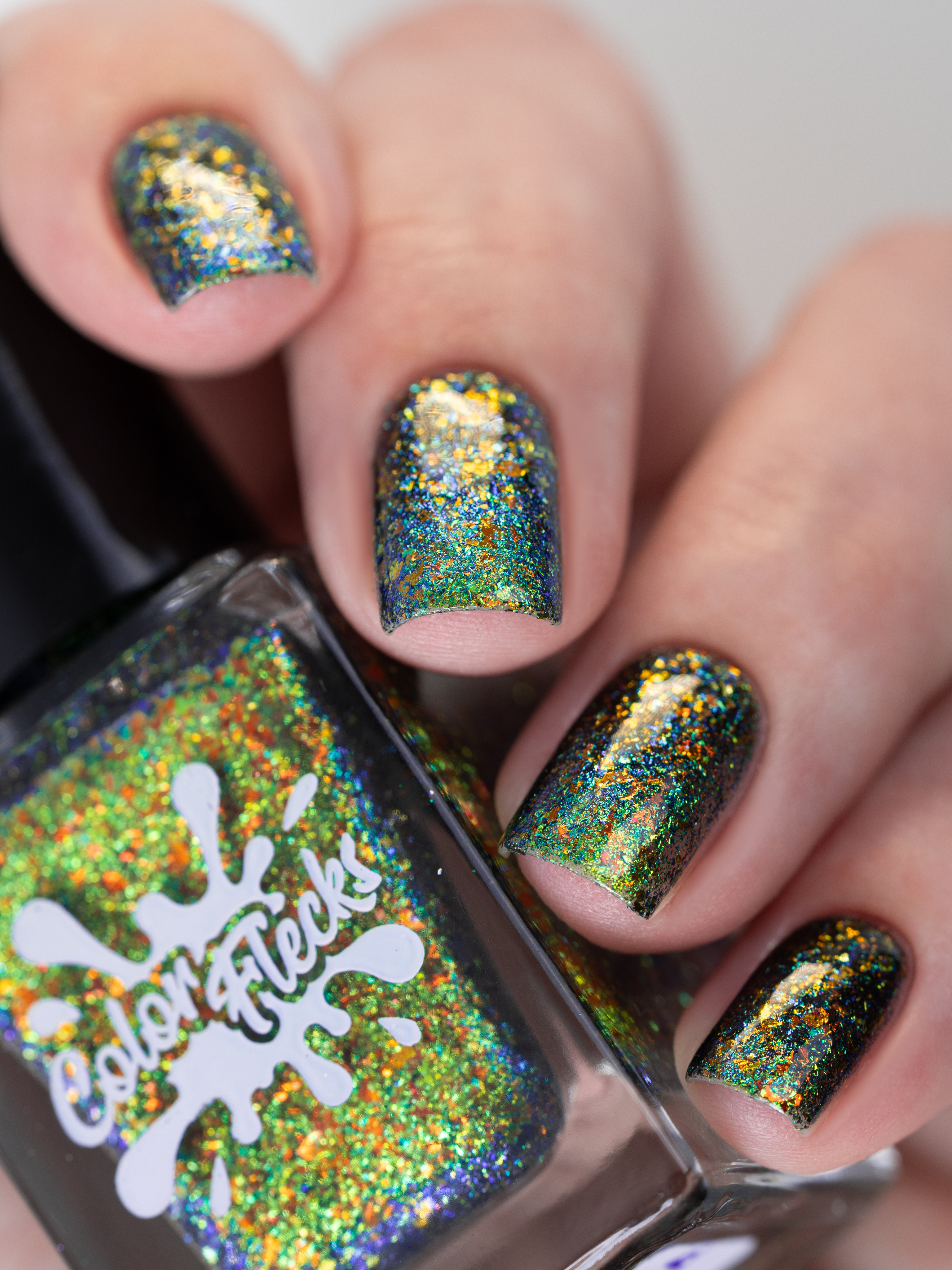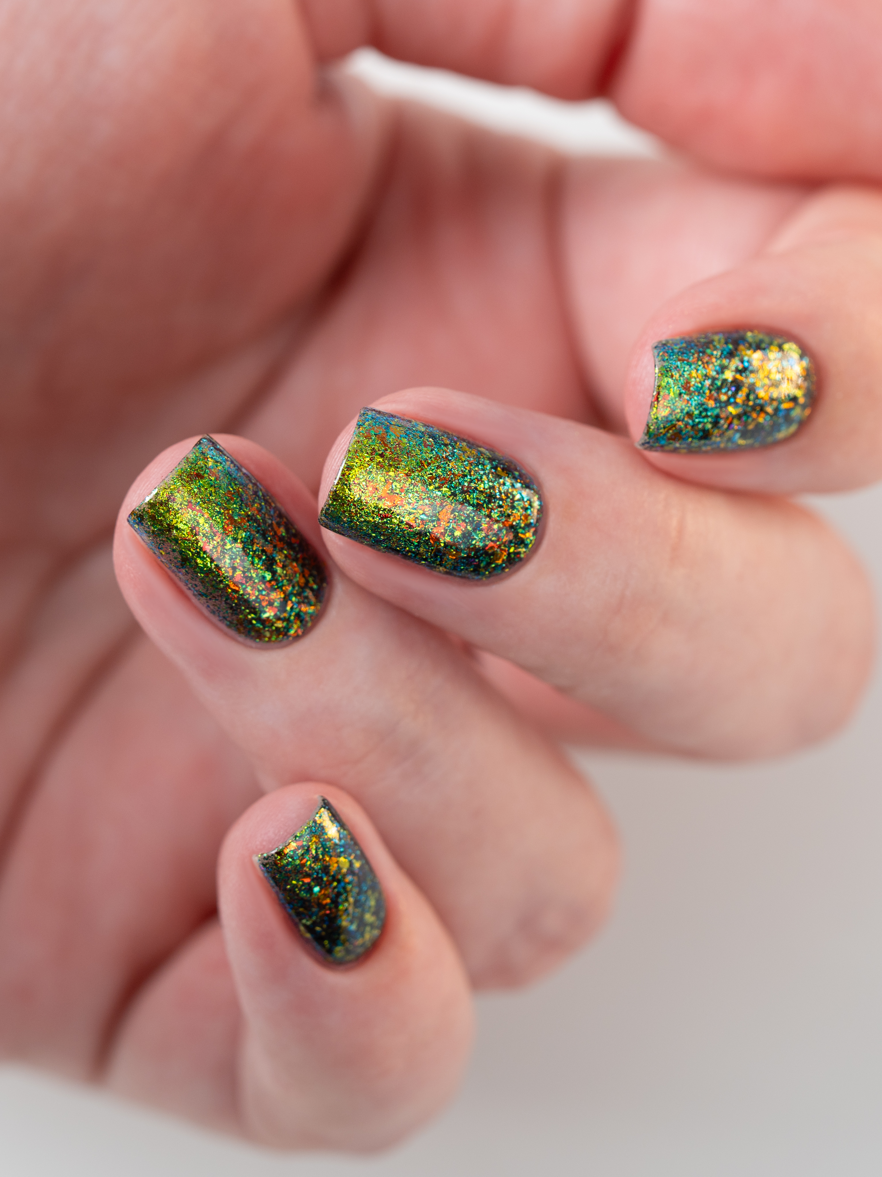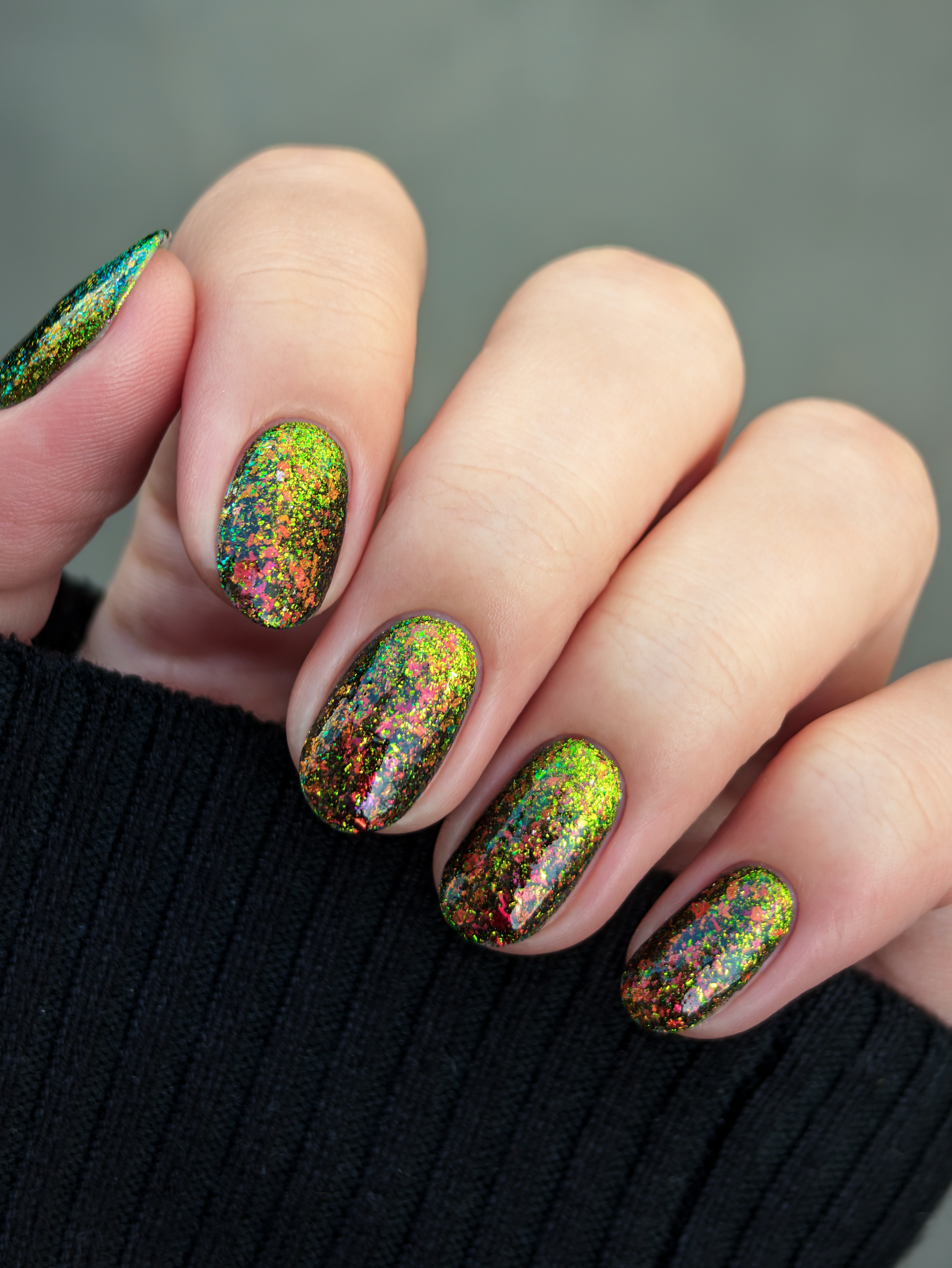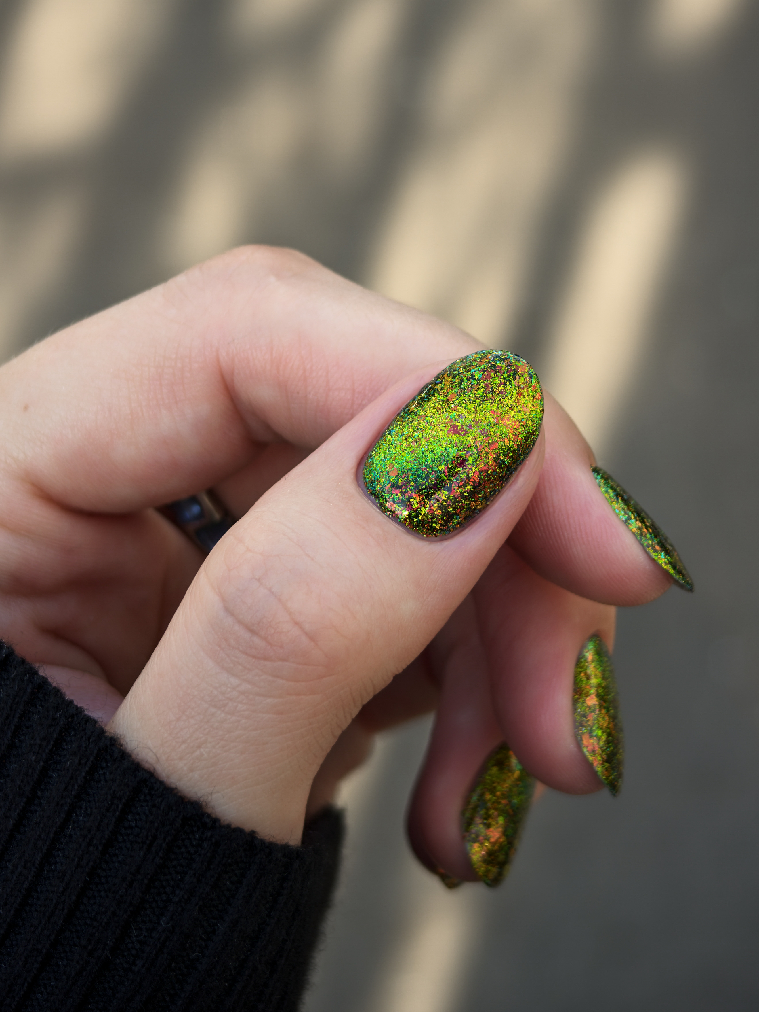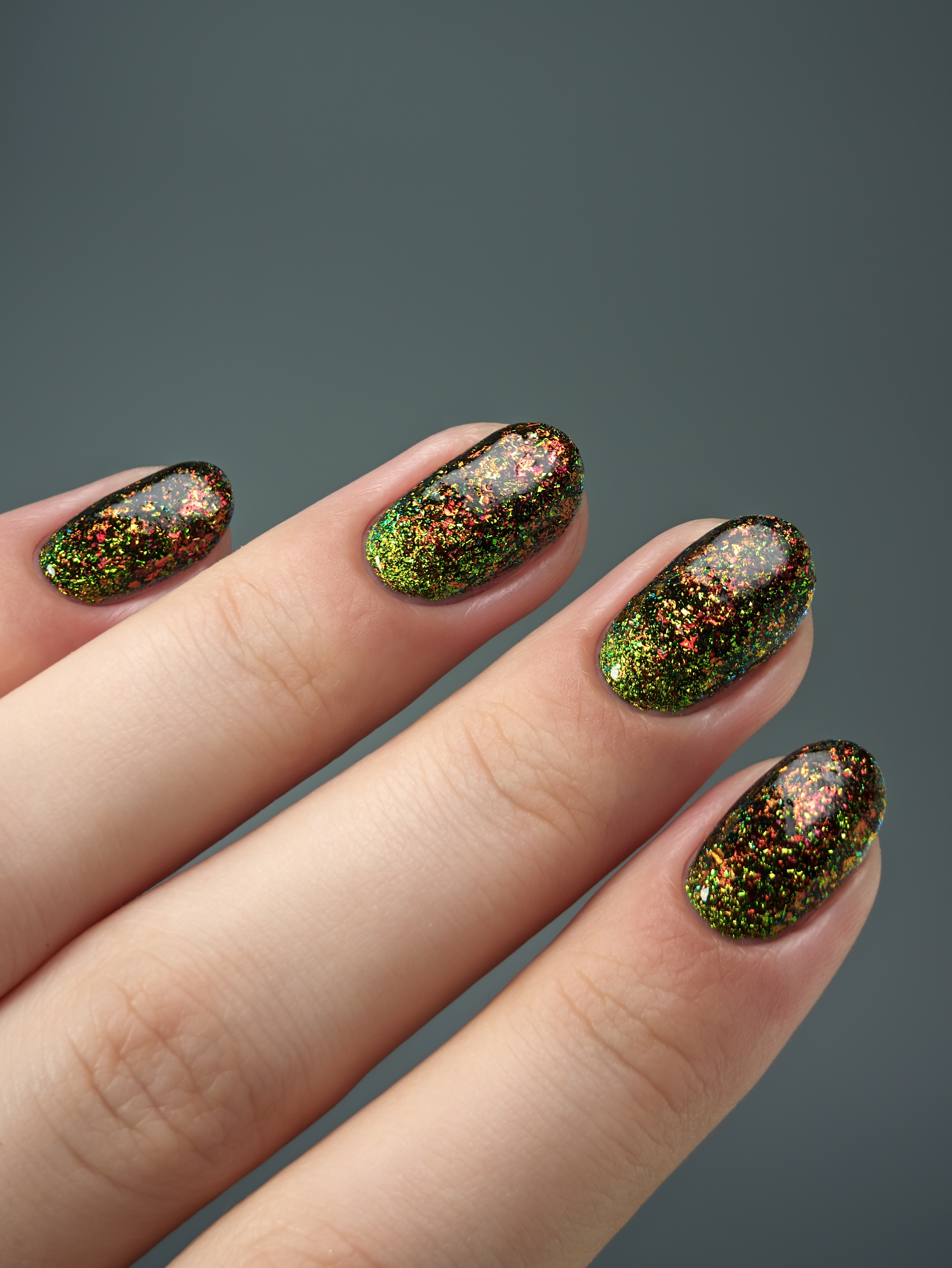 Салатово-зелено-голубые магнитные хлопья и красно-оранжево-золотая слюда