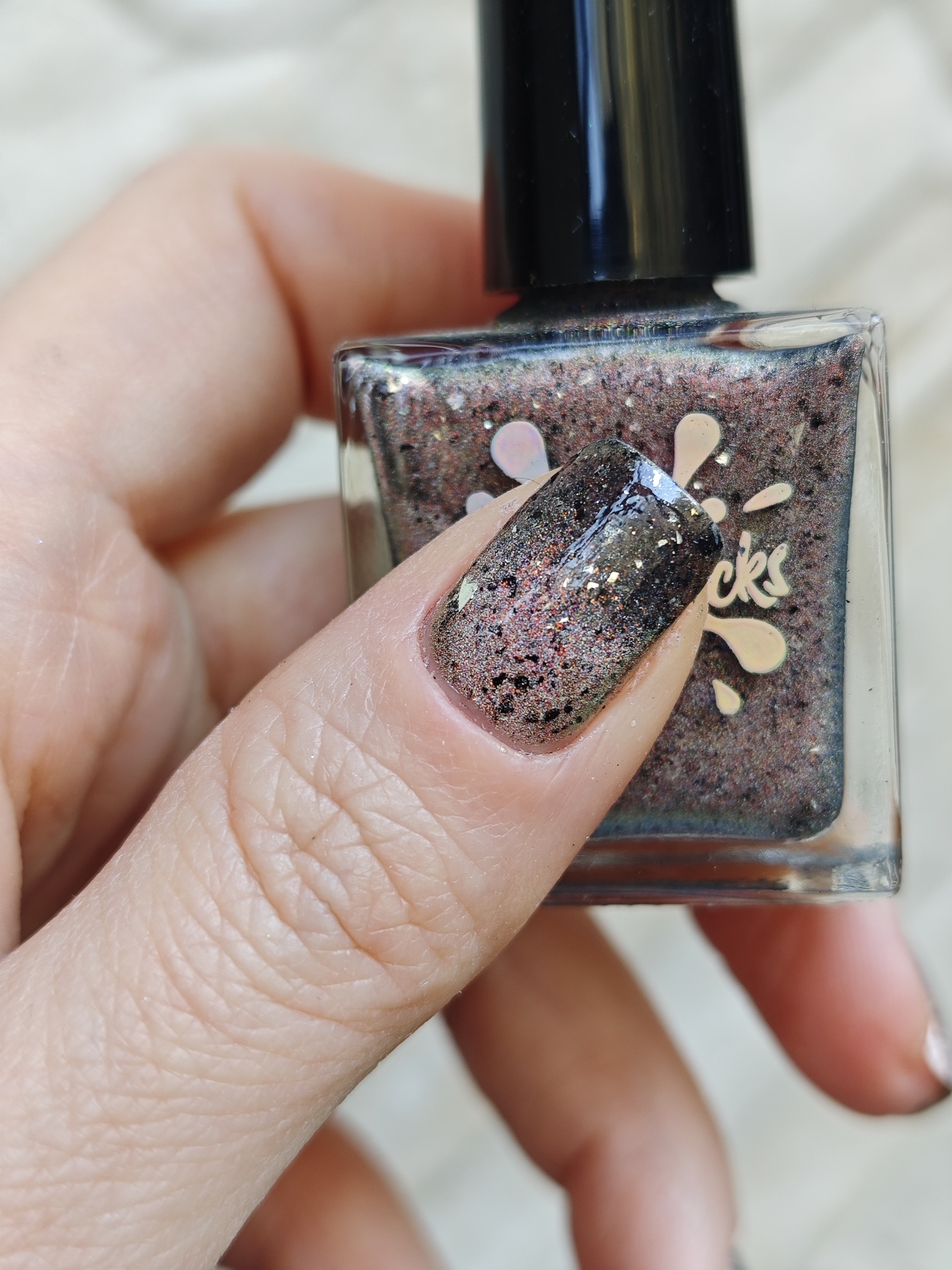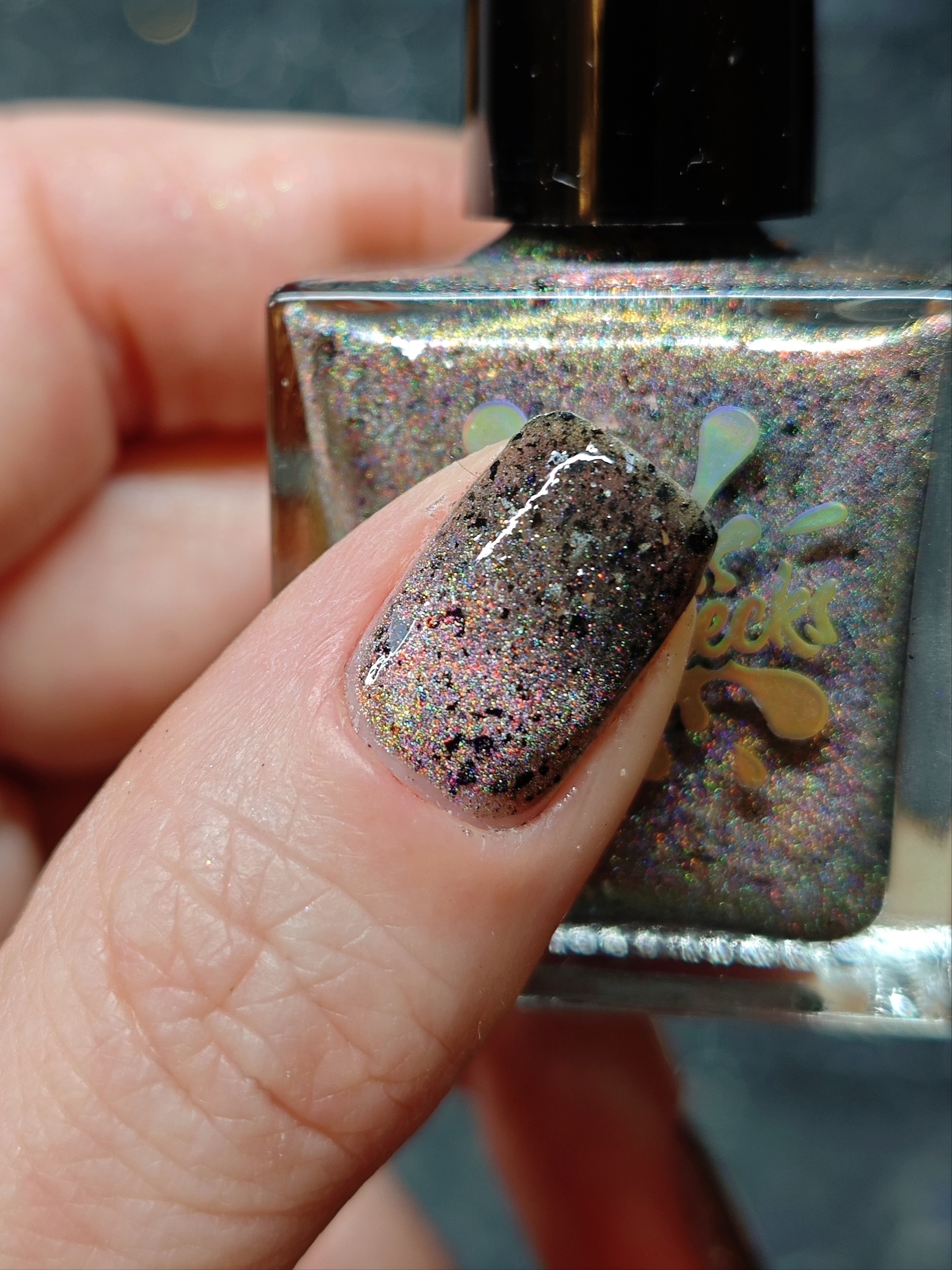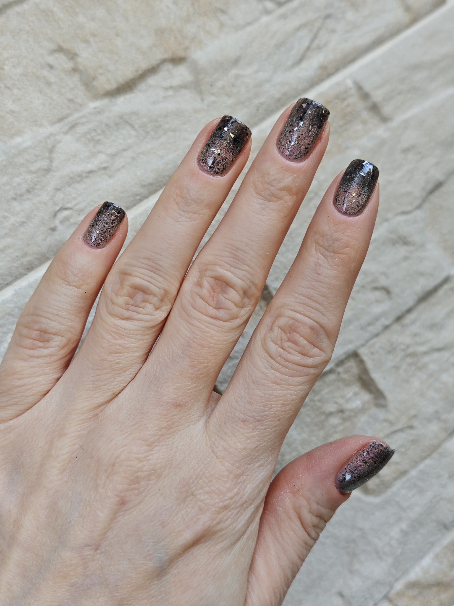 Голографический и оранжево-желтый магниты с черной металлизированной и серебристой слюдой в прозрачной базе.