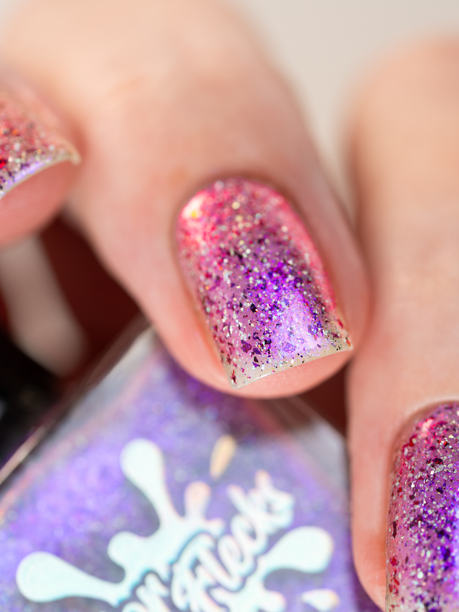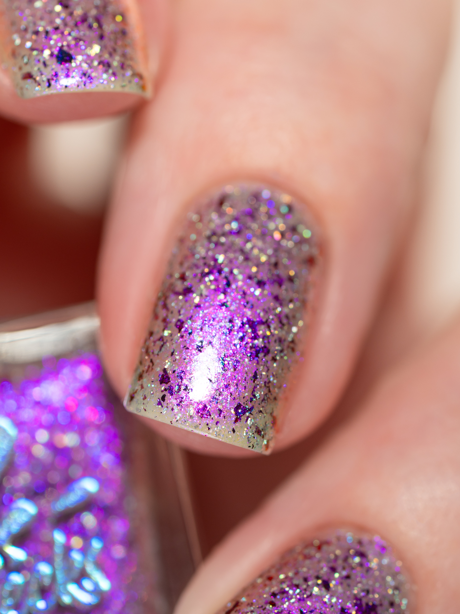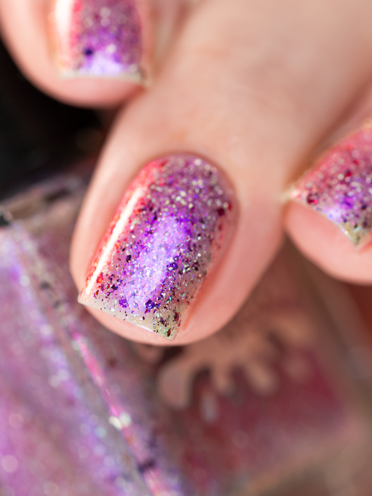 Крупная голокрошка, много фиолетово-красного шиммера и черно-красные хлопья в прозрачной базе.