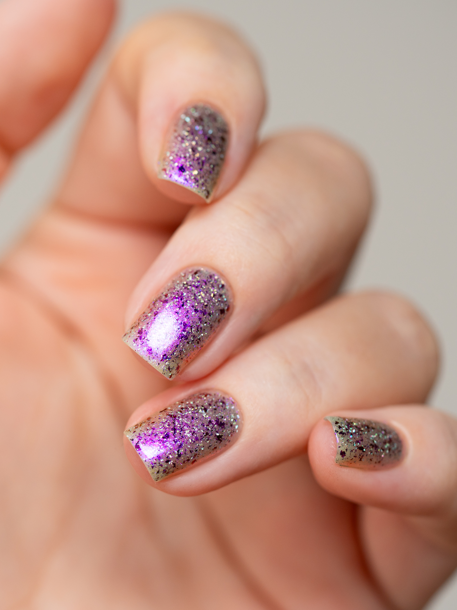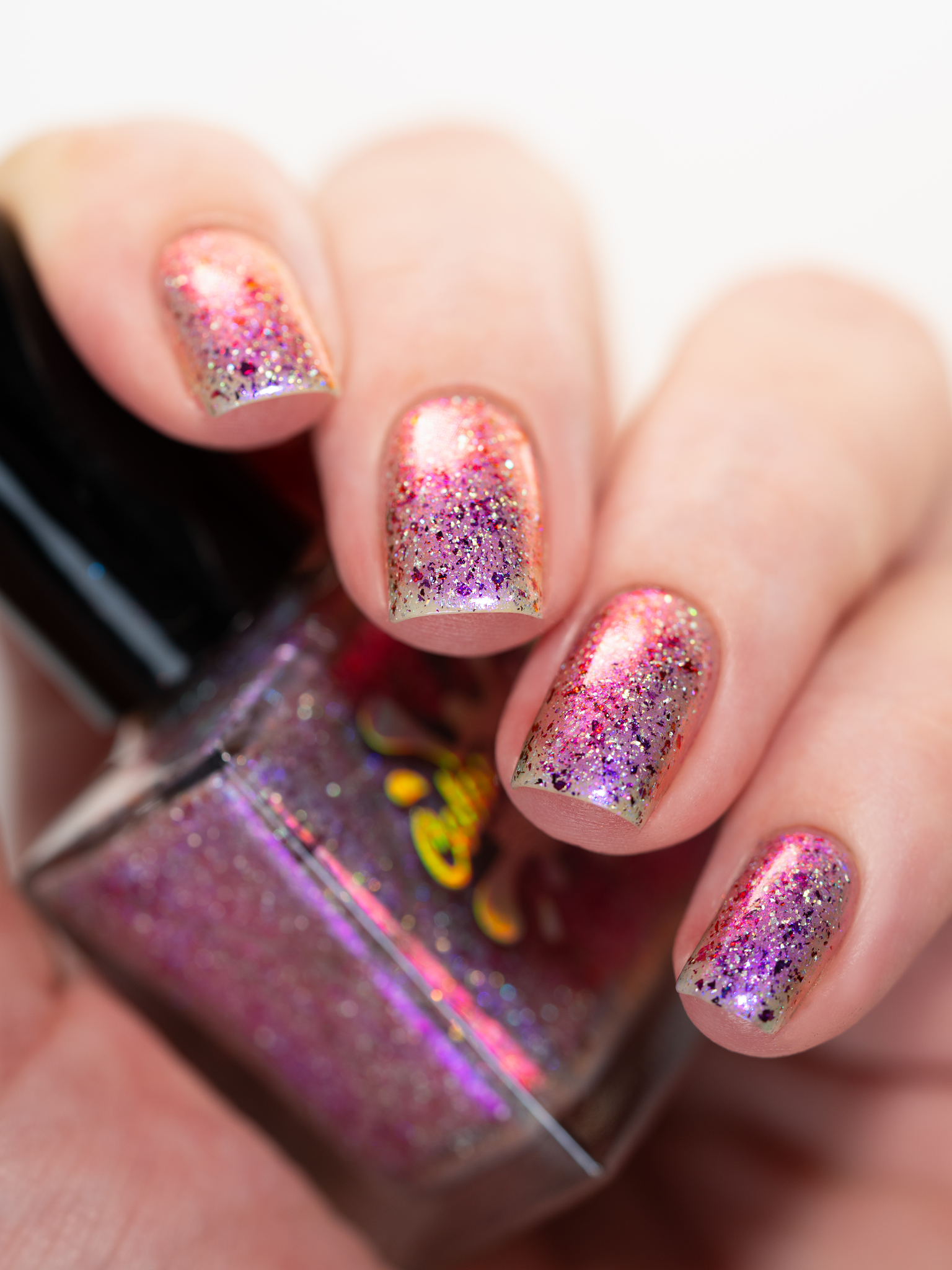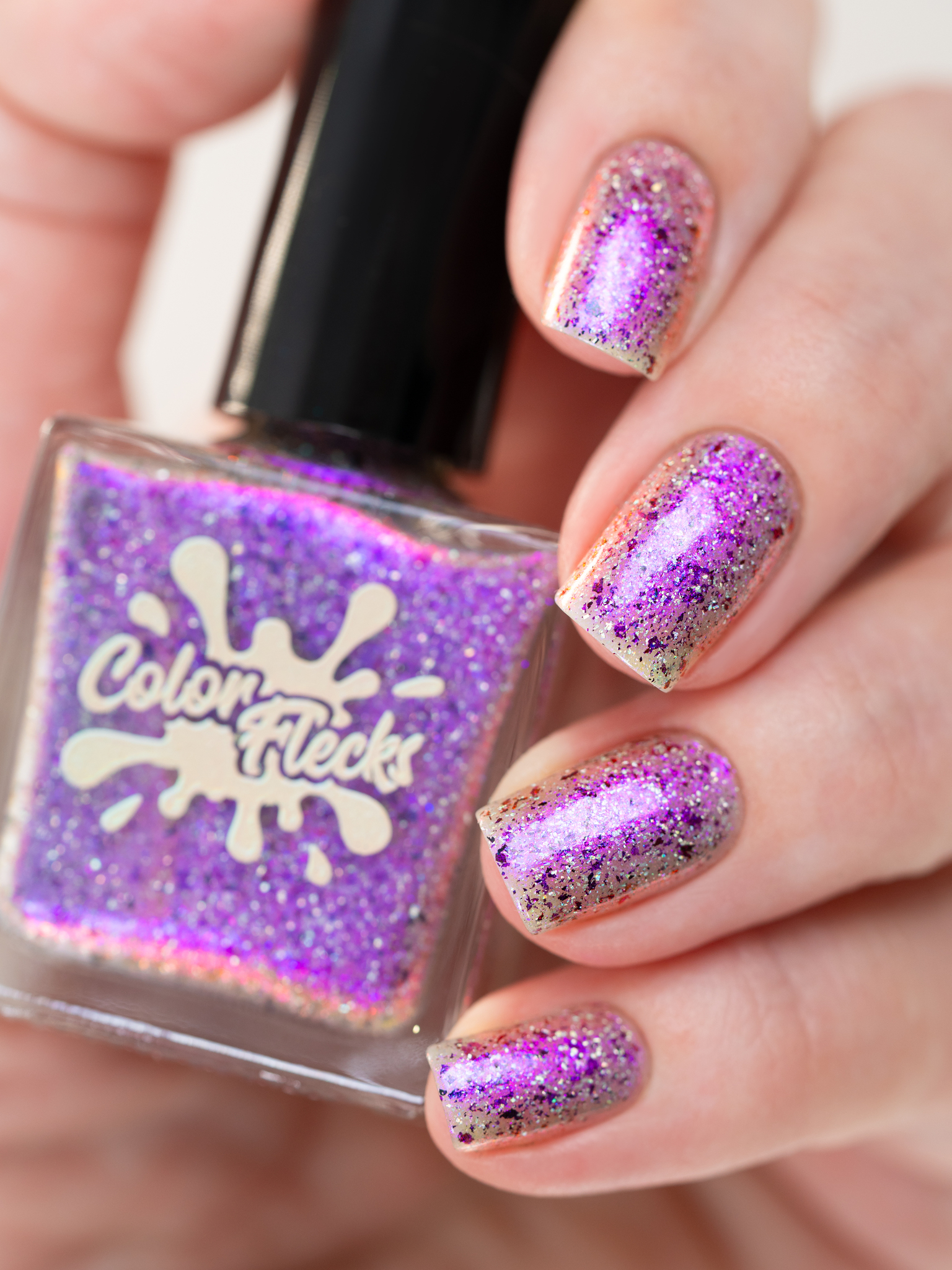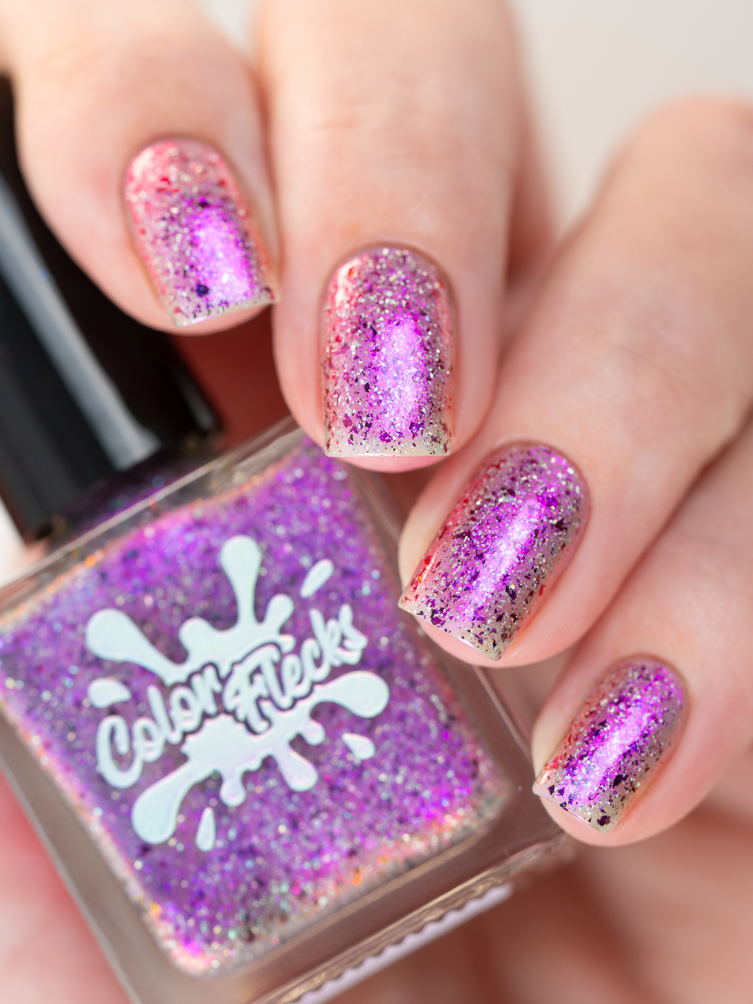 Крупная голокрошка, много фиолетово-красного шиммера и черно-красные хлопья в прозрачной базе.