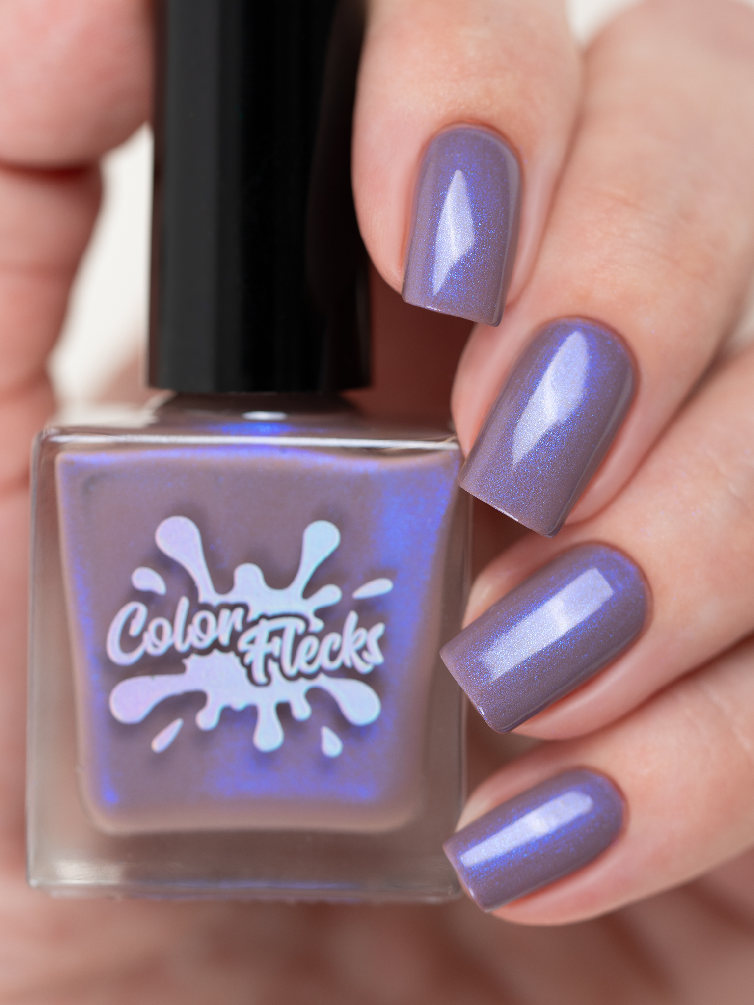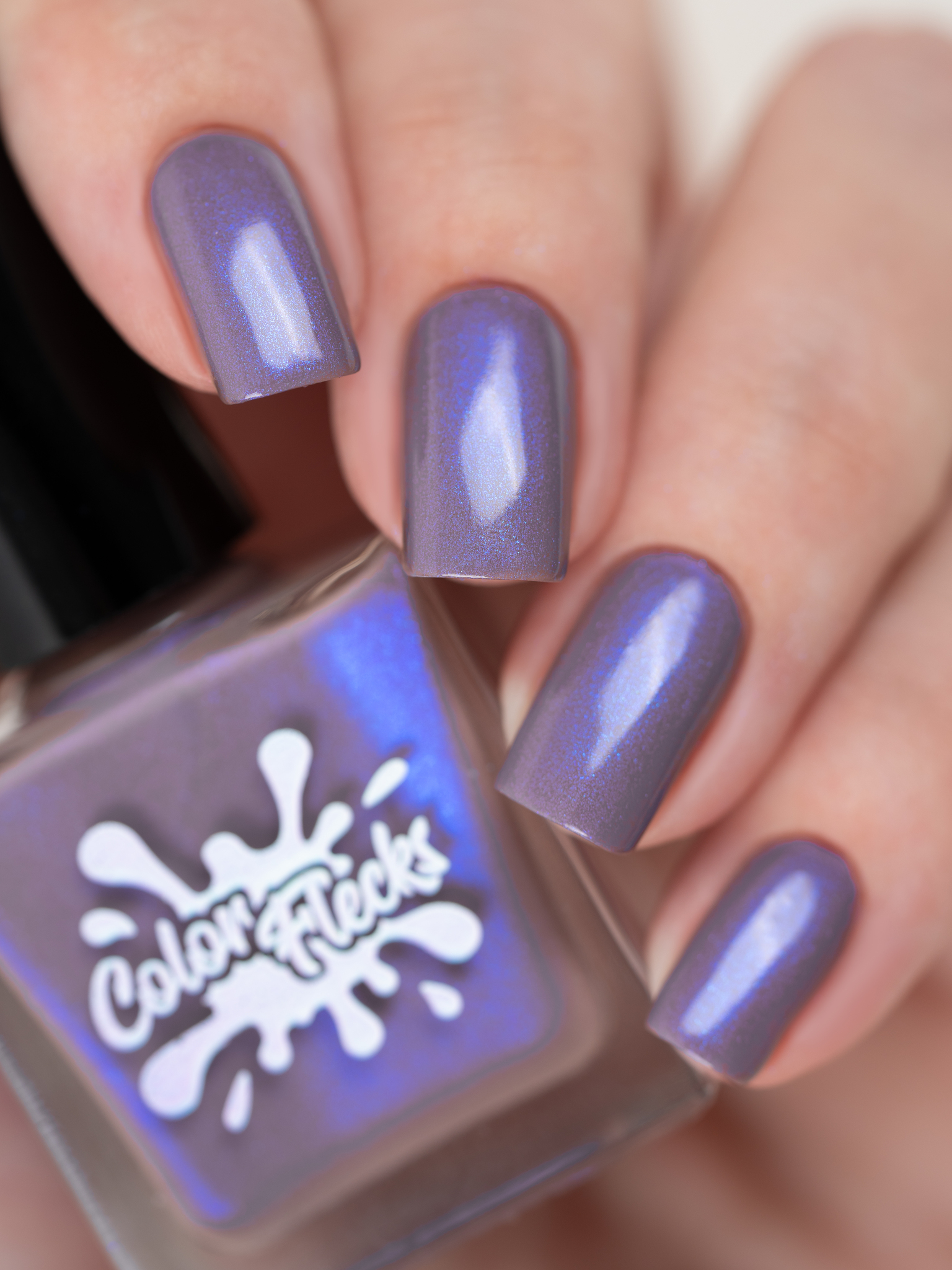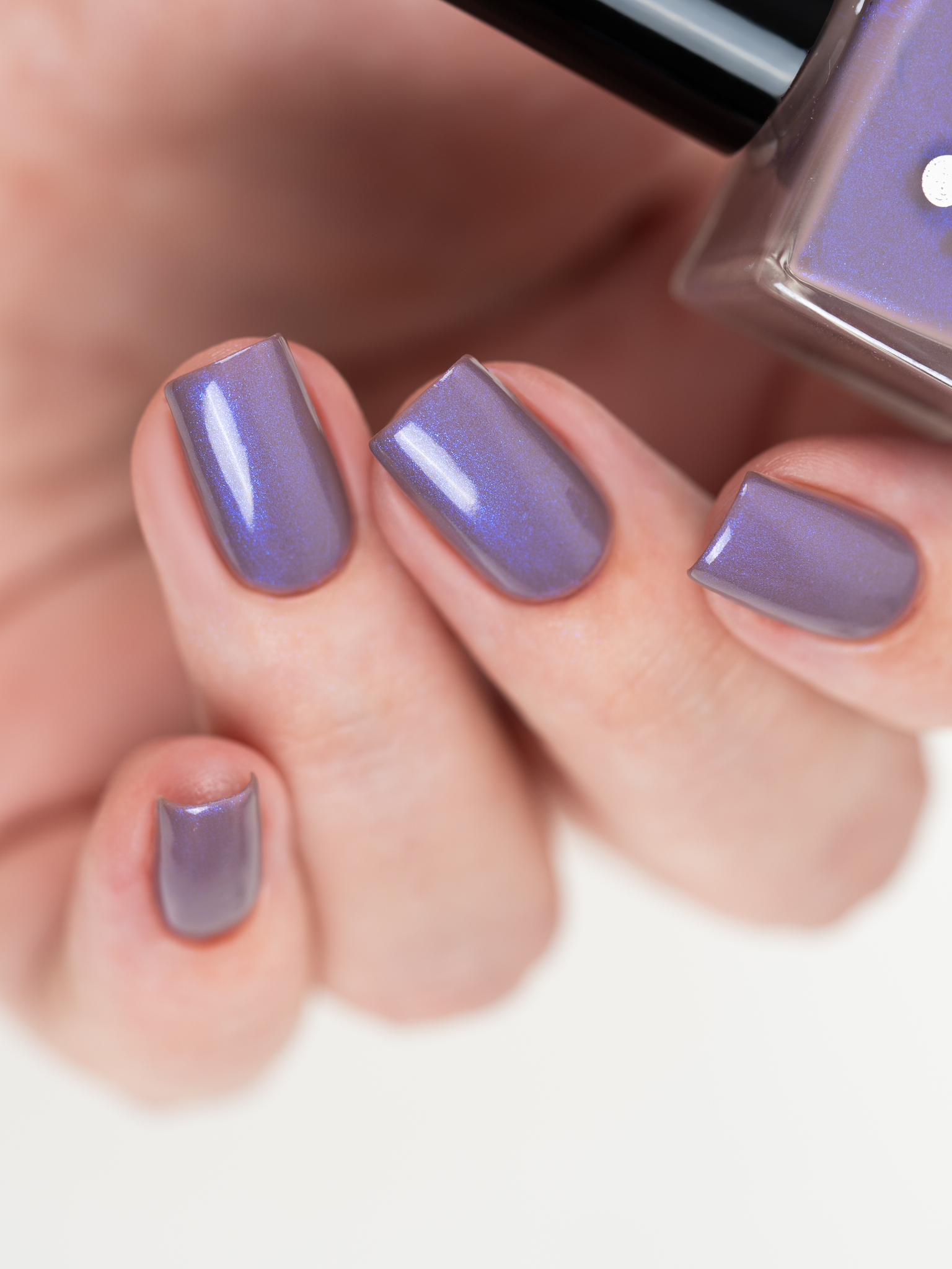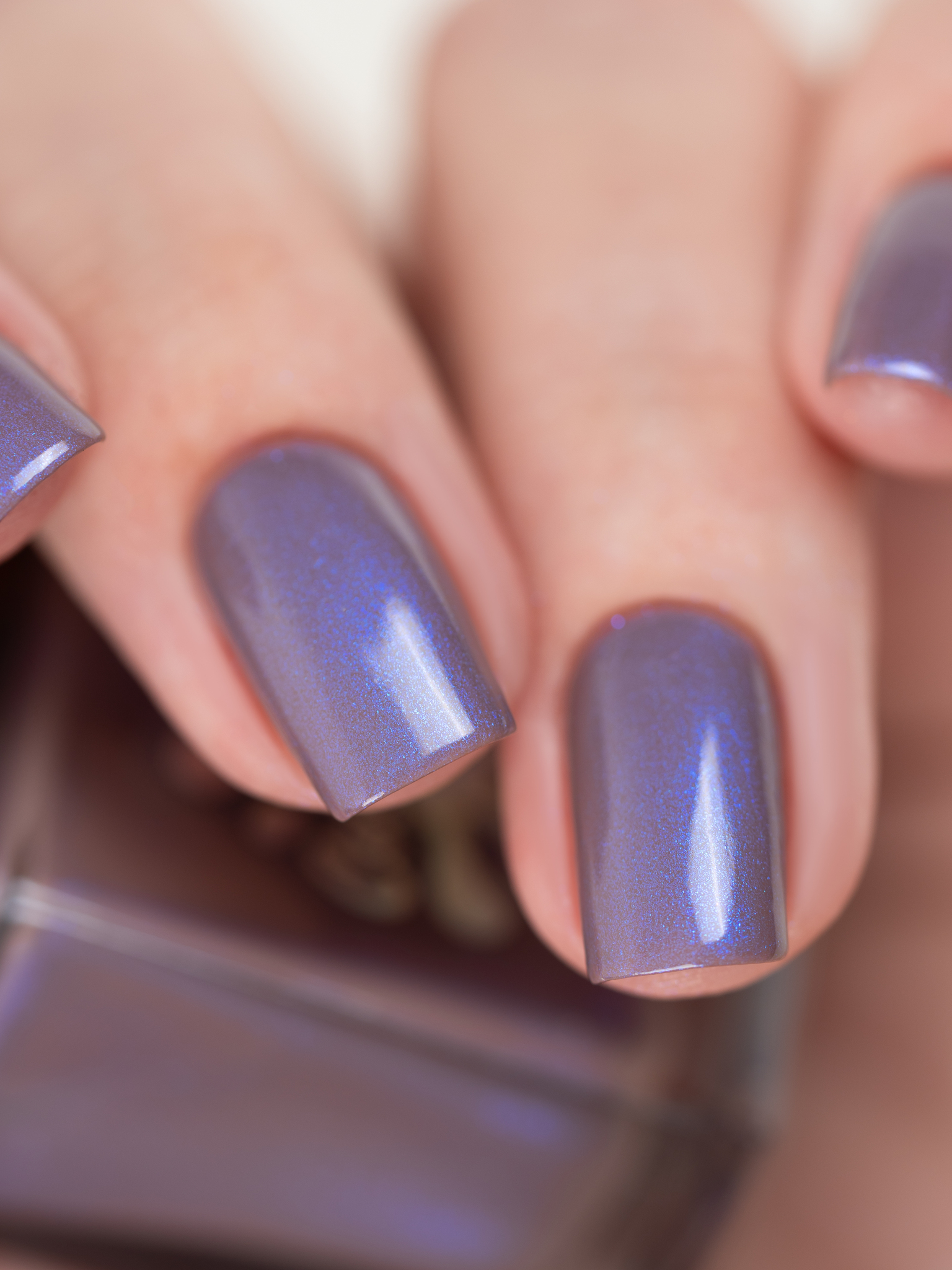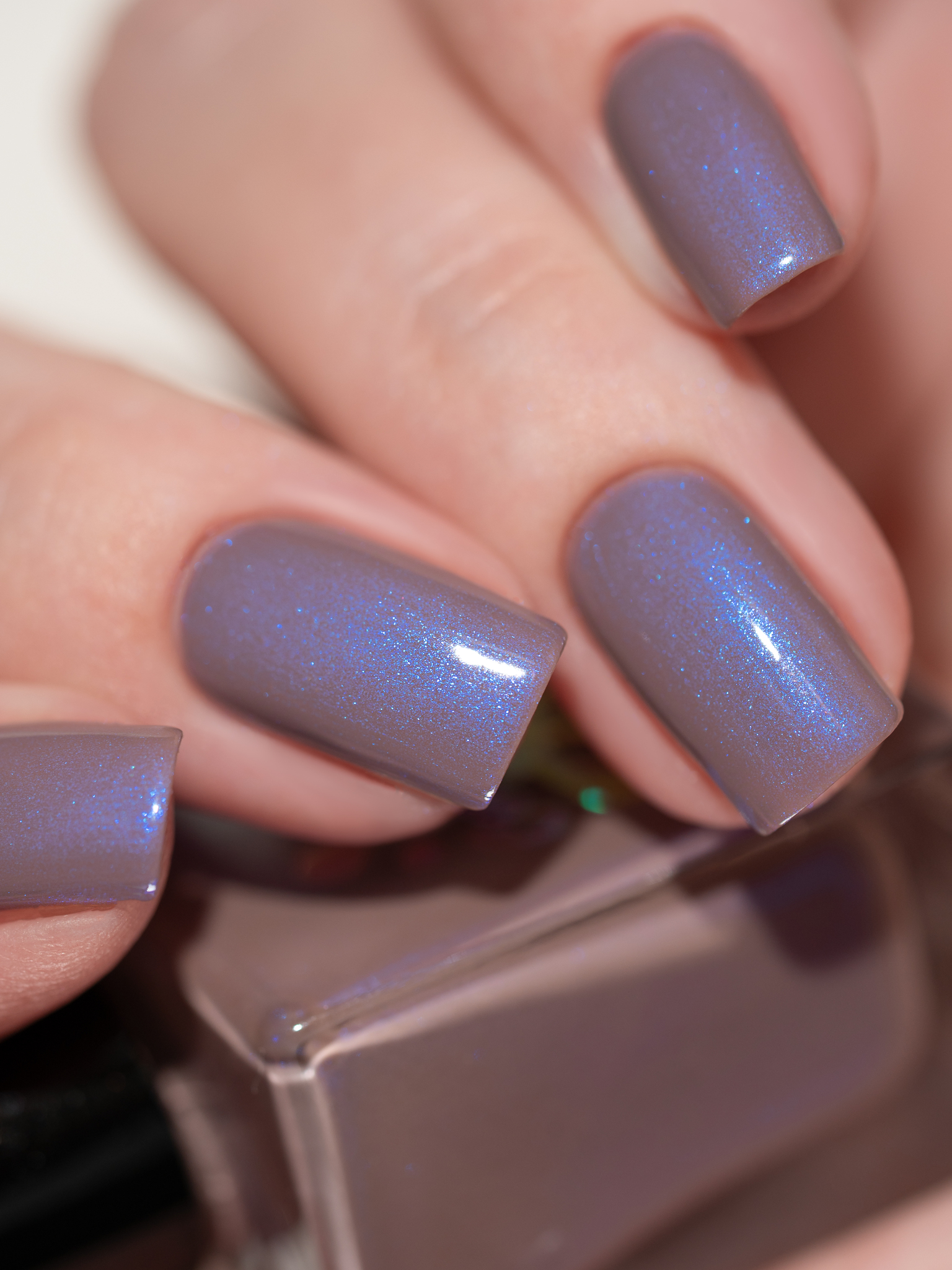 Серо-коричнево-лиловая база с синим шиммером. Очень светозависимый лак.