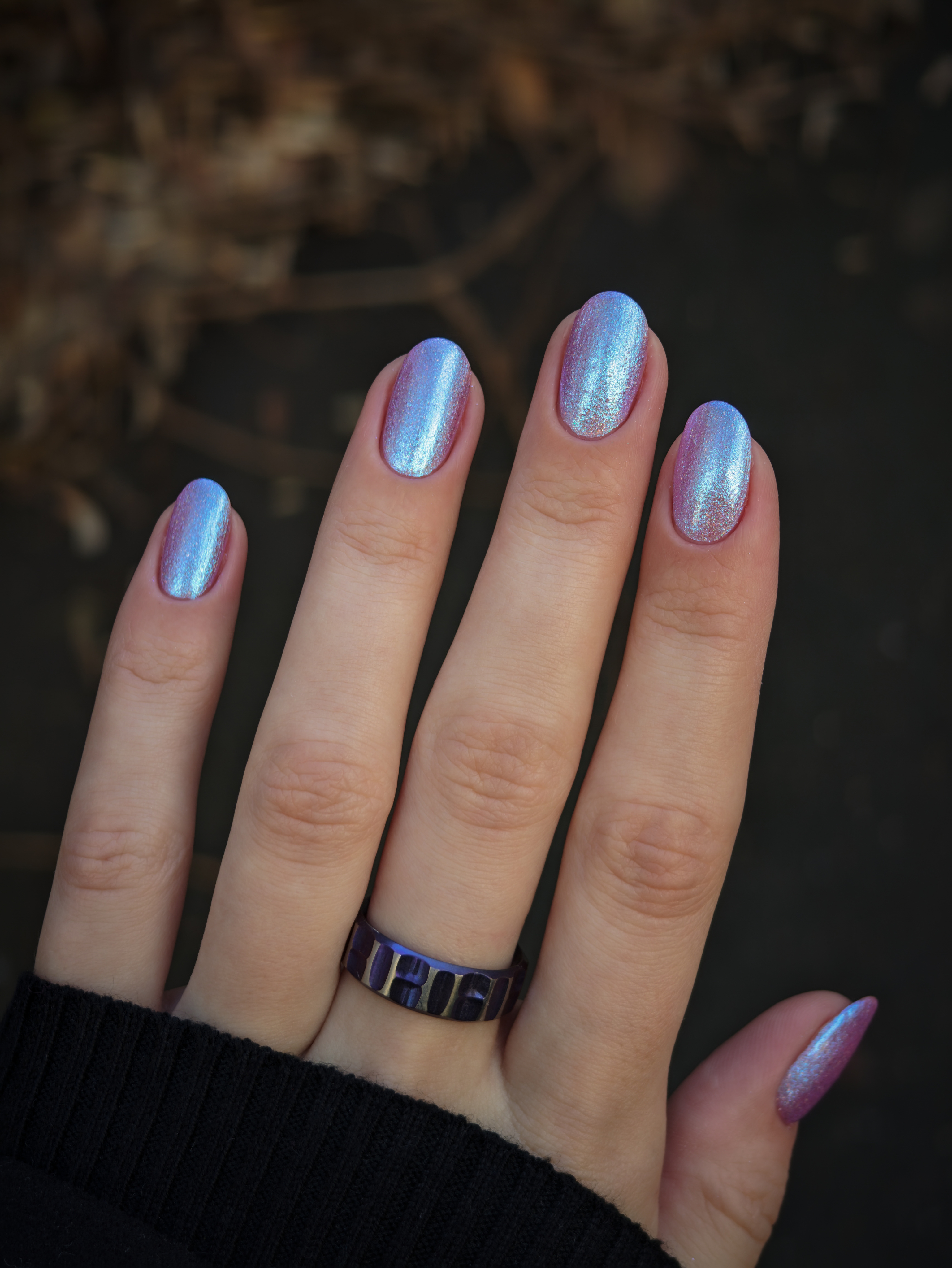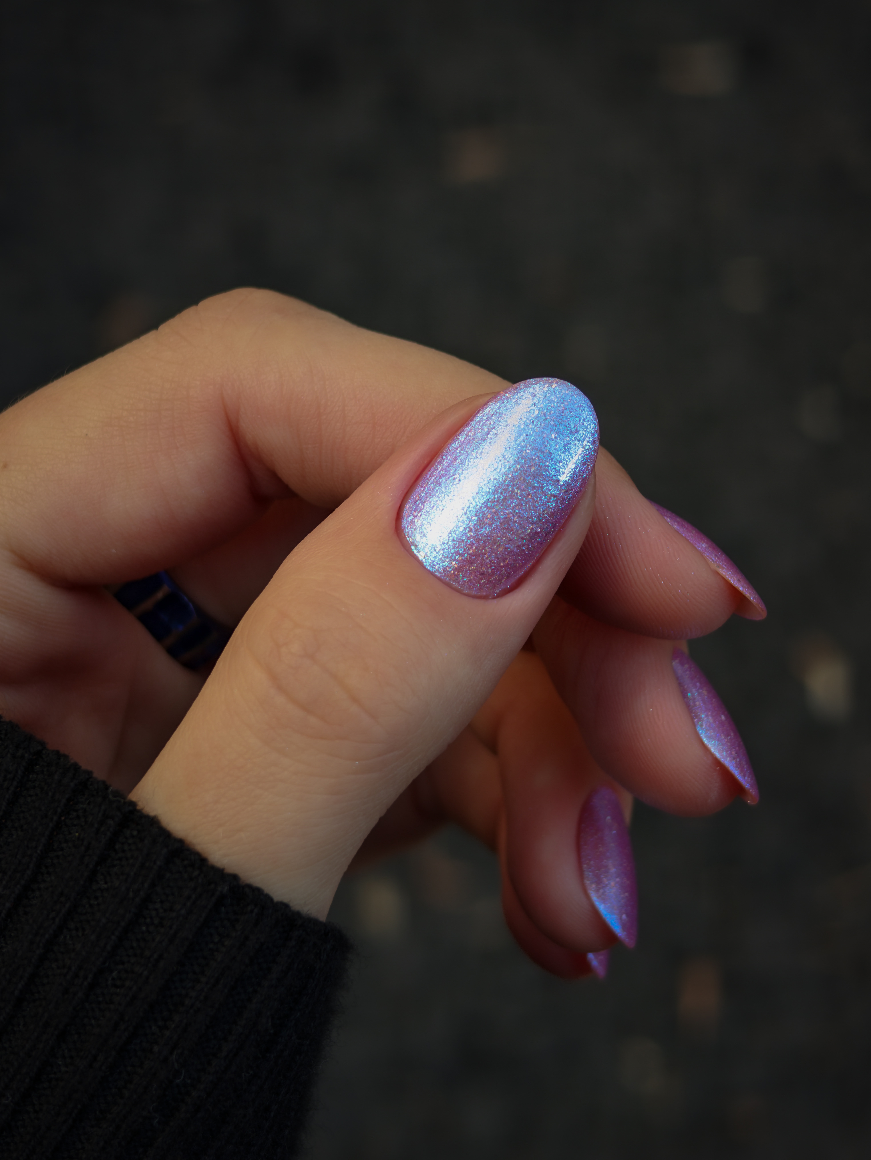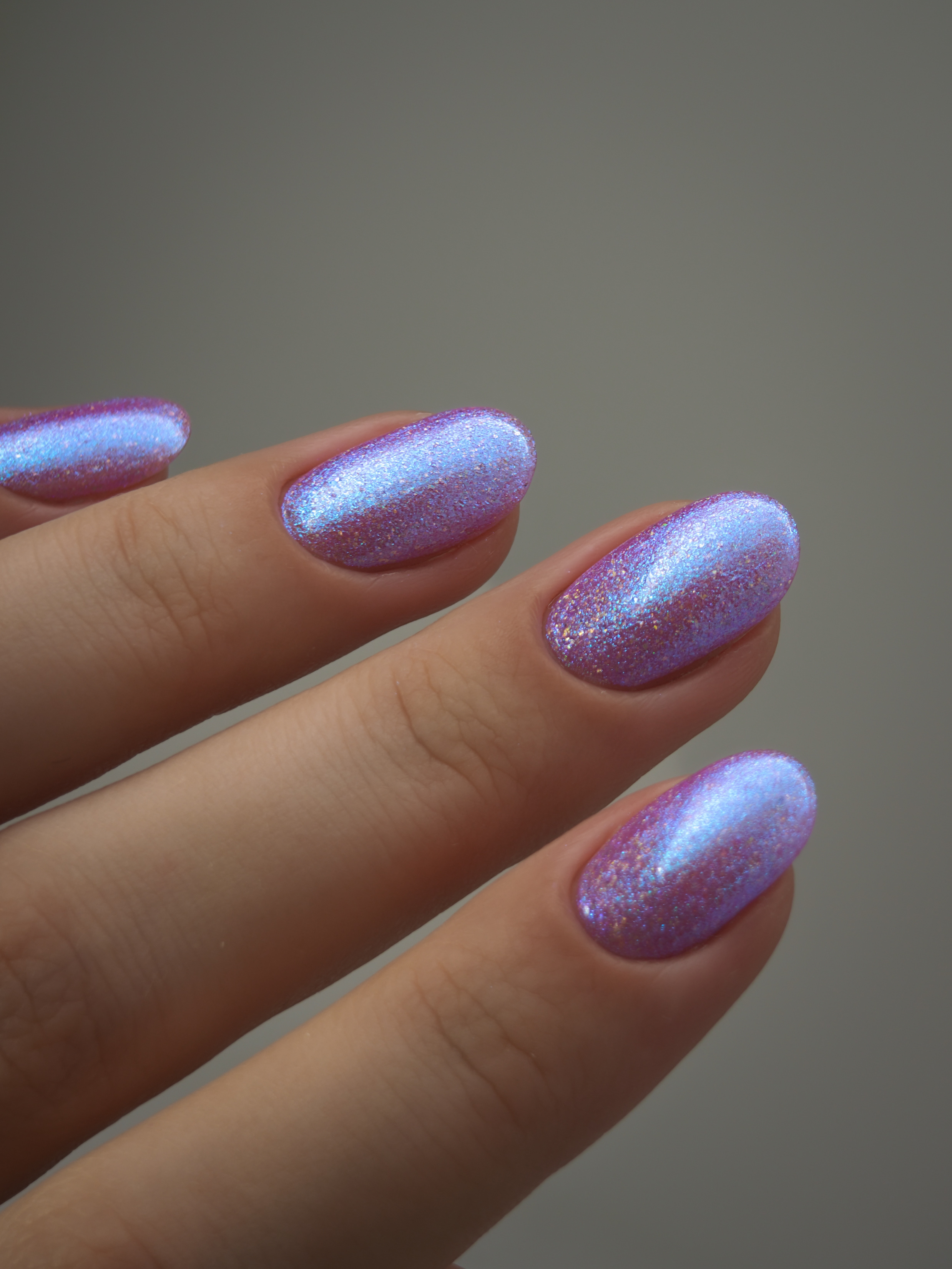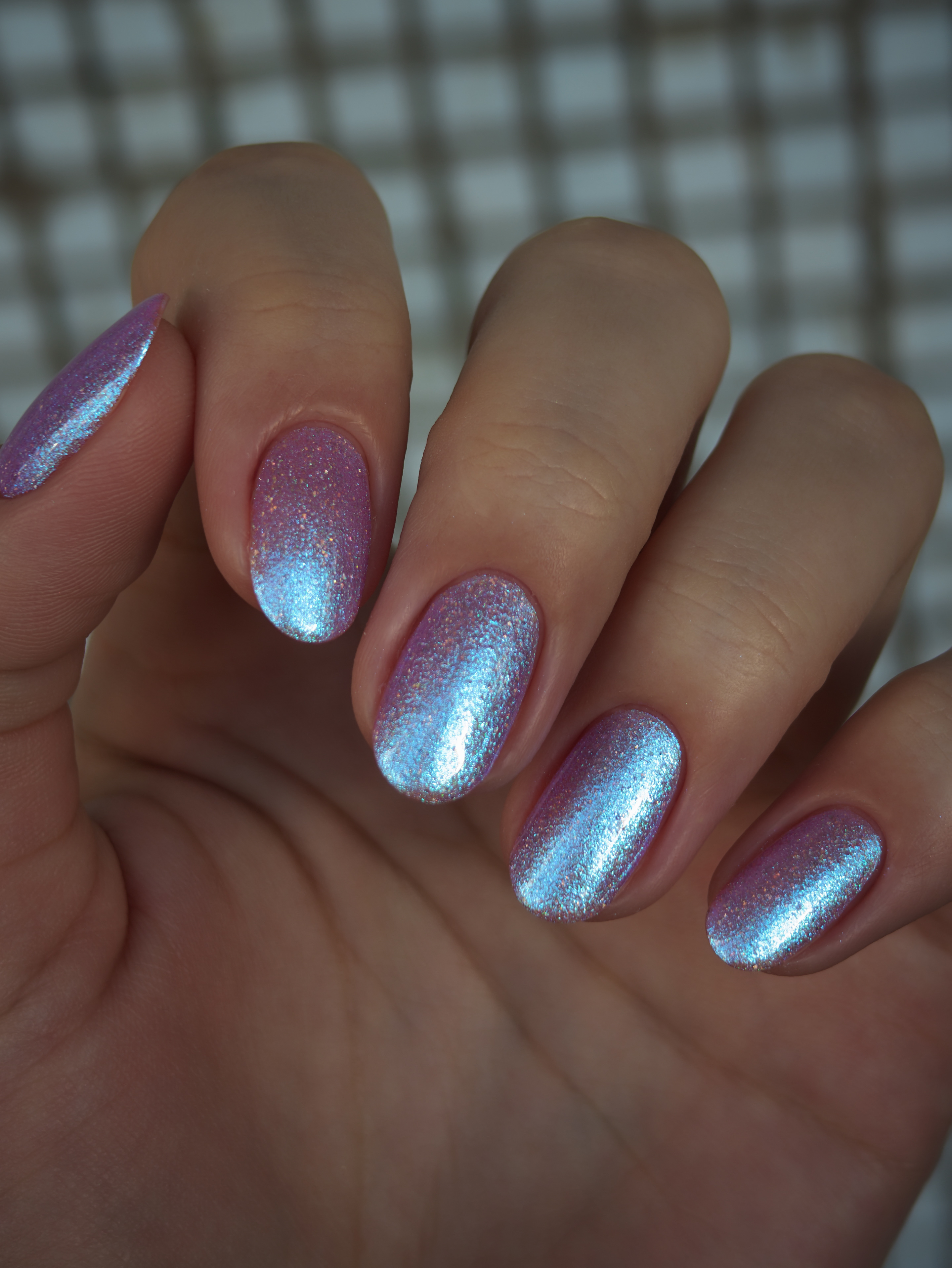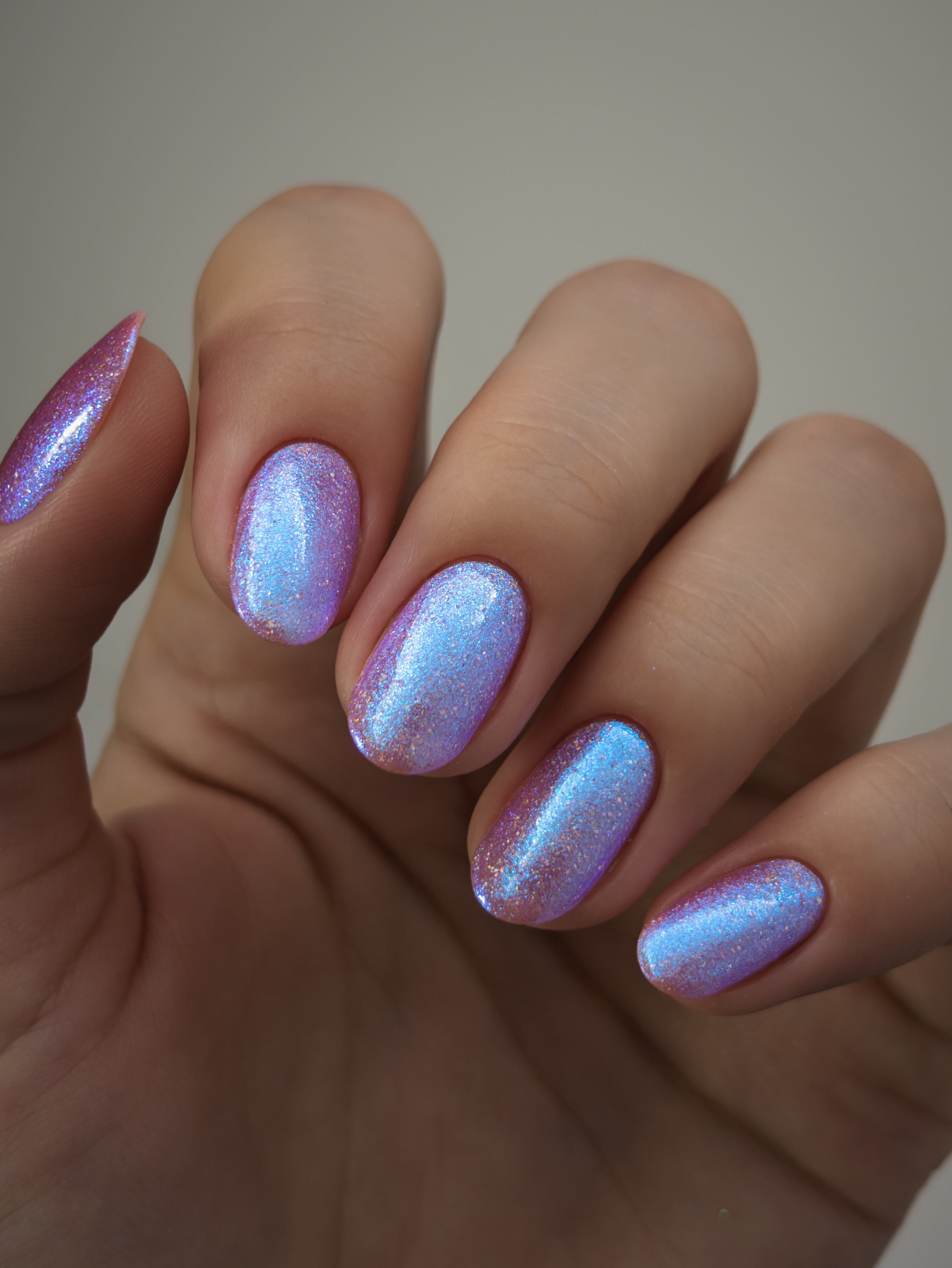 Крупные голохлопья и большое количество разного голубого шиммера в полупрозрачной розовой базе
