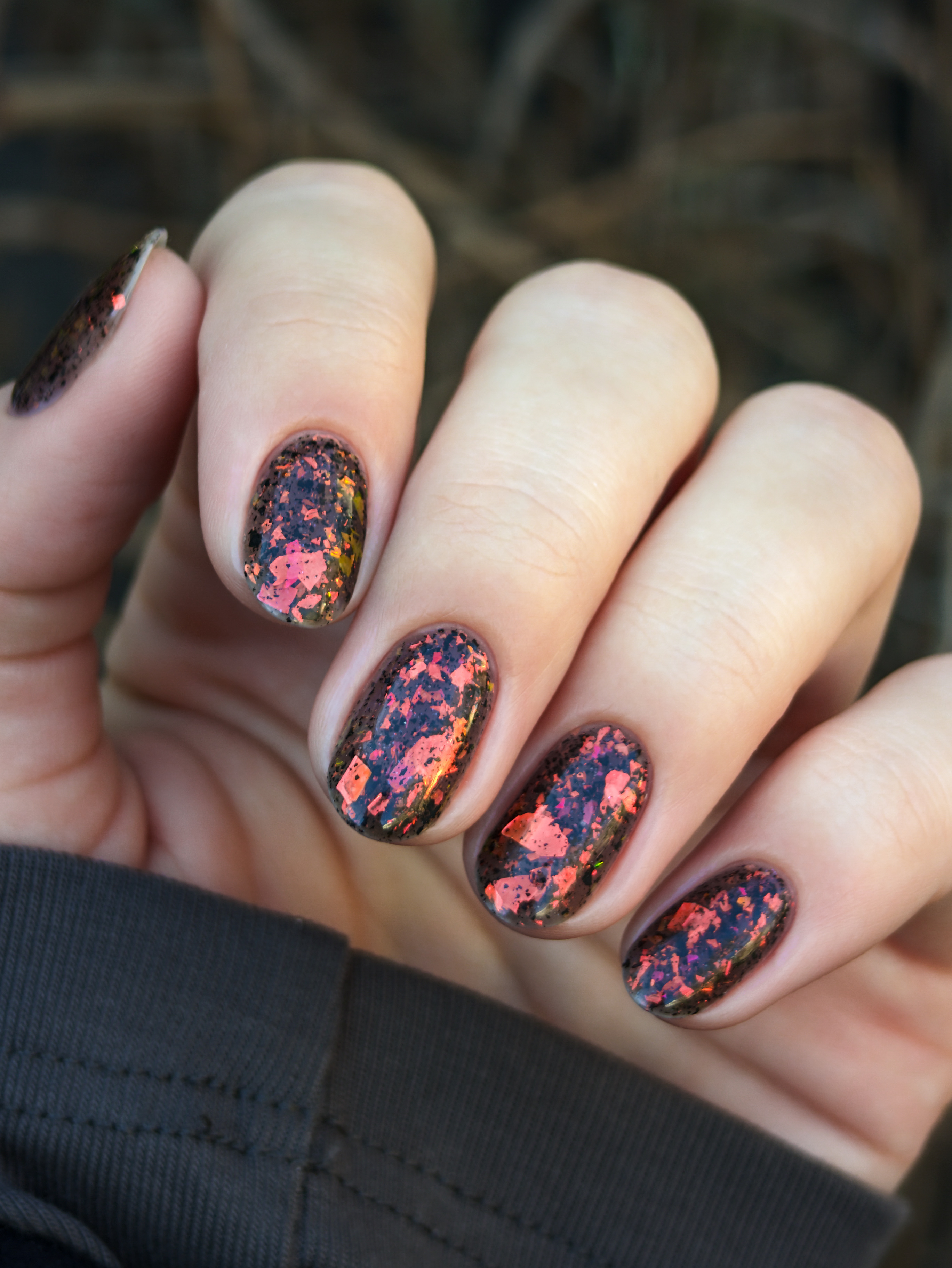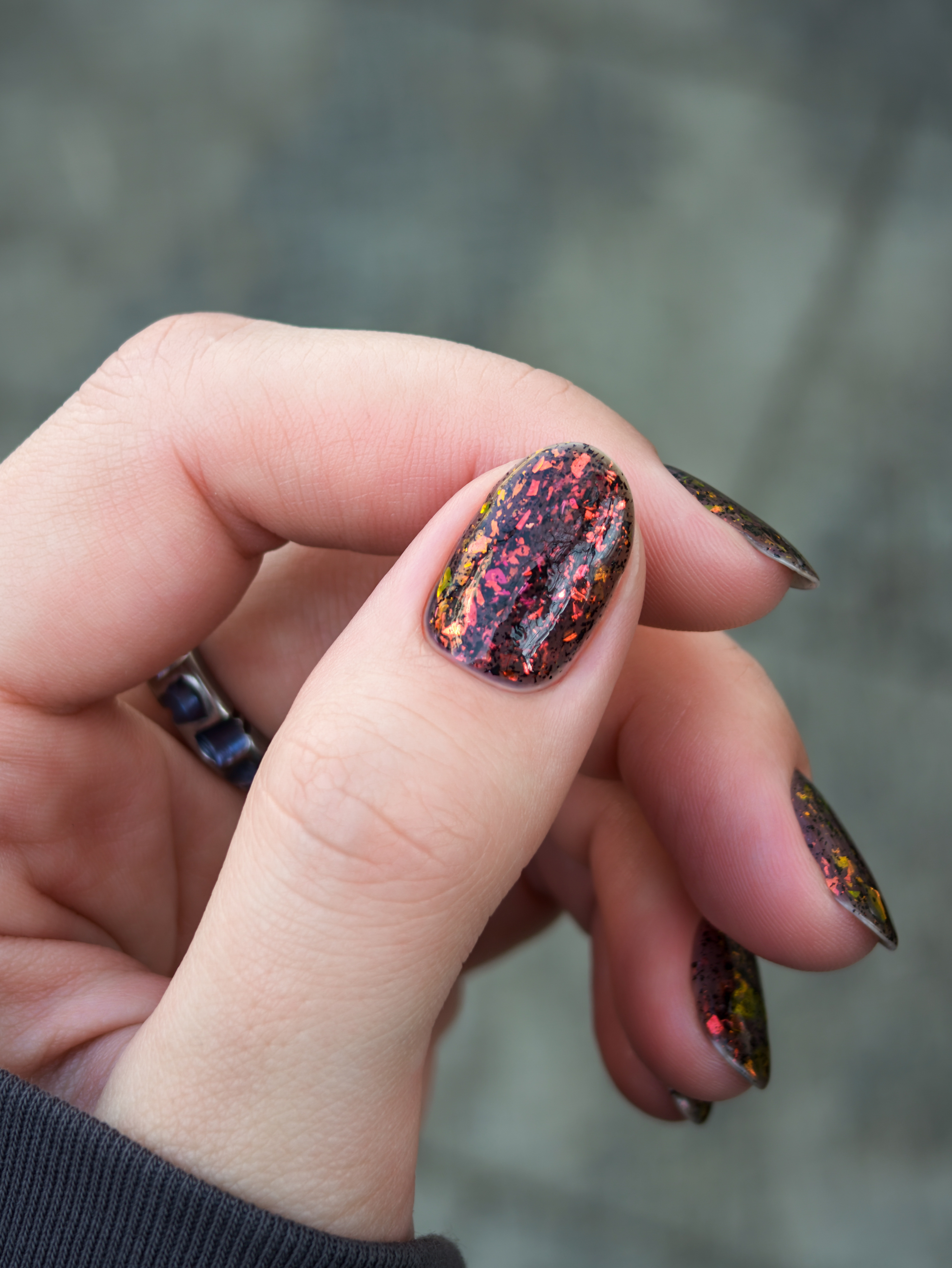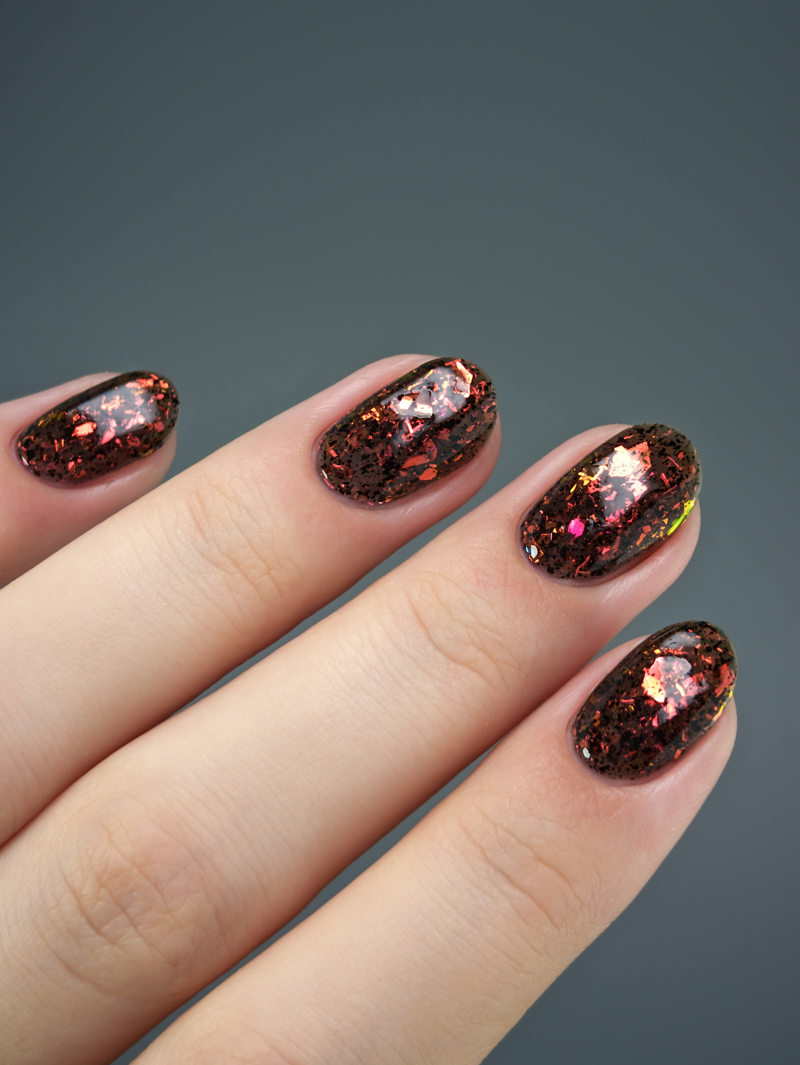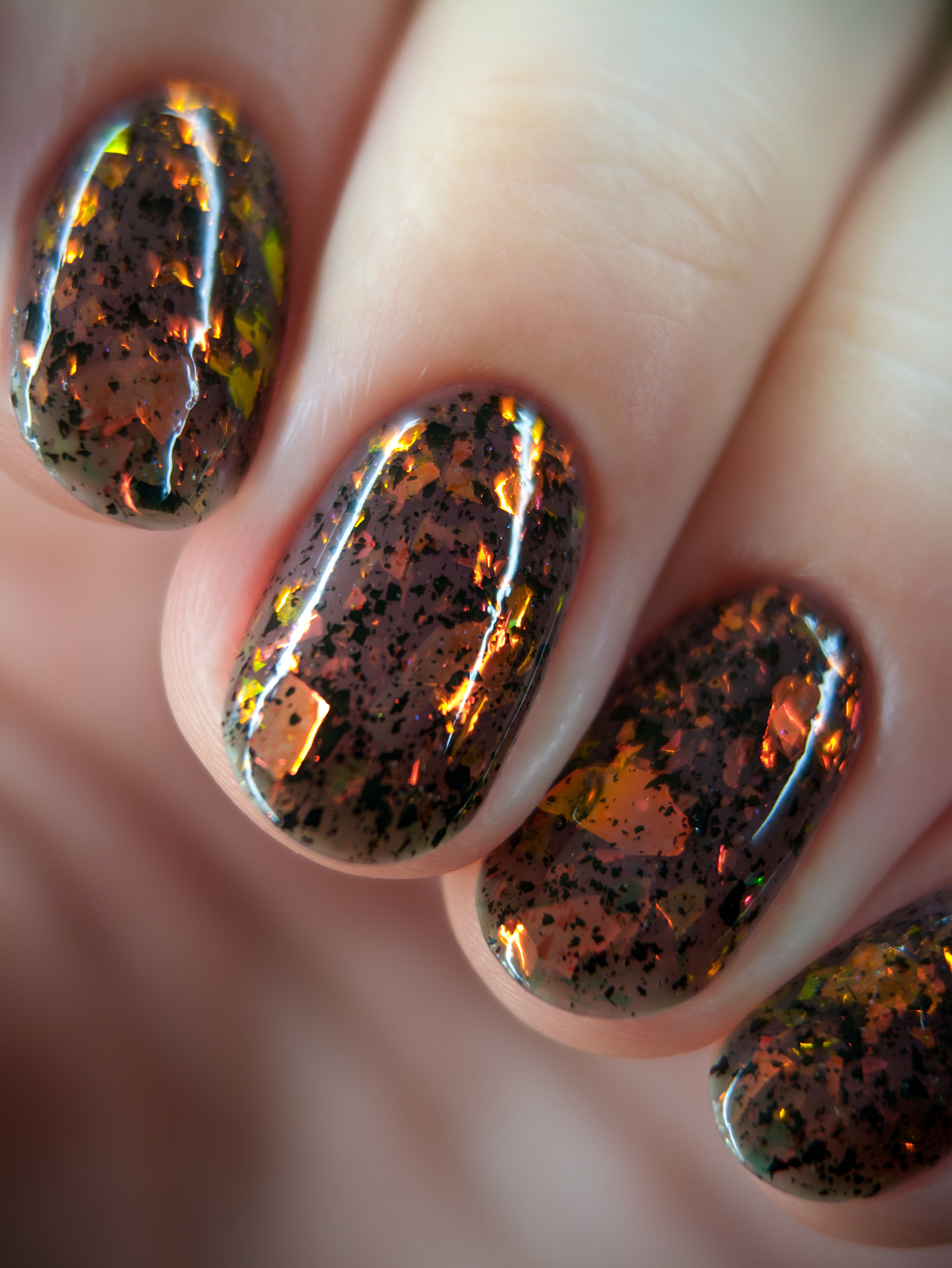Красно-оранжево-салатовая и черная металлизированная слюда в неплотной черной базе.