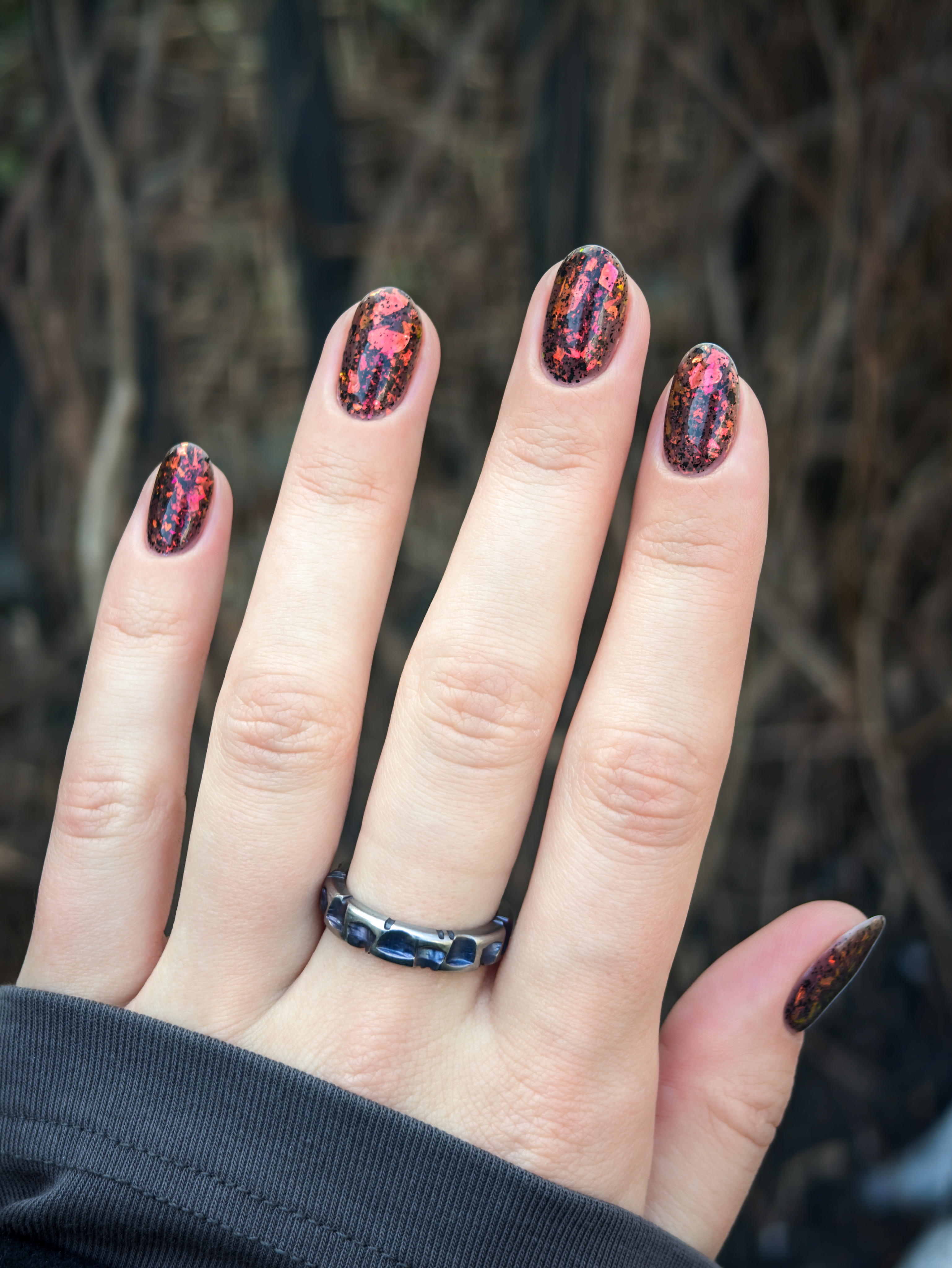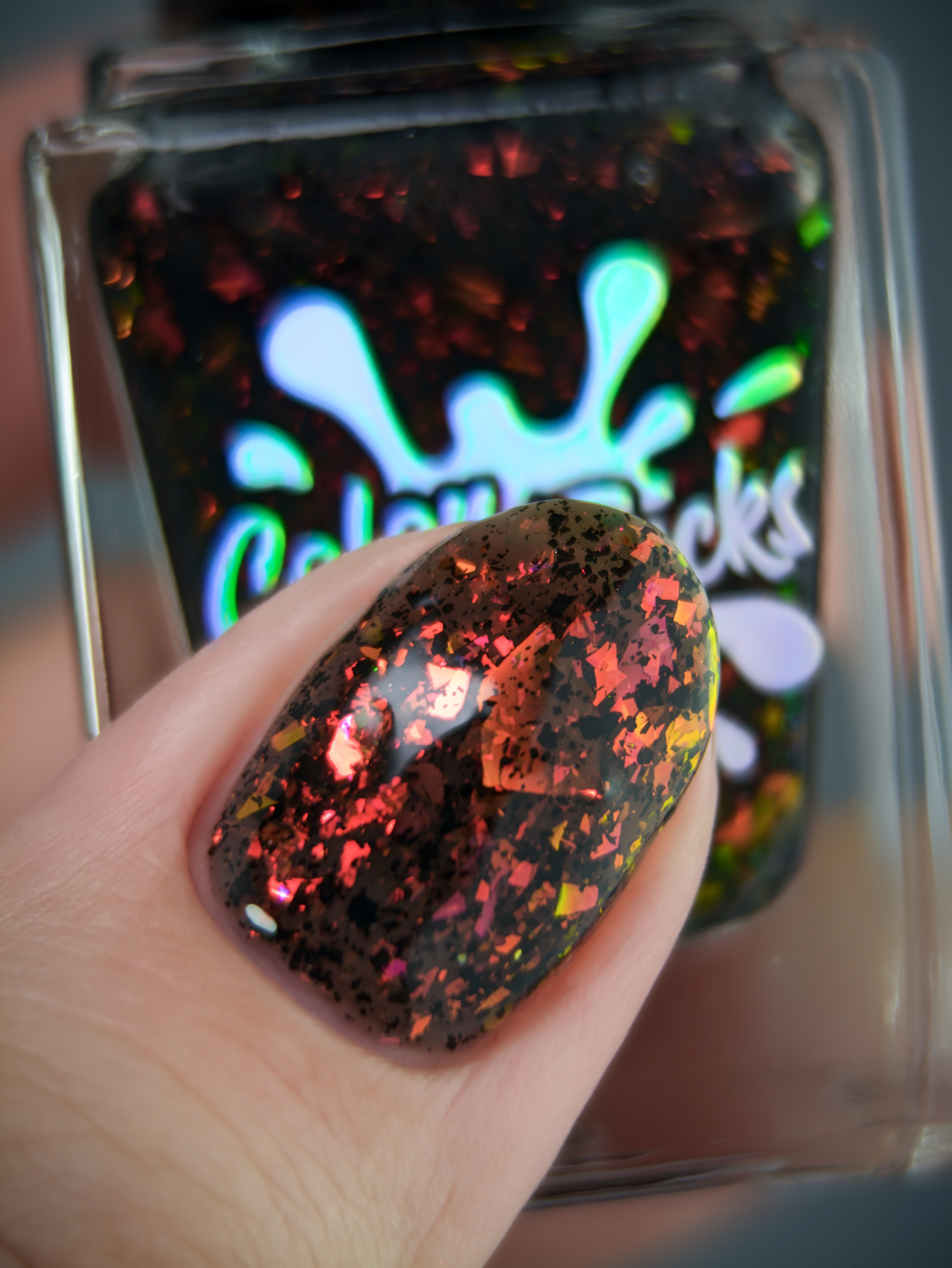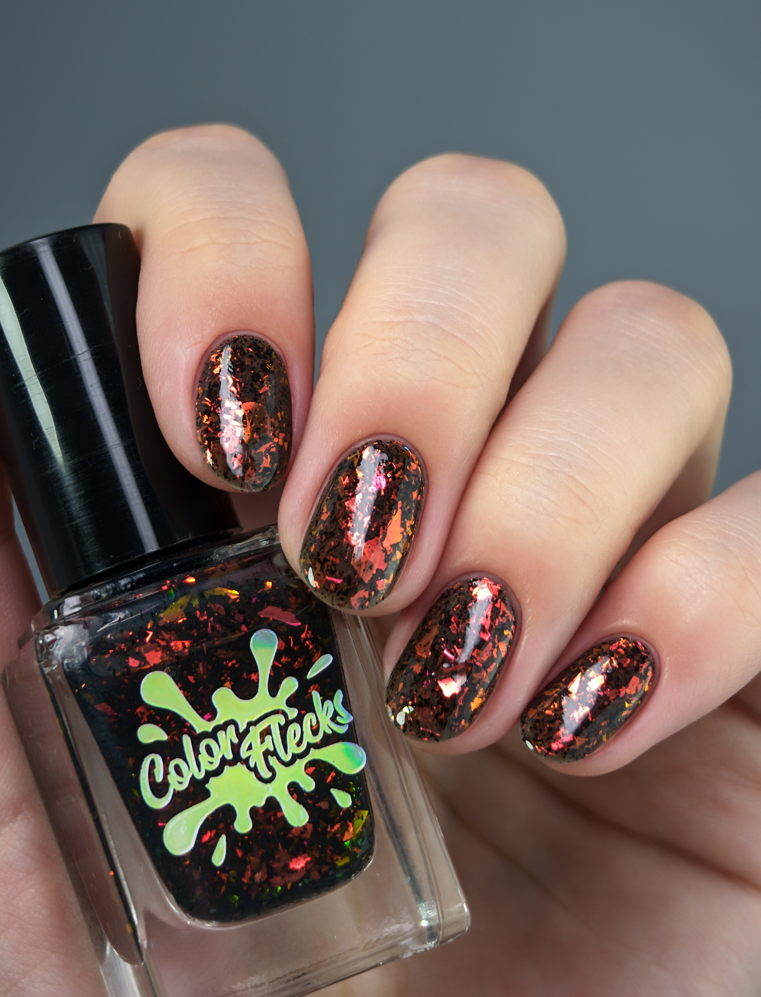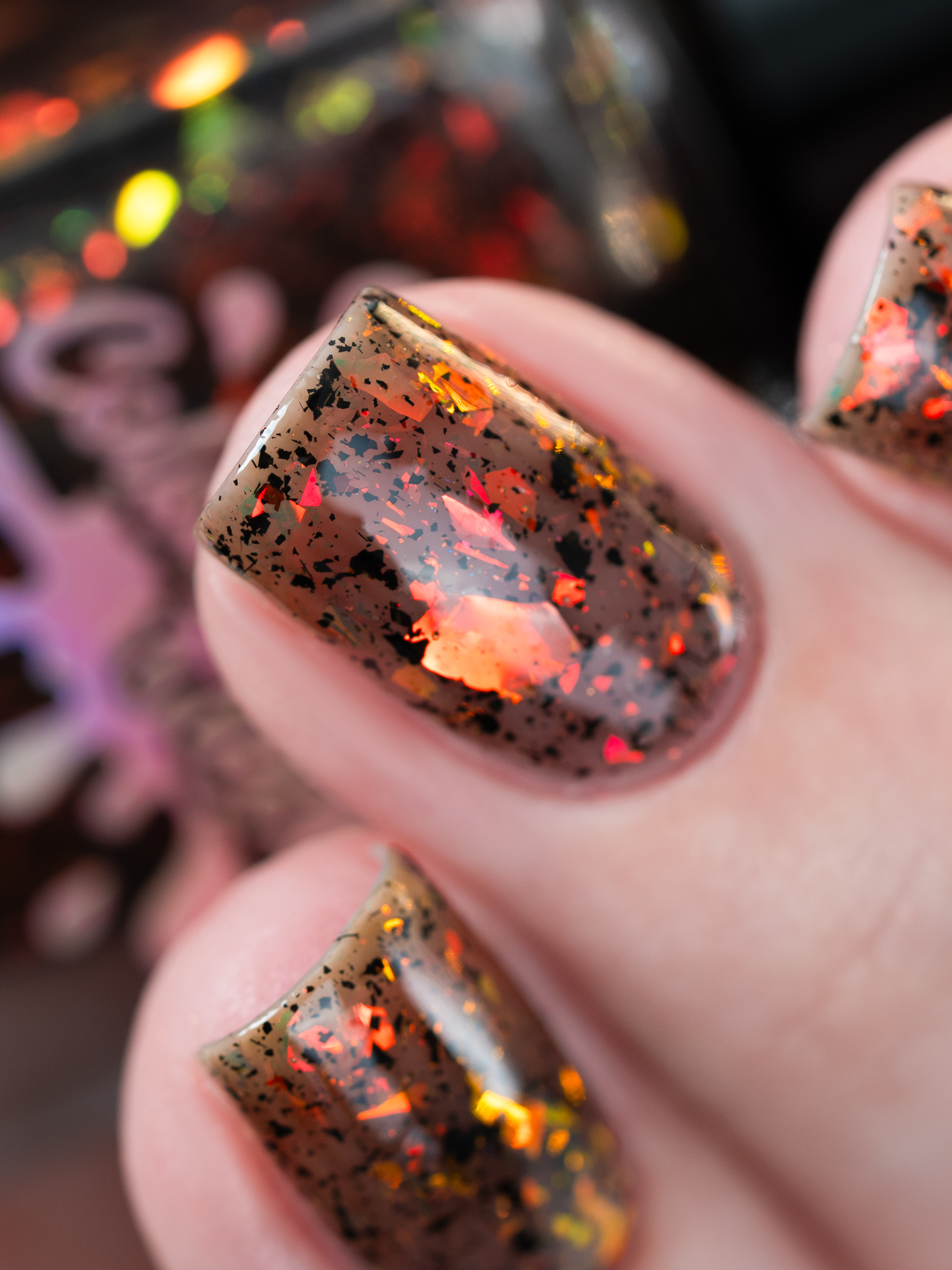Красно-оранжево-салатовая и черная металлизированная слюда в неплотной черной базе.